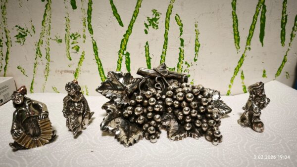 Zestaw Kiści winogrona i figurki z Włoch z Florencji. Przedmioty posiadają próbę, i sygnture producenta to doskonałe dodatki do każdego wnętrza. , nadają eleganckiego i stylowego wyglądu. Idealne jako prezent...