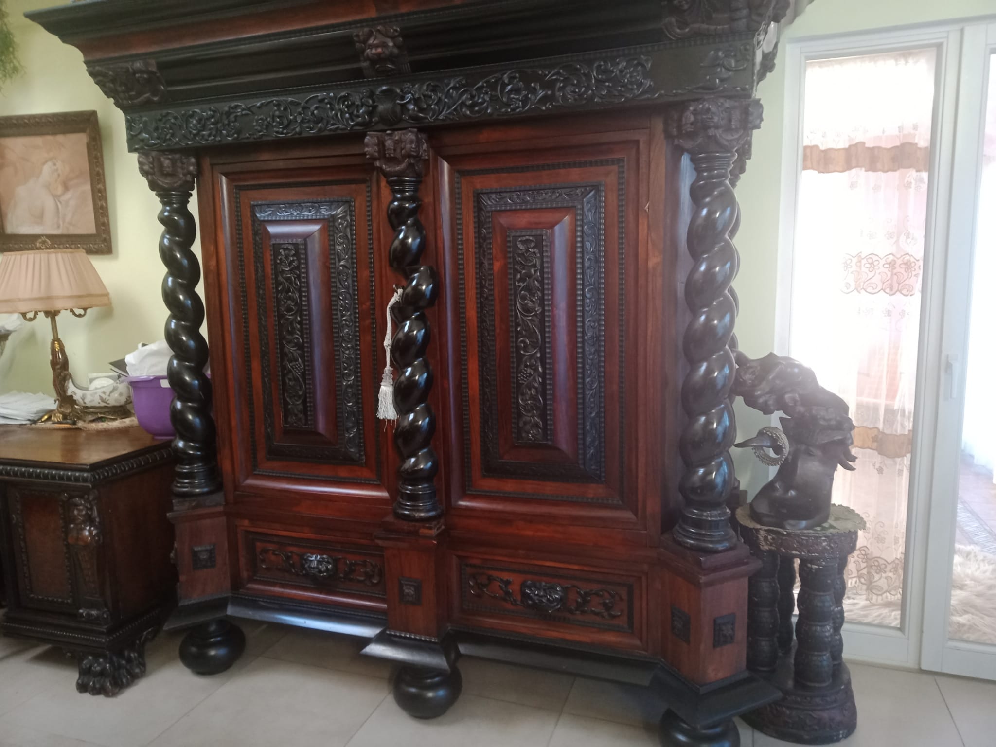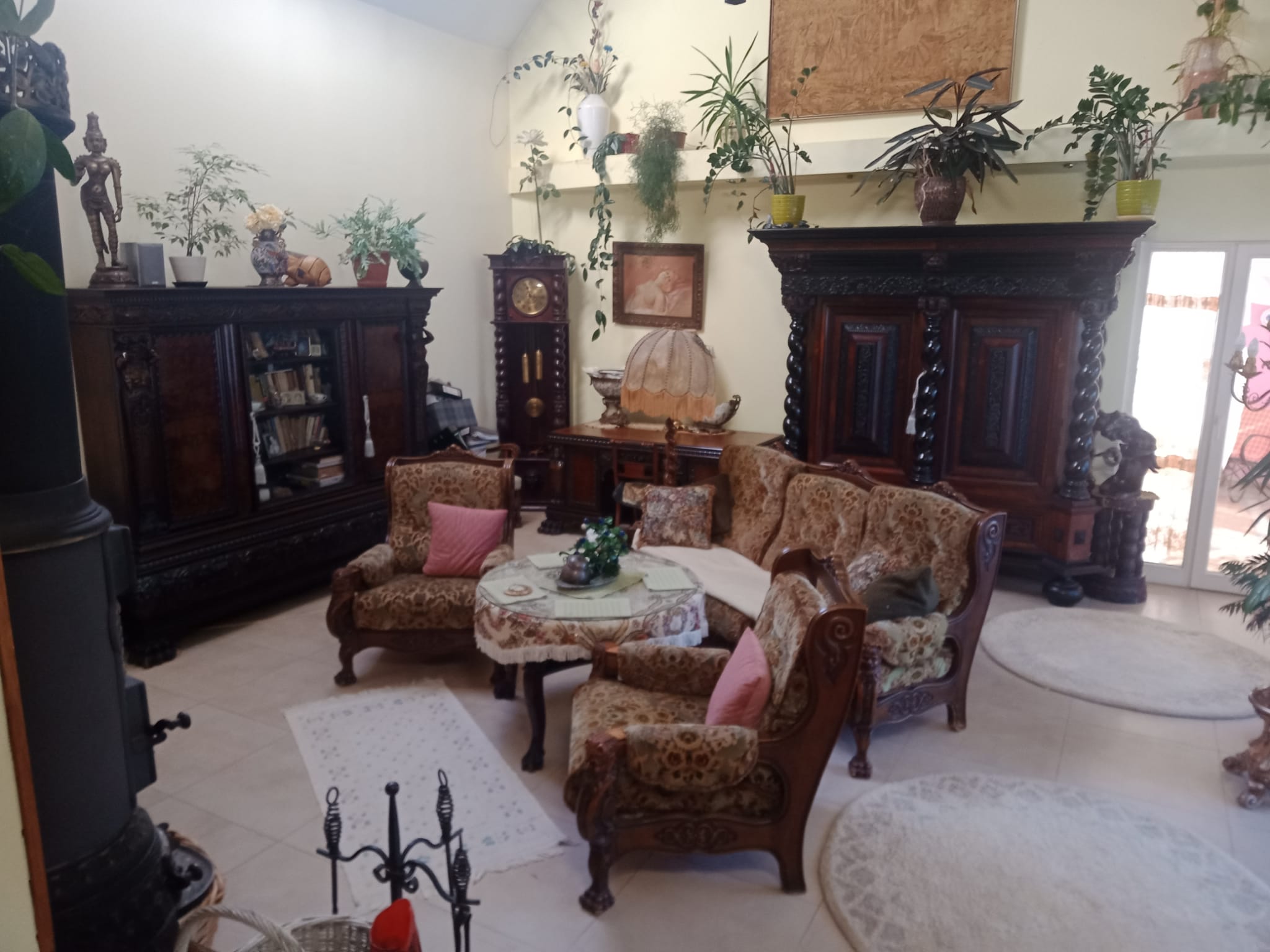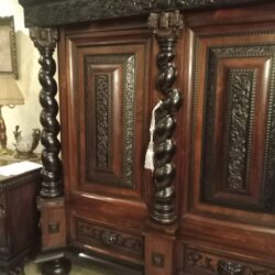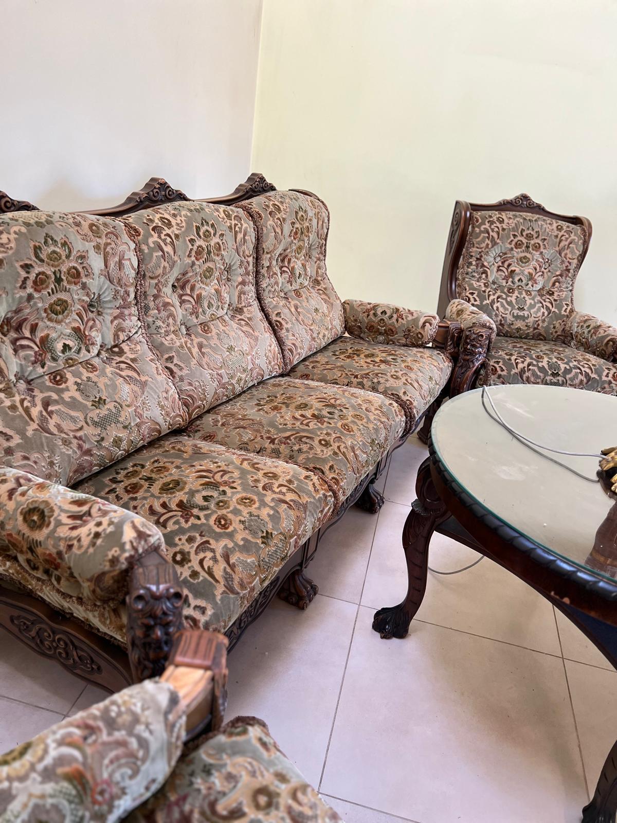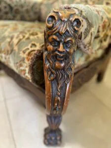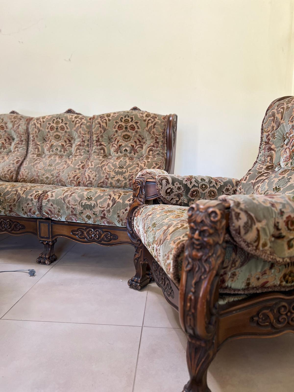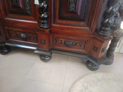 Antyczna szafa i kanapa z fotelami oraz stolik