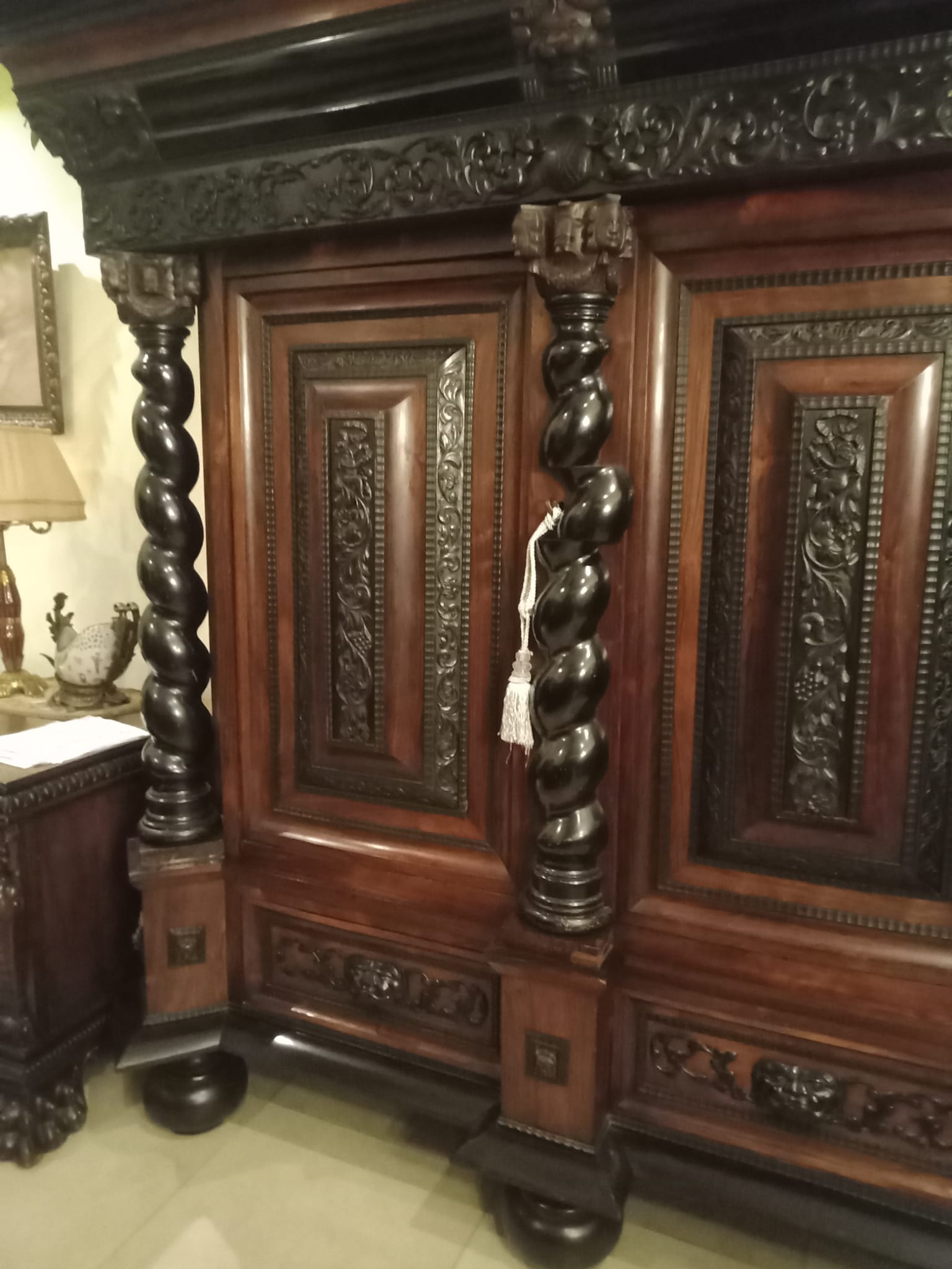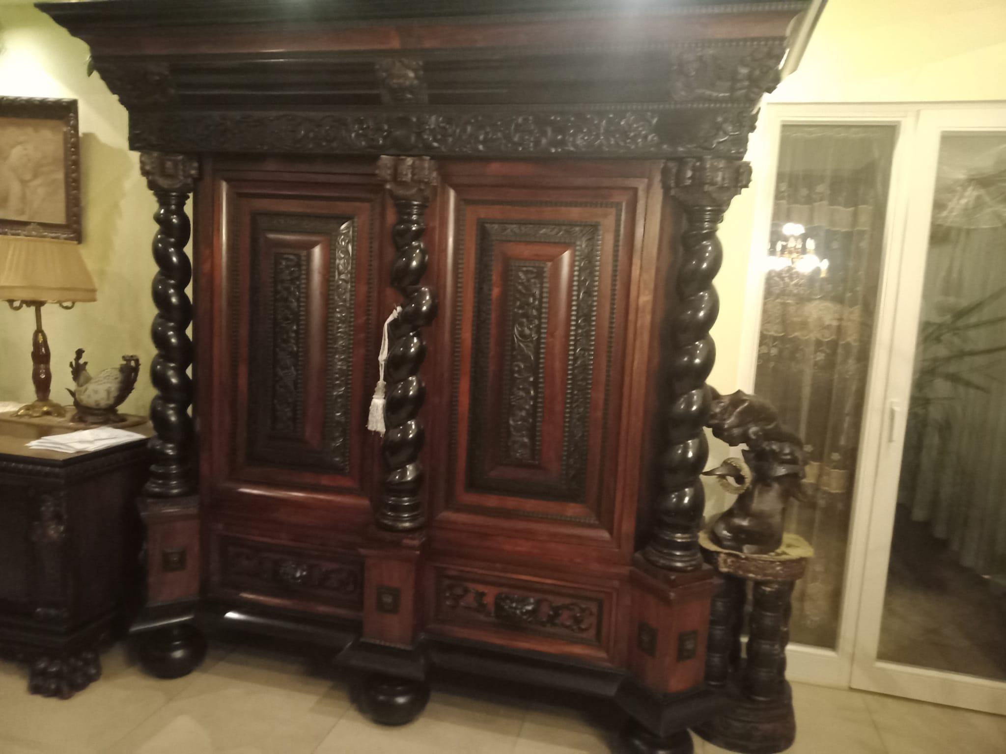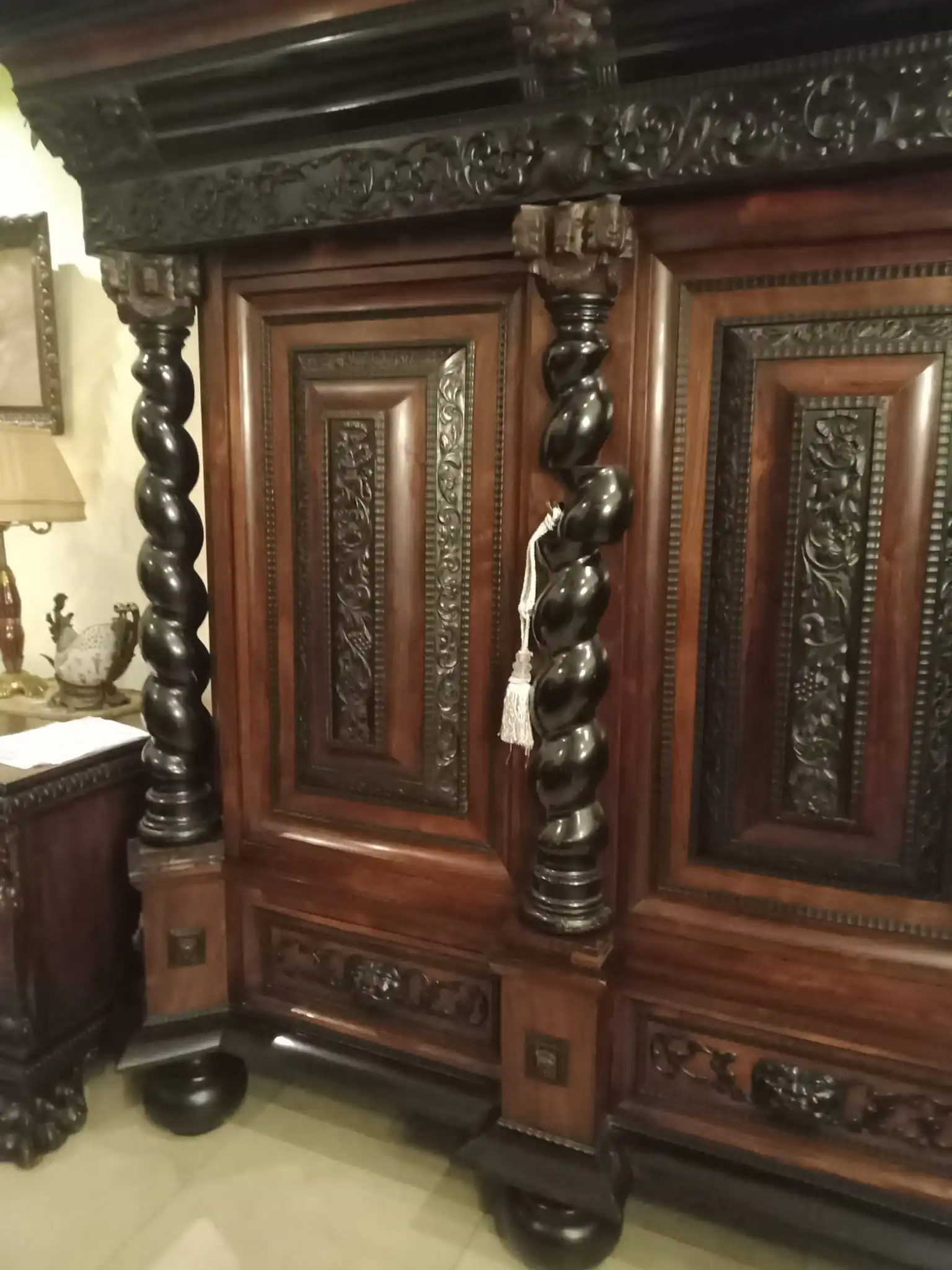 Antyczna szafa i kanapa z fotelami oraz stolik