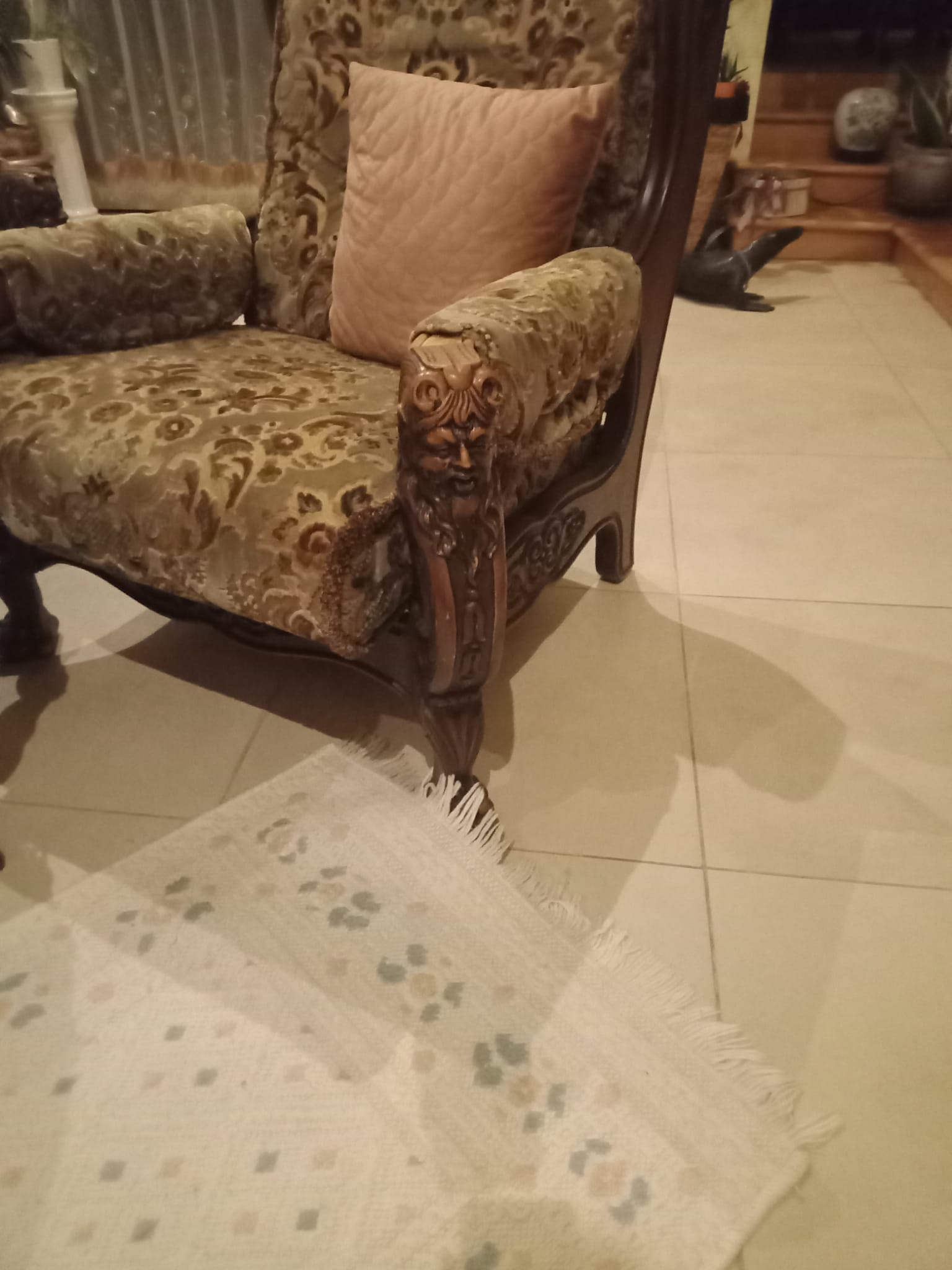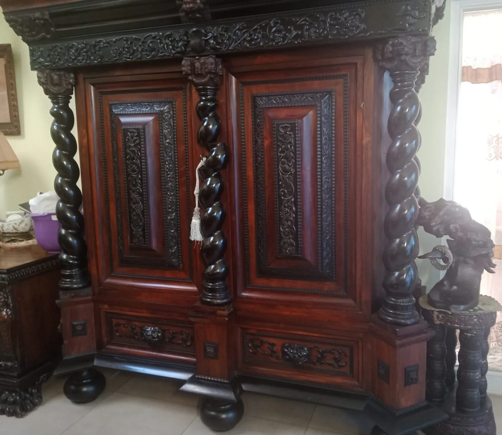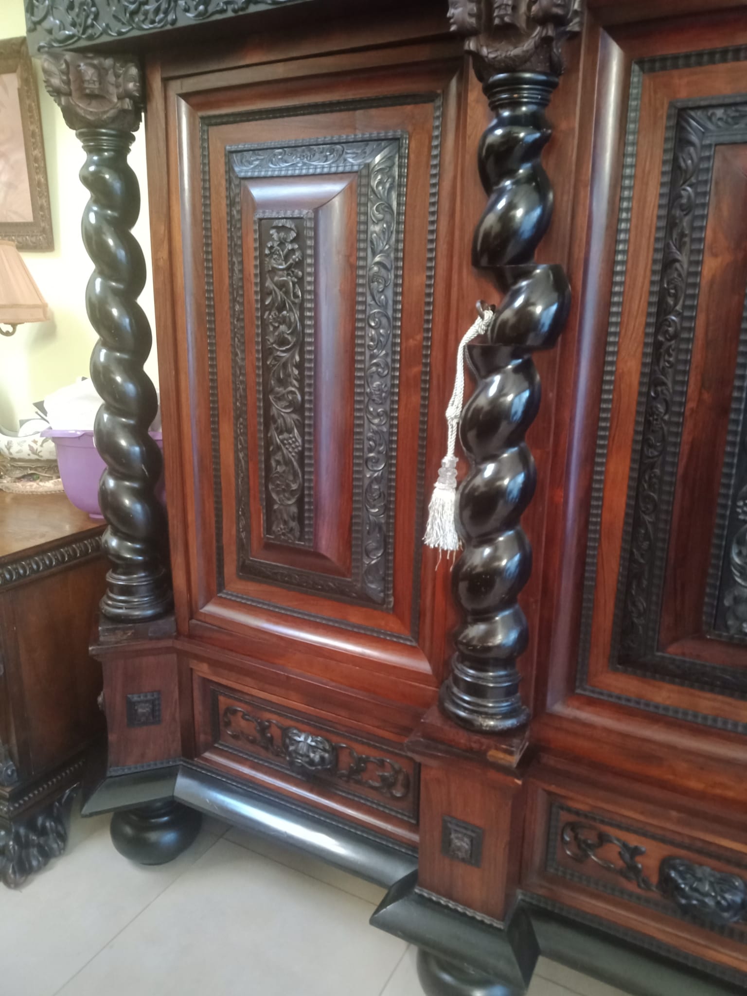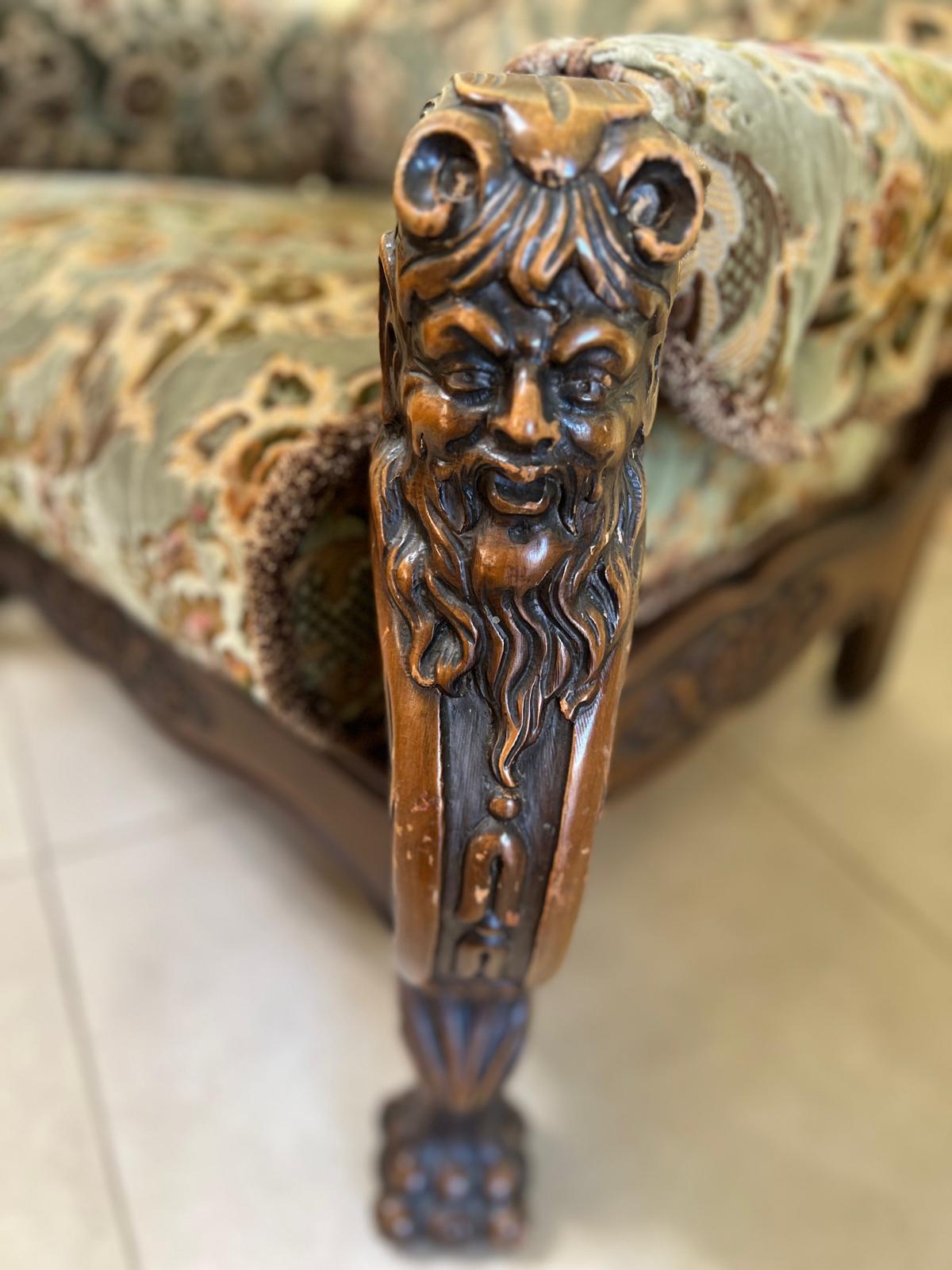 Antyczna szafa i kanapa z fotelami oraz stolik