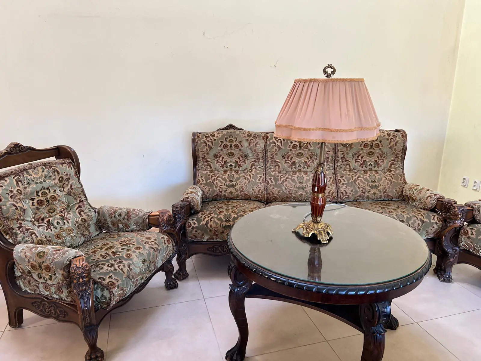Antyczna szafa i kanapa z fotelami oraz stolik