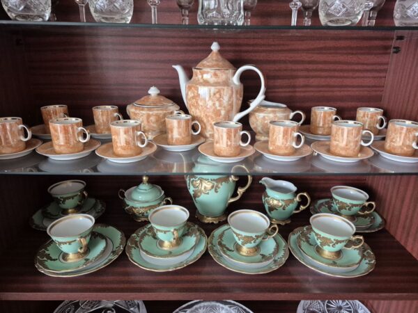 Sprzedam 2 zestawy kawowe z porcelany.. Zestaw łososiowy Karolina. Zestaw zielony malowany ręcznie Wawel. Porcelana stała w witrynie i nie była używana. Zestawy w kolorze łososiowym (często określanym też jako...