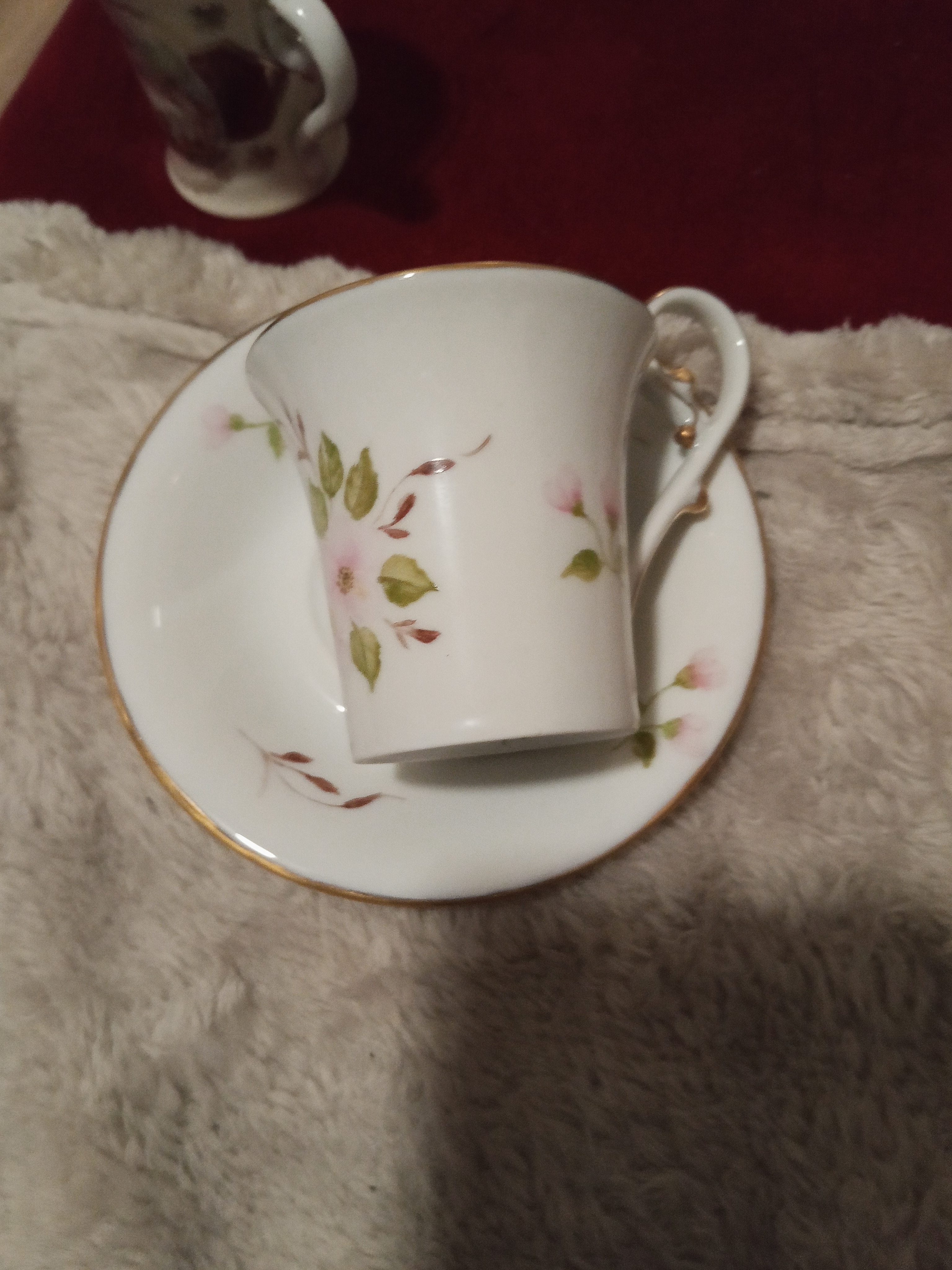 Piękny serwis do kawy lub herbaty.Biały z delikatnymi gałązkami.Zawiera filiżanki z podstawkami, talerzyki deserowe, dzbanek do mleka, dzbanek do herbaty lub kawy, cukiernica.Jest w posiadaniu naszej rodziny od 1810roku.