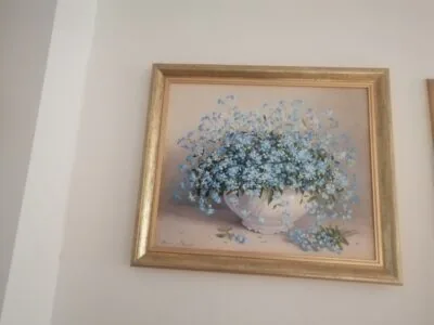 Kwiaty, niezapominajki w białym wazonie, delikatnie opadające, dają pozytywny przekaz. Oprawione w złotej ramie. Liczba kwiatów: We florystyce często przyjmuje się, że liczba róż w bukiecie ma znaczenie – np. jedna róża oznacza „wciąż cię kocham”, a dwanaście „bądź moja na zawsze”.