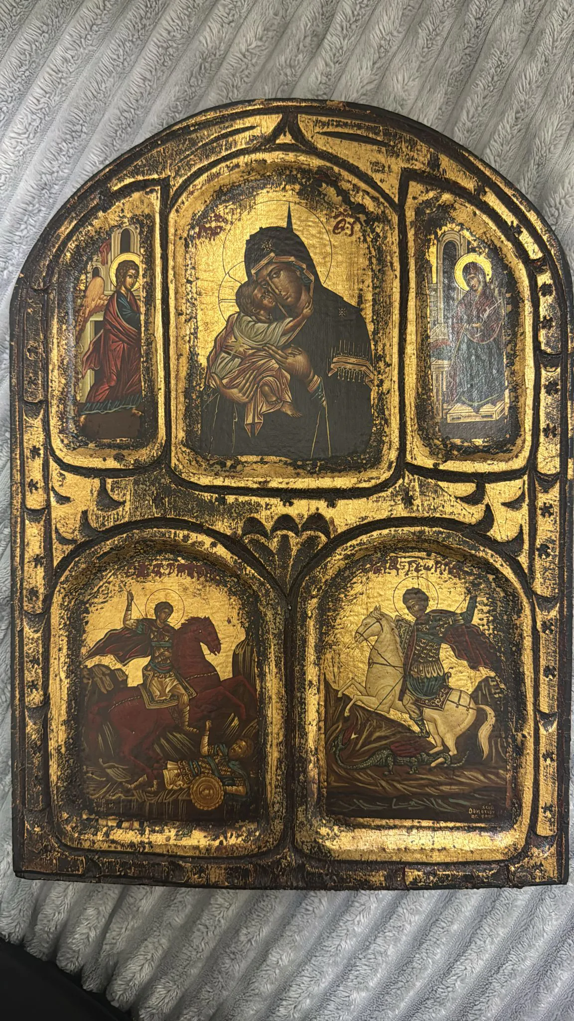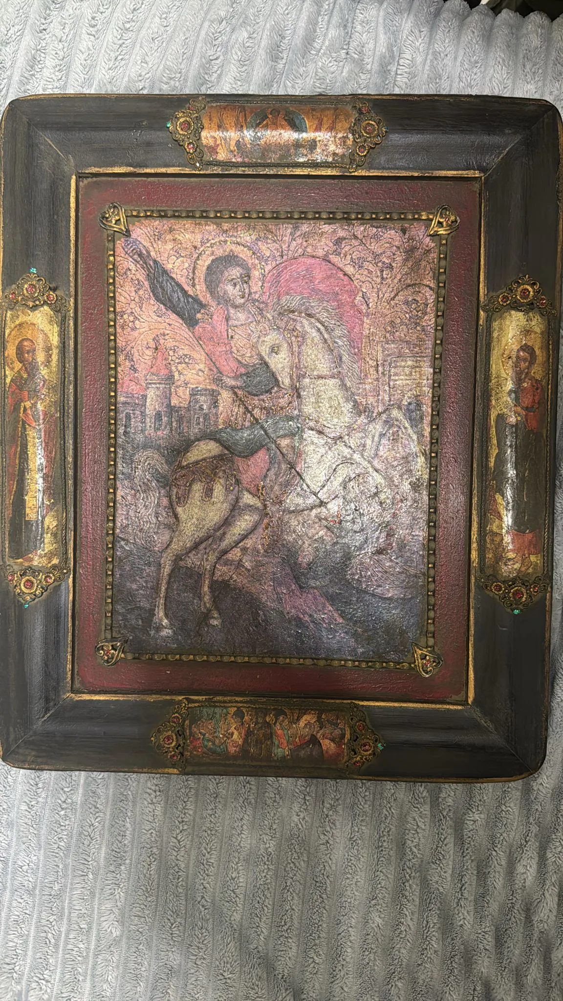 Obraz sakralne powstały w kręgu kultury bizantyńskiej, wyobrażający postacie świętych, sceny z ich życia, sceny biblijne lub liturgiczno-symboliczne, charakterystyczny dla chrześcijańskich Kościołów wschodnich, w tym prawosławnego i greckokatolickiego. Pierwowzorem ikon były (prawdopodobnie, ponieważ nie ma pewności wśród historyków sztuki) portrety grobowe z Fajum lub wczesnochrześcijańskie malarstwo katakumbowe. Nr 1 opis z tyłu