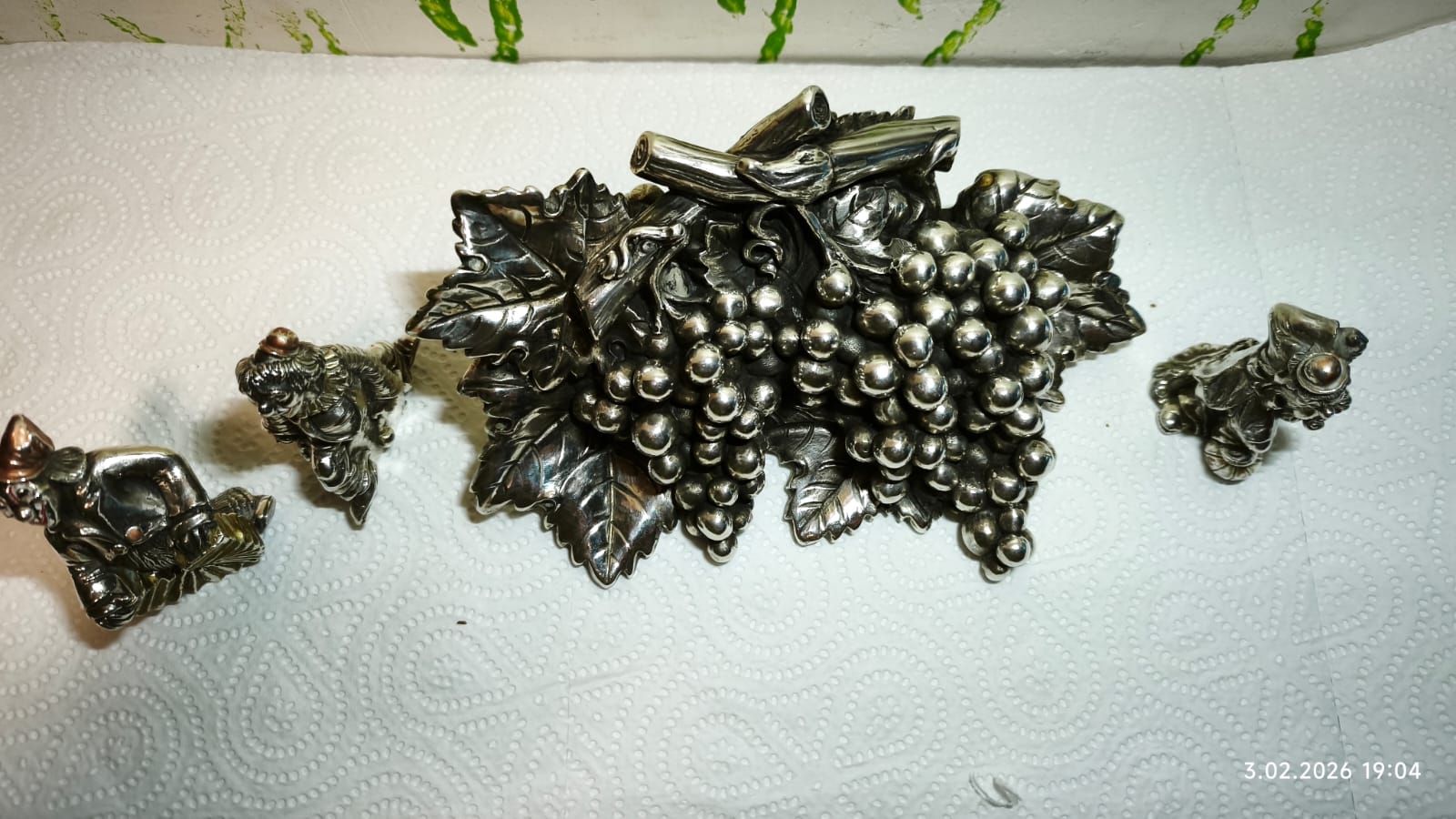 Zestaw Kiści winogrona i figurki z Włoch z Florencji. Przedmioty posiadają próbę, i sygnture producenta...