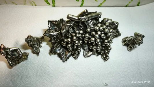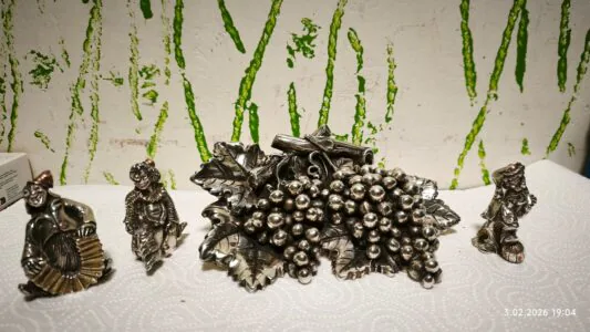 Zestaw Kiści winogrona i figurki z Włoch z Florencji. Przedmioty posiadają próbę, i sygnture producenta to doskonałe dodatki do każdego wnętrza. , nadają eleganckiego i stylowego wyglądu. Idealne jako prezent dla miłośników stylowych ozdób.