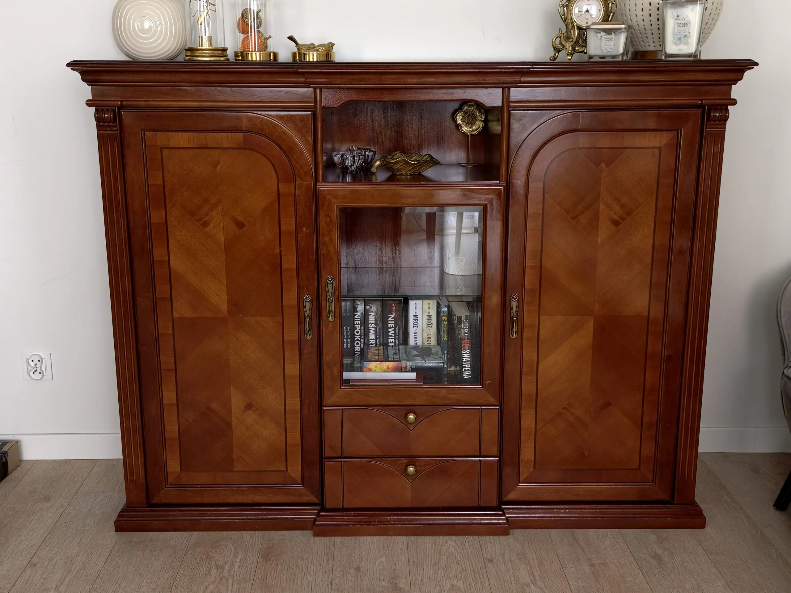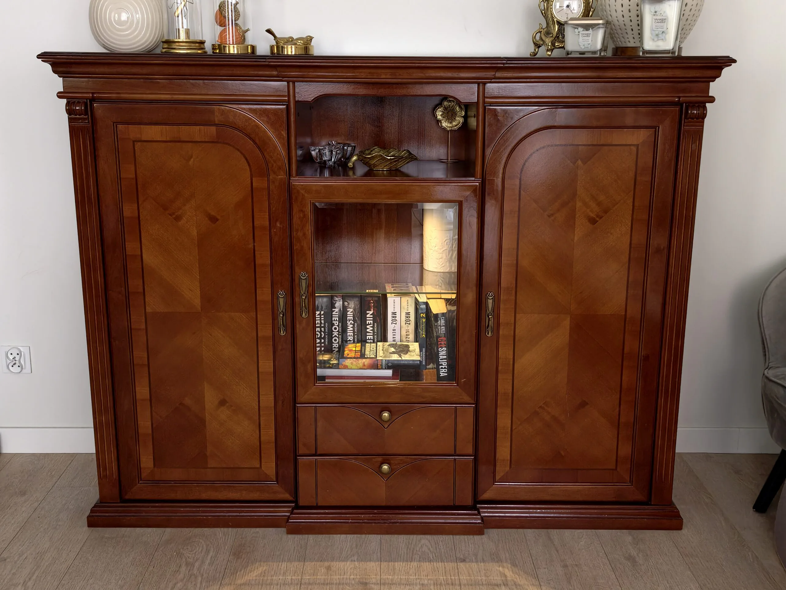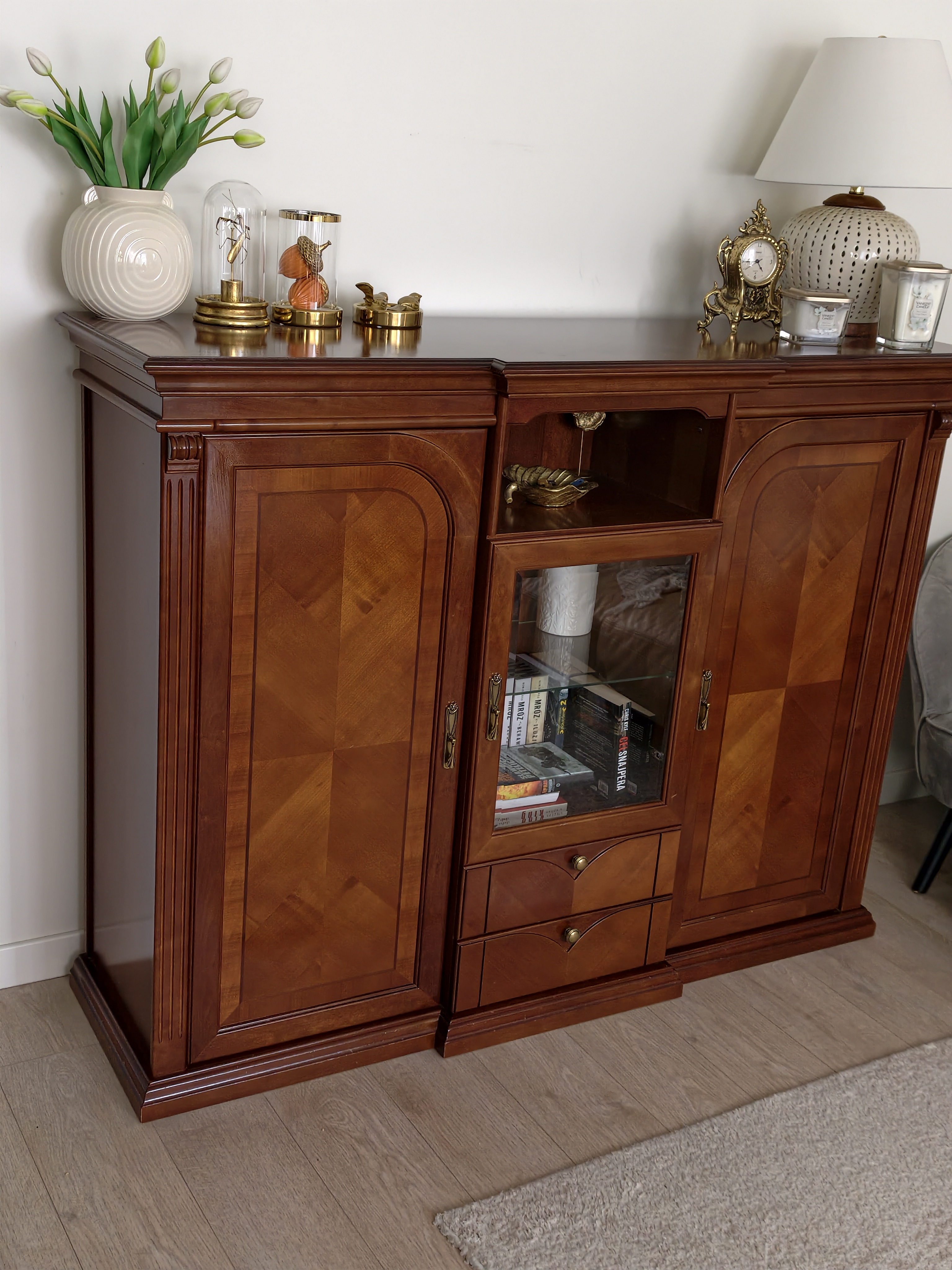 Piękny drewniany kredens. Rzeźbione elementy. Kryształowe szklo. Wymiary:. Nastawka wysokość 60 cm . Całość wysokość 166. Szerokość całkowita 179. Głębokosc 66