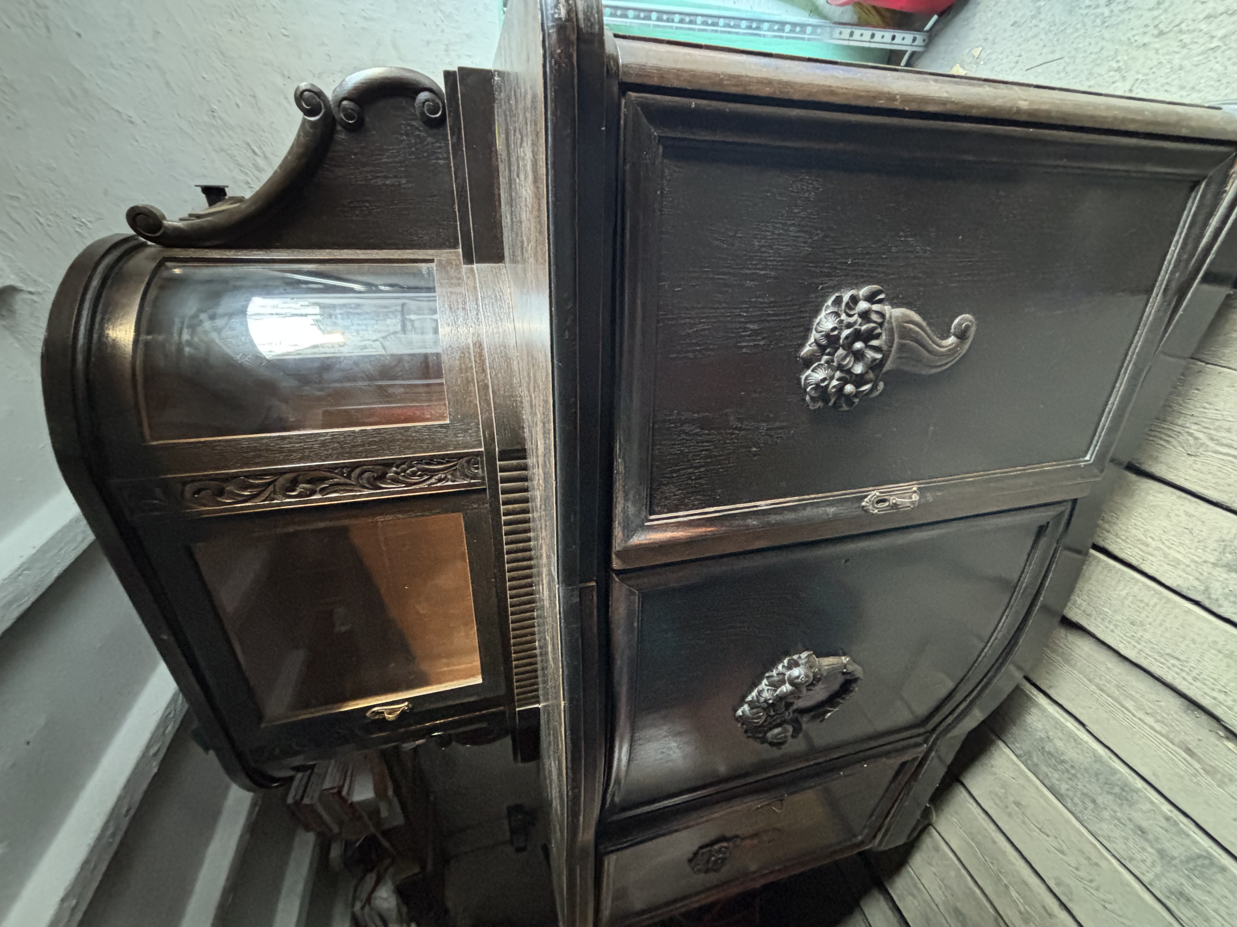 Piękny drewniany kredens. Rzeźbione elementy. Kryształowe szklo. Wymiary:. Nastawka wysokość 60 cm . Całość wysokość...