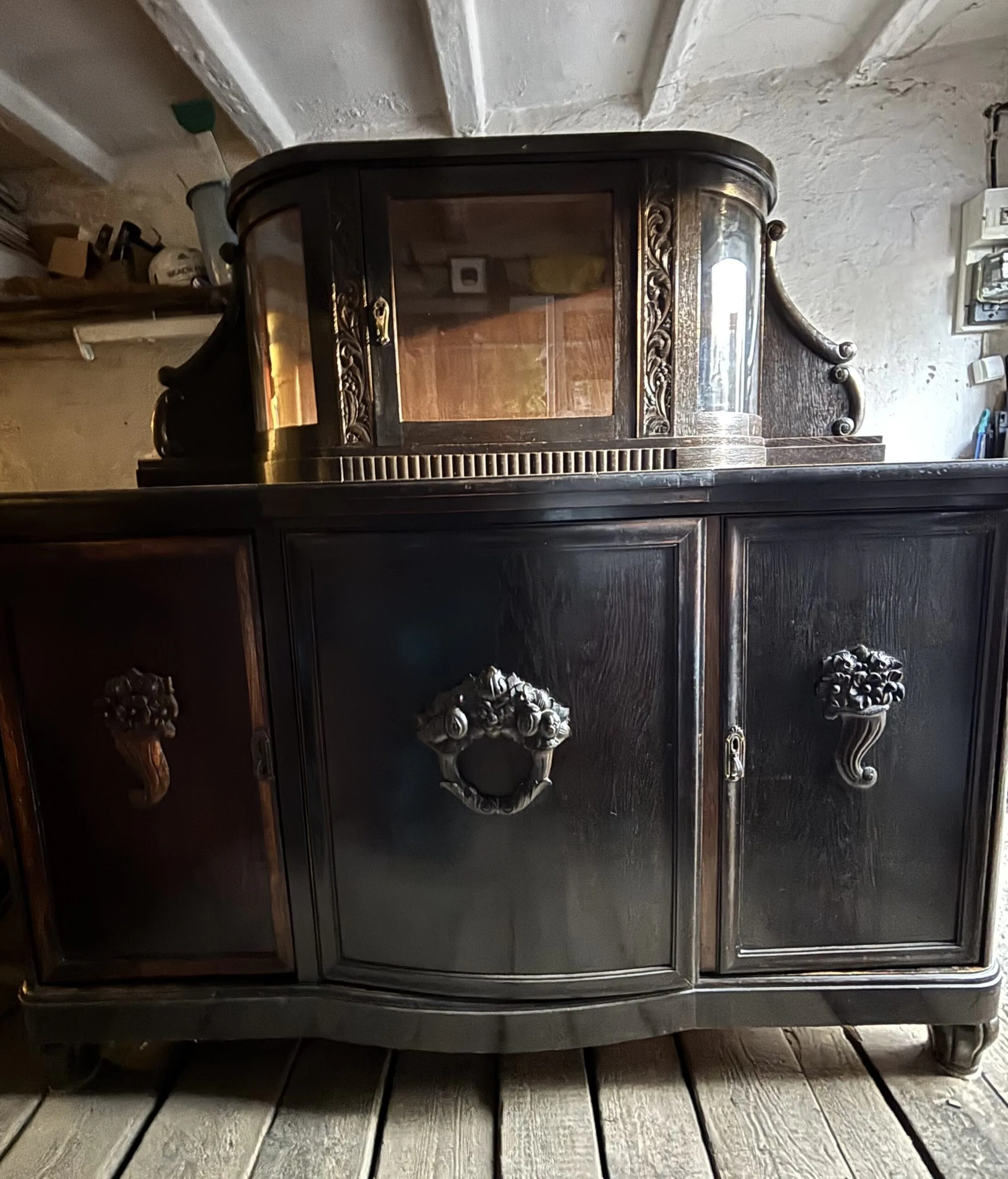 Piękny drewniany kredens. Rzeźbione elementy. Kryształowe szklo. Wymiary:. Nastawka wysokość 60 cm . Całość wysokość 166. Szerokość całkowita 179. Głębokosc 66