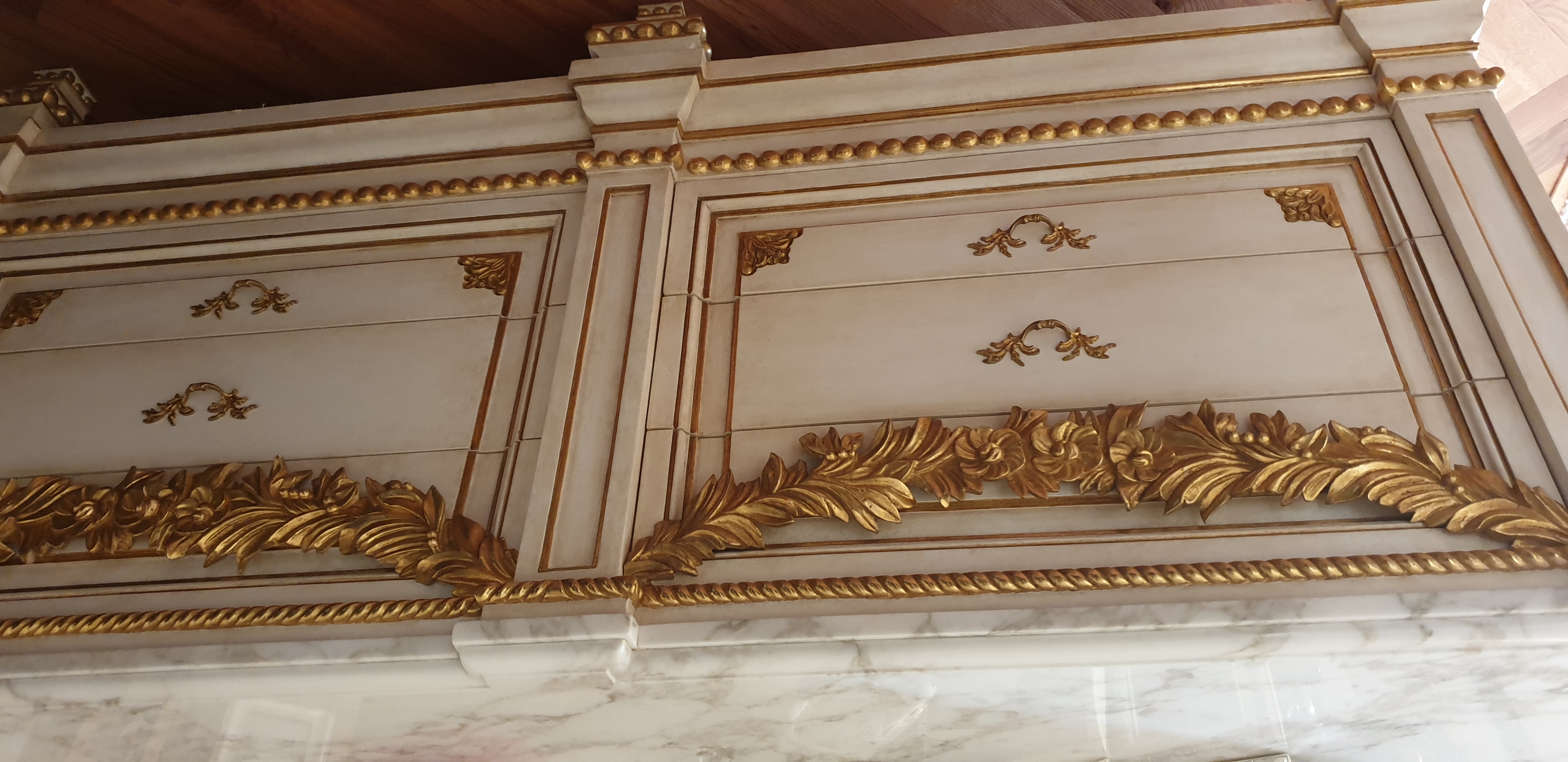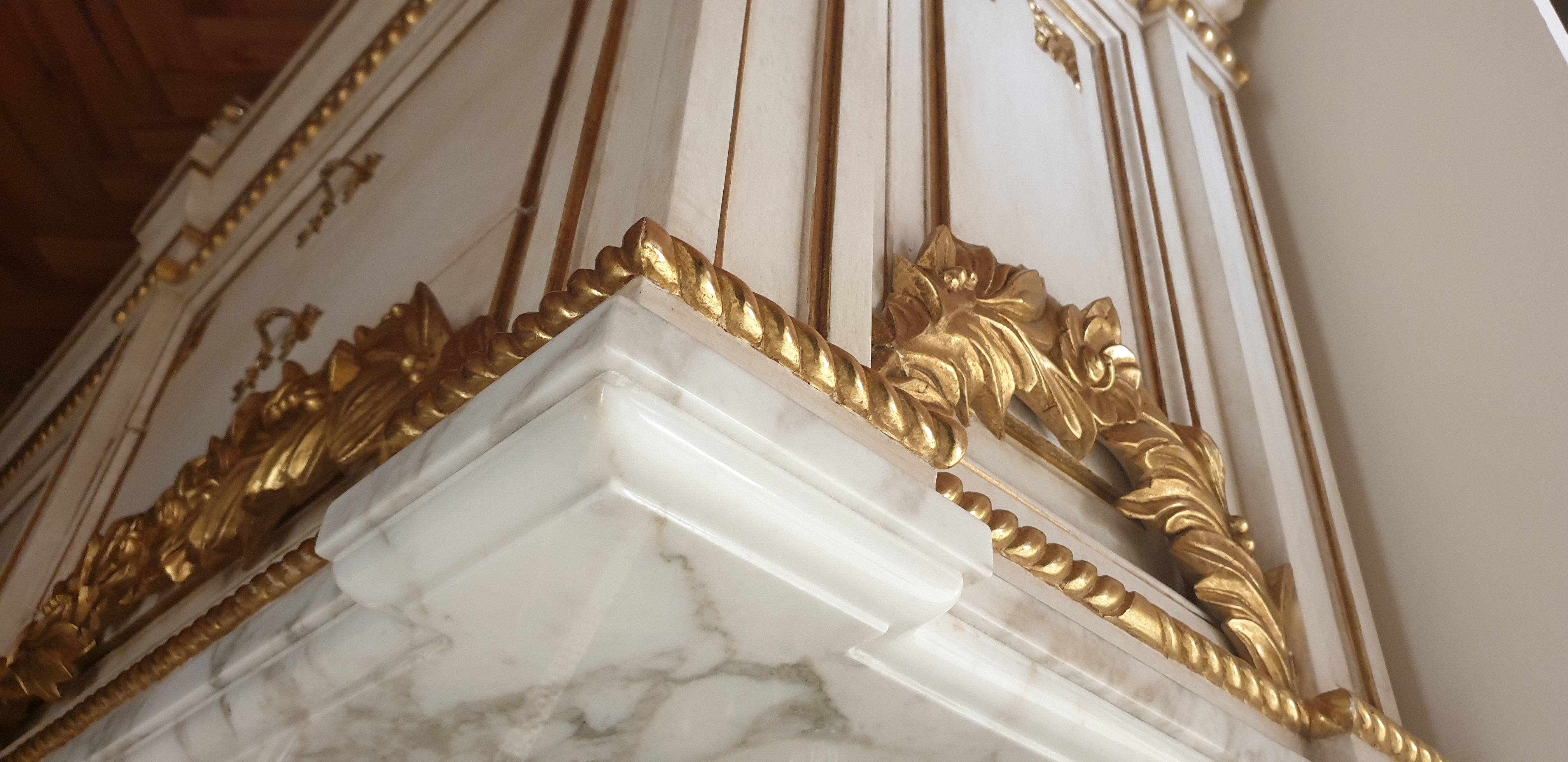 Materiały: lite drewno, wykończenie zlocone, blaty marmurowe.