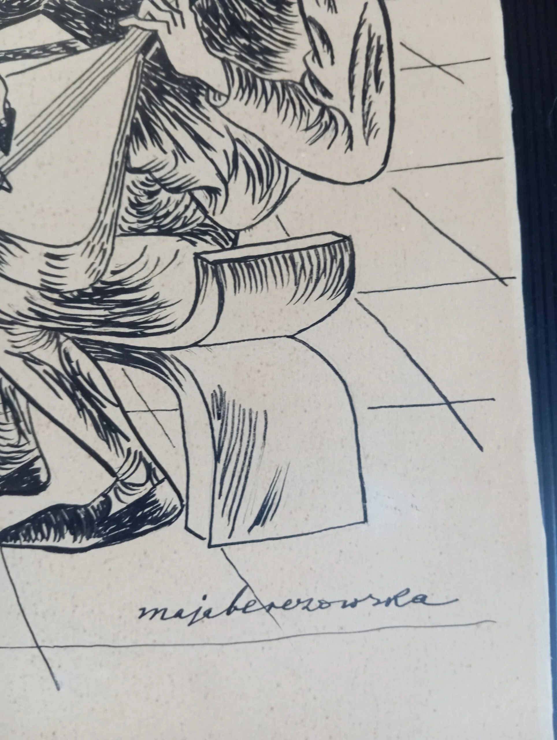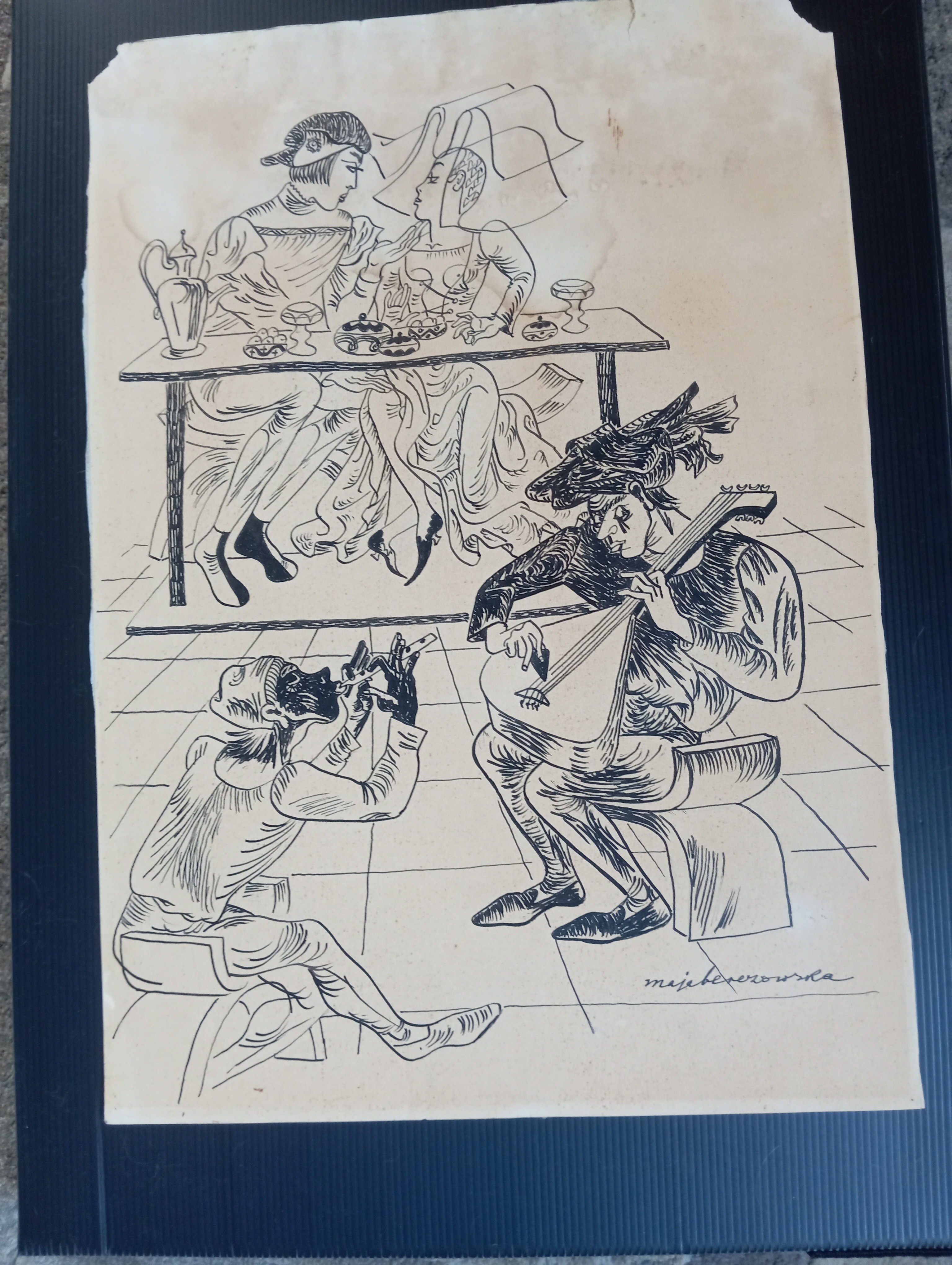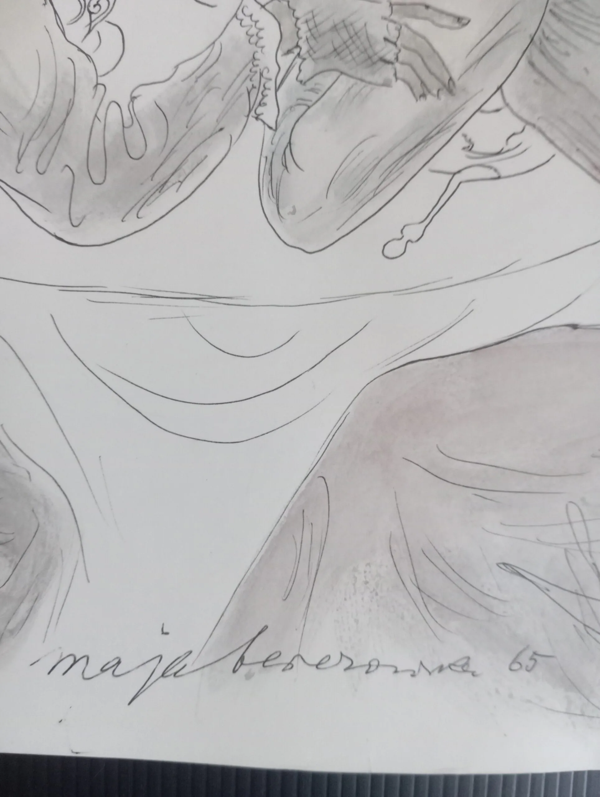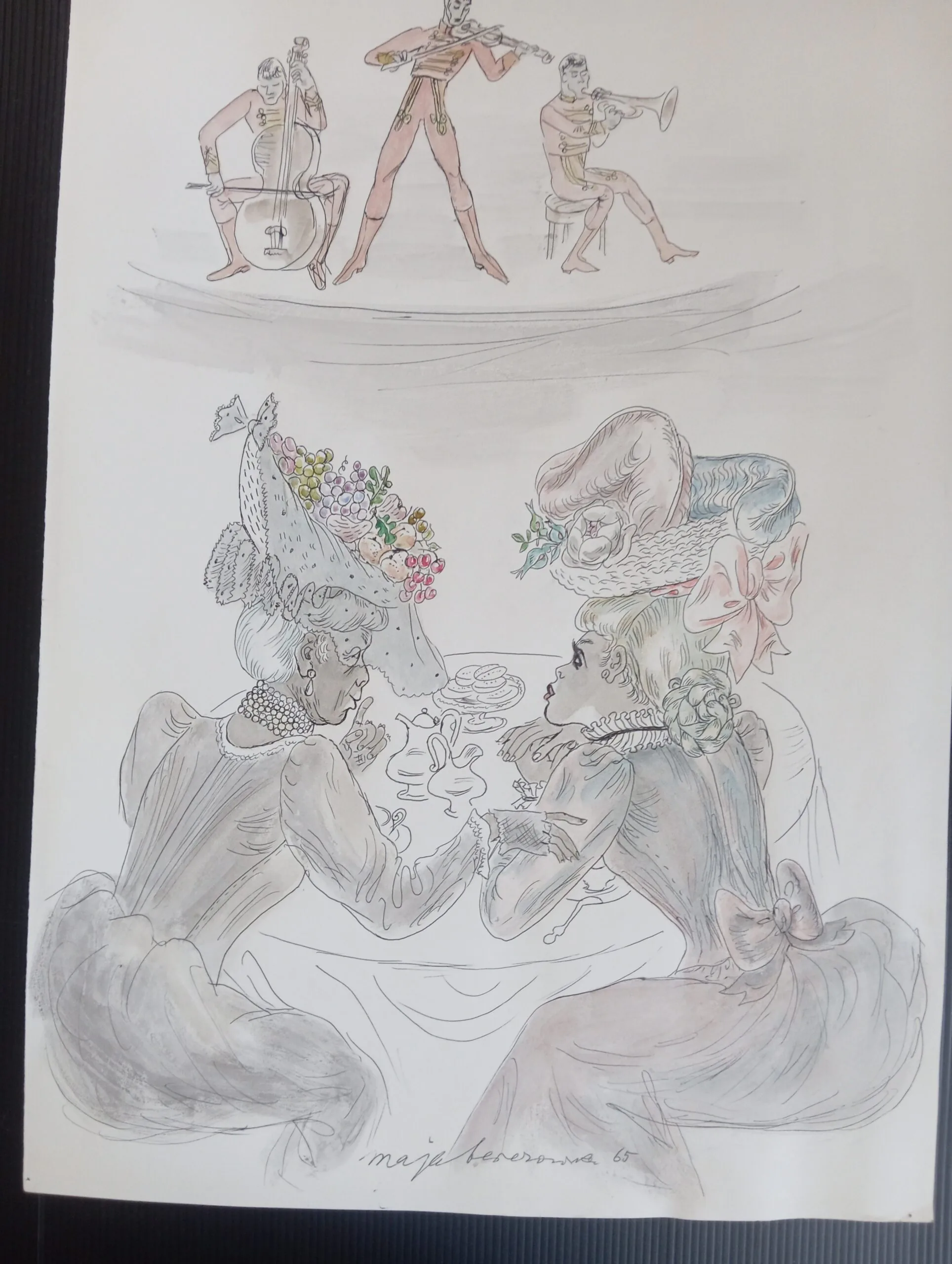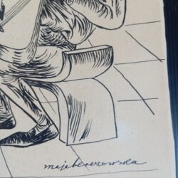 Dwa obrazy Mai Berezowskiej sprzedaż łączona. Nr 1 . Koncert – tusz/papier . wymiary 47,50 x 33,00 cm . Stan zachowania – naderwanie papieru w górnej partii. Nr 2 – Dwie damy słuchające koncertu -akwarela, tusz/papier. wymiary 49,50 x 35,00 cm . Stan zachowania – dobry. Maja Berezowska (1893–1978) to wybitna polska malarka, graficzka, karykaturzystka i scenografka, zapamiętana przede wszystkim jako mistrzyni subtelnej erotyki oraz ciętej satyry politycznej. Jej styl charakteryzuje się lekką, płynną kreską i radosnym podejściem do zmysłowości.