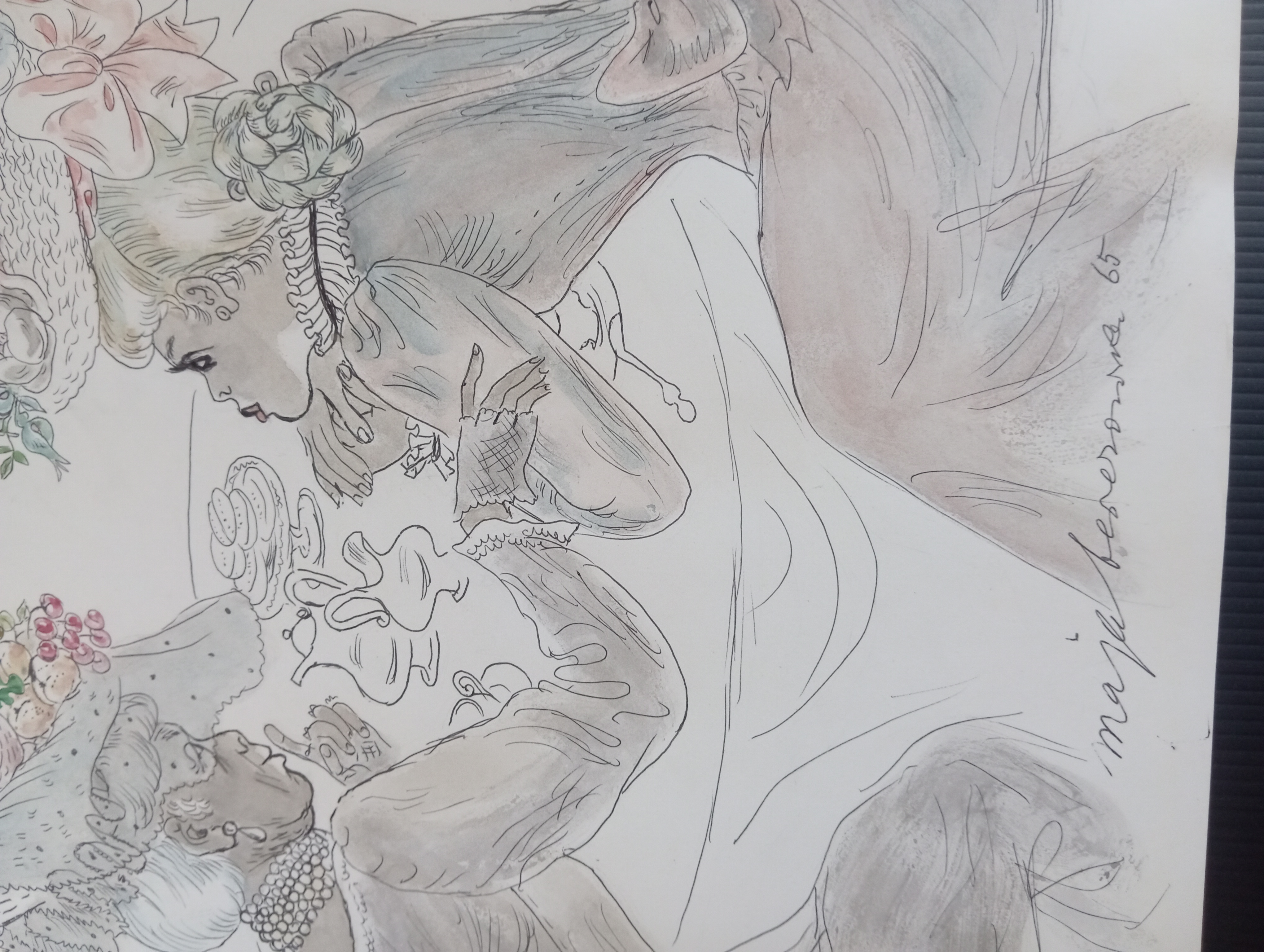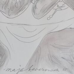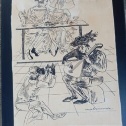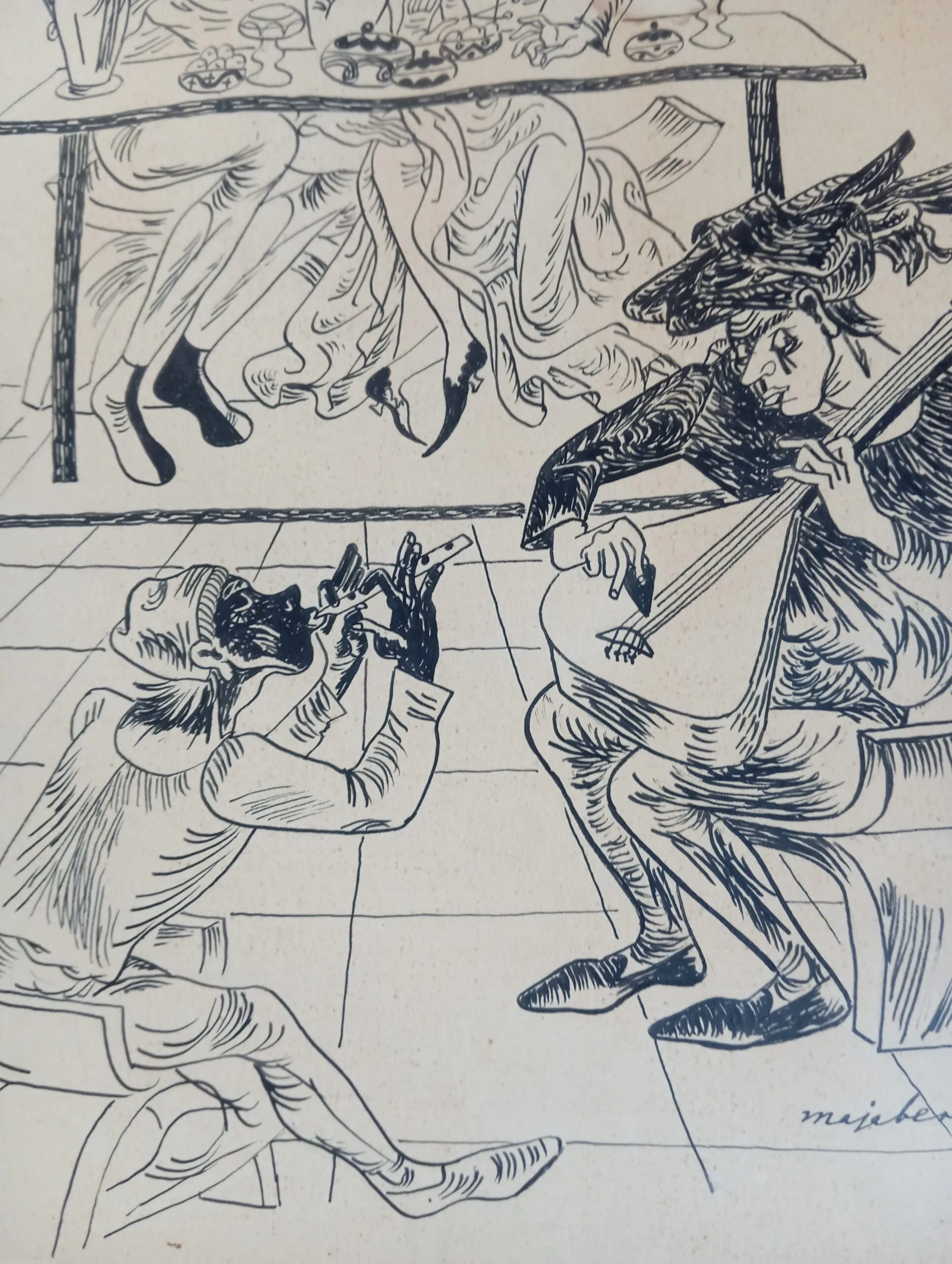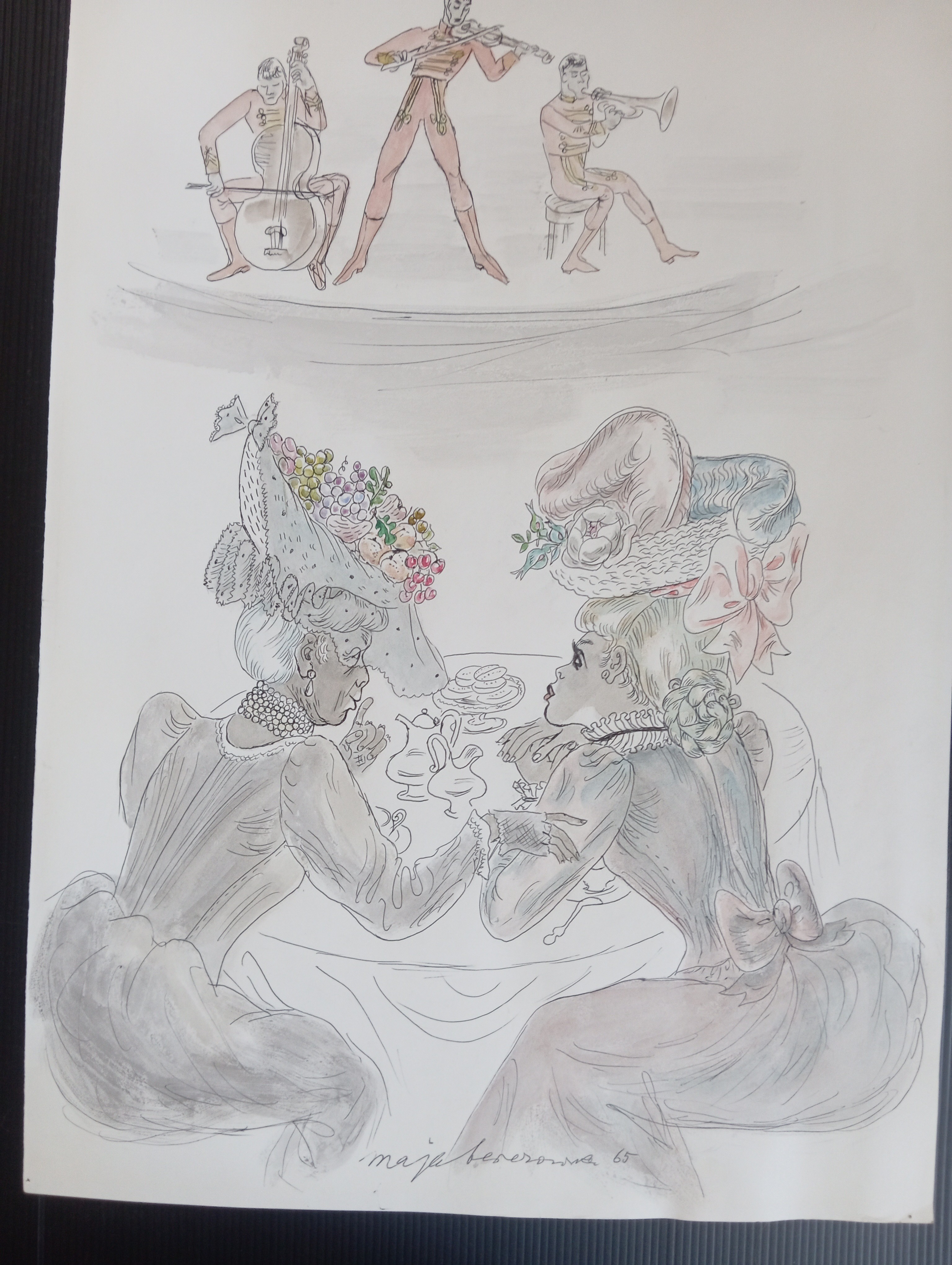 Dwa obrazy Mai Berezowskiej sprzedaż łączona. Nr 1 . Koncert – tusz/papier . wymiary 47,50 x 33,00 cm . Stan zachowania – naderwanie papieru w górnej partii. Nr 2 – Dwie damy słuchające koncertu -akwarela, tusz/papier. wymiary 49,50 x 35,00 cm . Stan zachowania – dobry. Maja Berezowska (1893–1978) to wybitna polska malarka, graficzka, karykaturzystka i scenografka, zapamiętana przede wszystkim jako mistrzyni subtelnej erotyki oraz ciętej satyry politycznej. Jej styl charakteryzuje się lekką, płynną kreską i radosnym podejściem do zmysłowości.