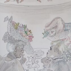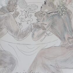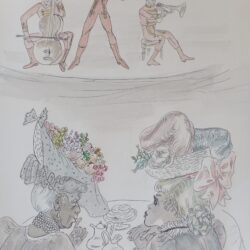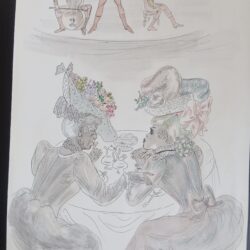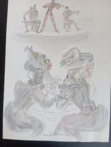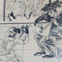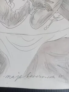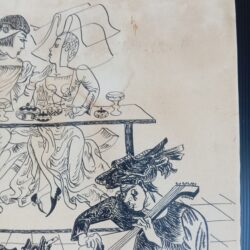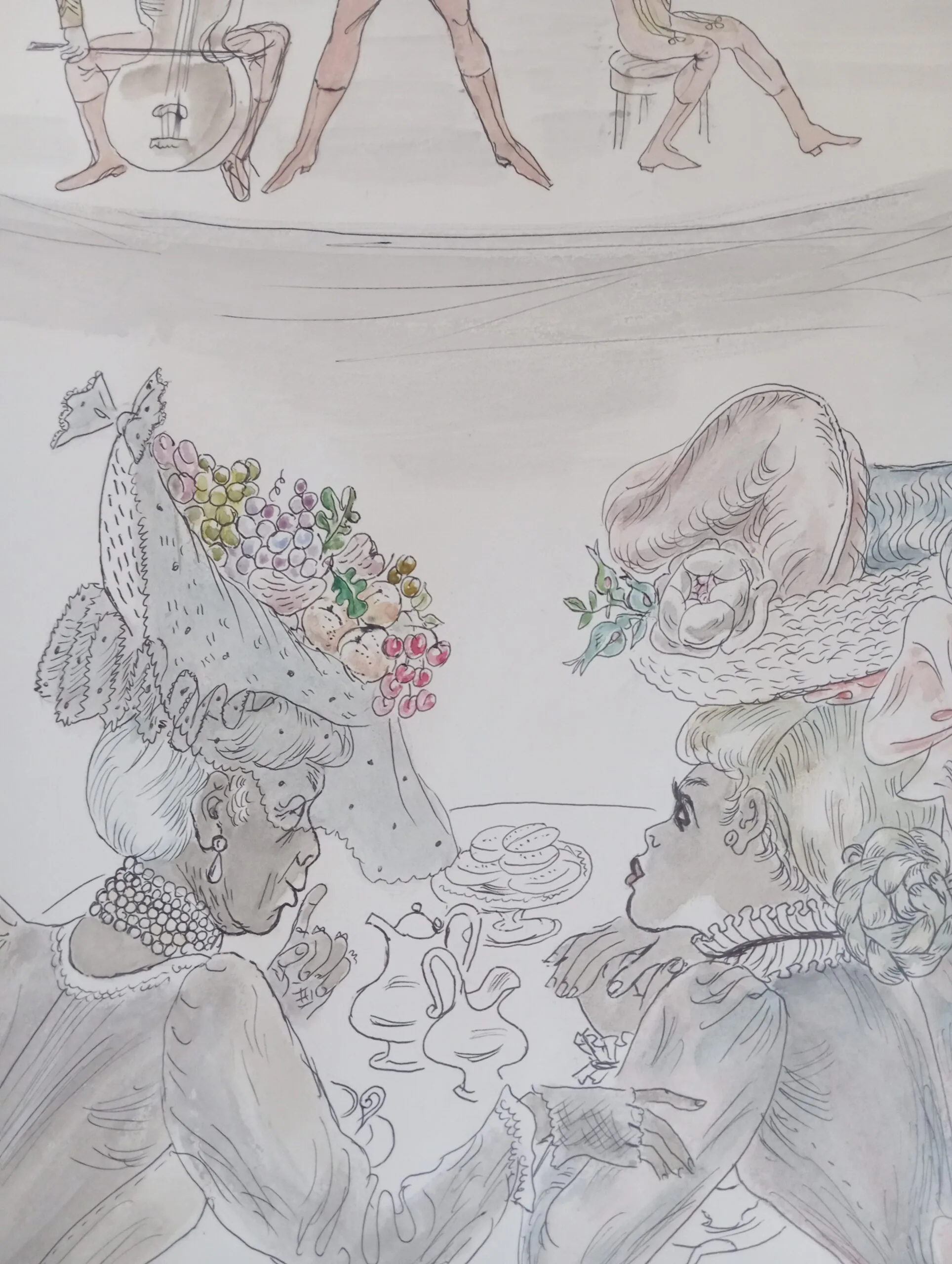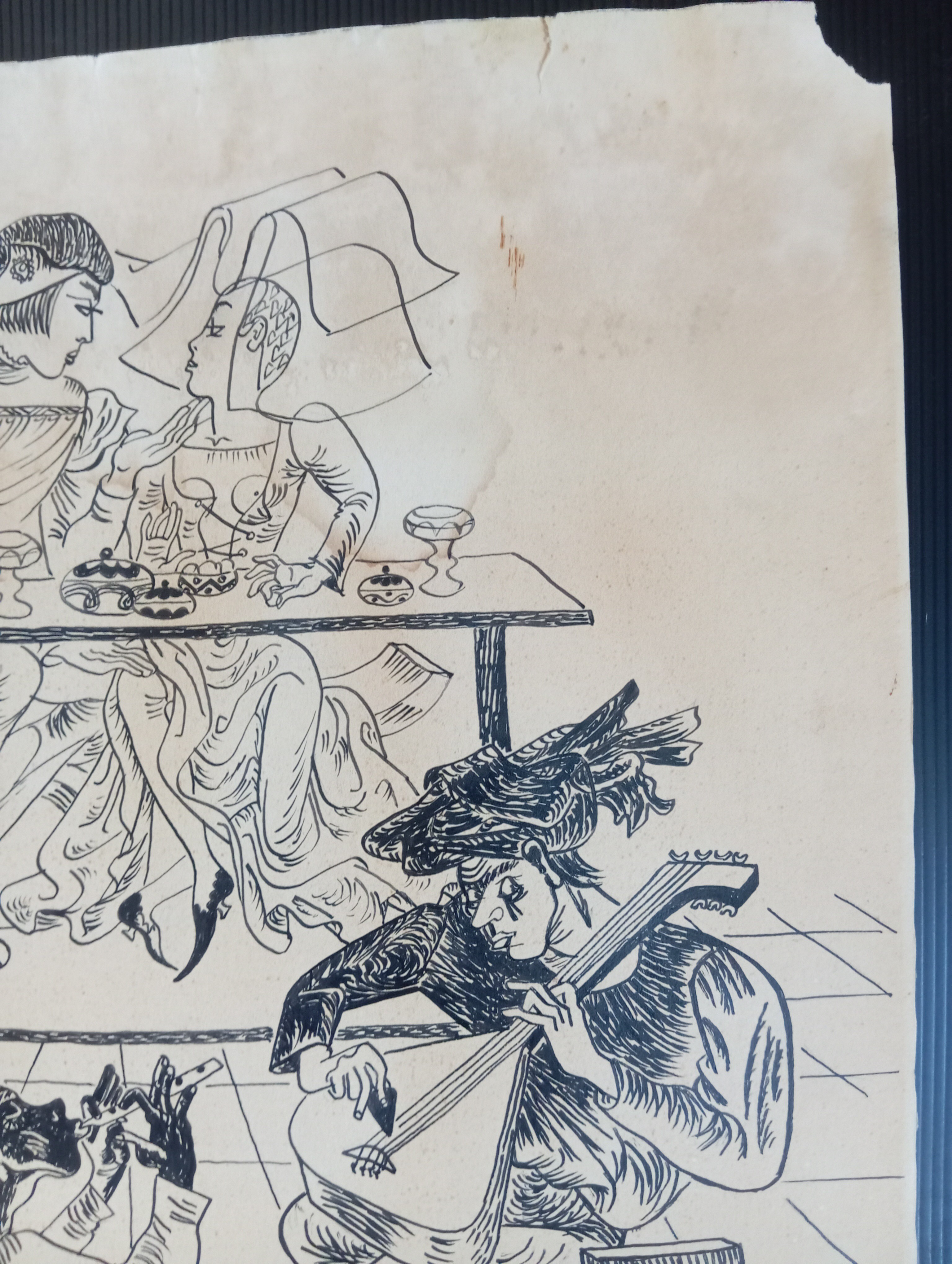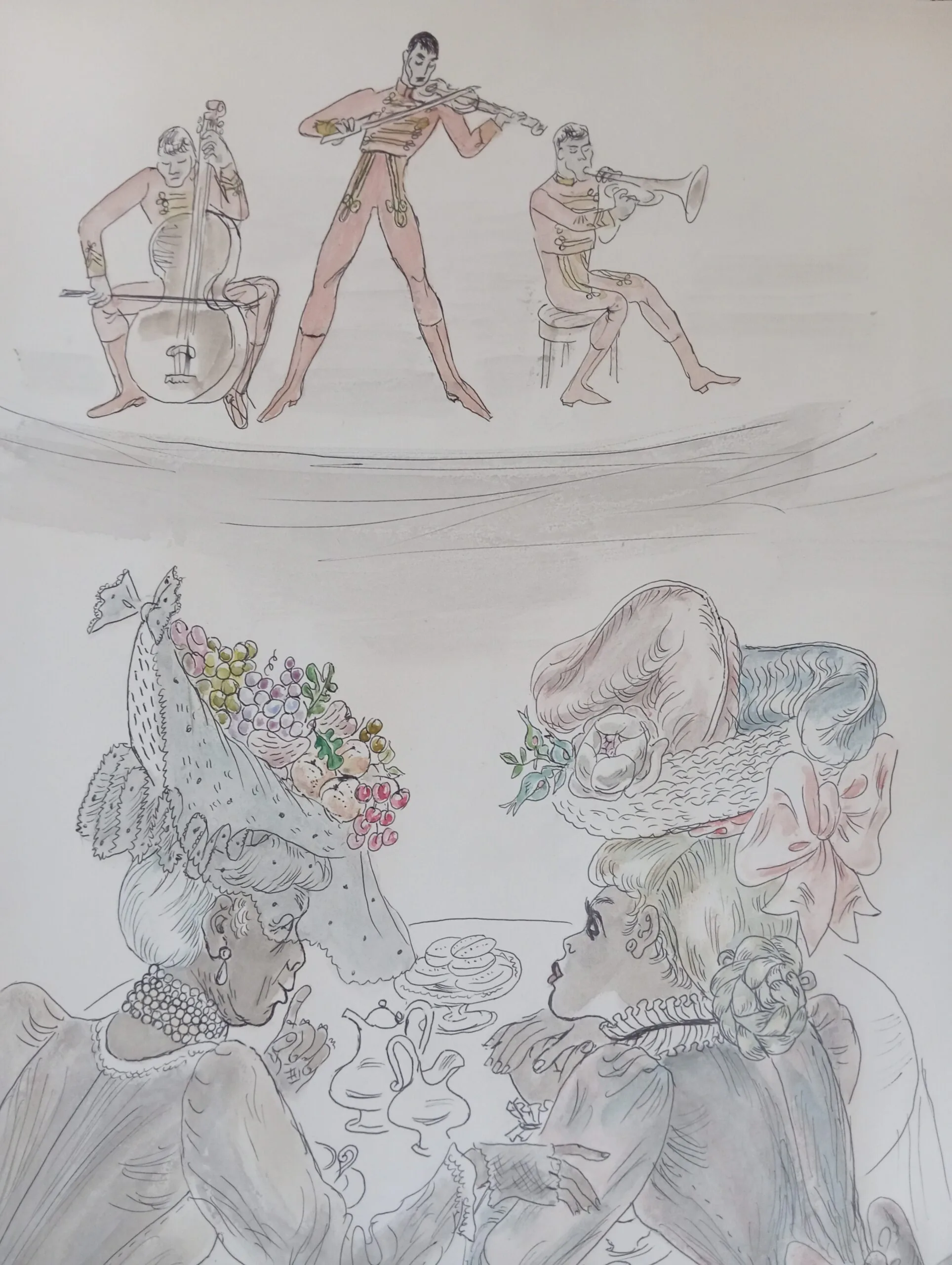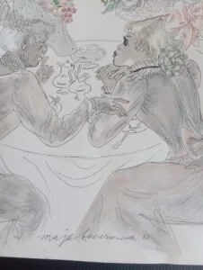 Dwa obrazy Mai Berezowskiej sprzedaż łączona. Nr 1 . Koncert – tusz/papier . wymiary 47,50 x 33,00 cm . Stan zachowania – naderwanie papieru w górnej partii. Nr 2 – Dwie damy słuchające koncertu -akwarela, tusz/papier. wymiary 49,50 x 35,00 cm . Stan zachowania – dobry. Maja Berezowska (1893–1978) to wybitna polska malarka, graficzka, karykaturzystka i scenografka, zapamiętana przede wszystkim jako mistrzyni subtelnej erotyki oraz ciętej satyry politycznej. Jej styl charakteryzuje się lekką, płynną kreską i radosnym podejściem do zmysłowości.