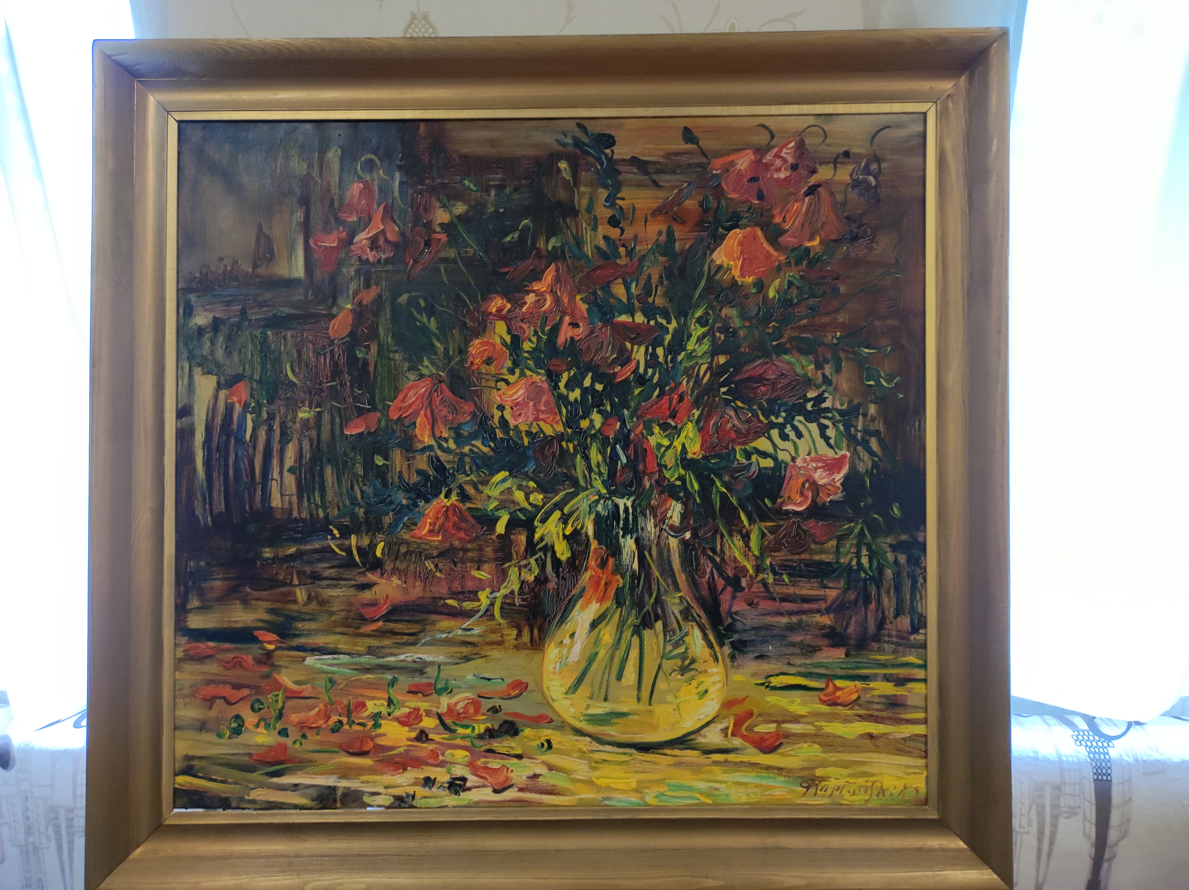 Obraz pochodzi z lat 50-tych. Obraz jest duży, wymiary 73 x 60, w tym 3 cm to prosta,drewniana rama. Obraz malowany jest na płótnie farba olejna. jest sygnowany 1957 J....