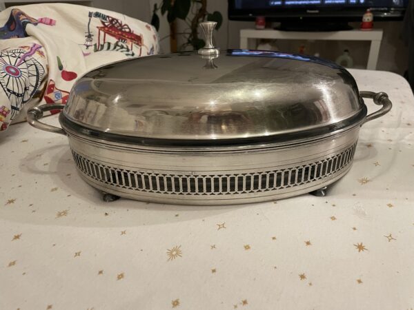 Posrebrzane antyczne naczynie żaroodporne, naczynie do serwowania. Przywiezione z Włoch , ma wysoką zawartość srebra, jest pięknie zdobione, z nóżkami uchwytami i przykrywką. Naczynie do dokładnego wyczyszczenia i wypolerowania. Naczynie...