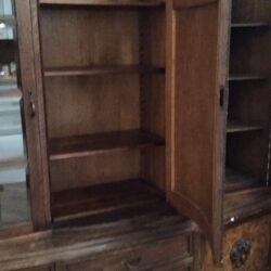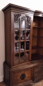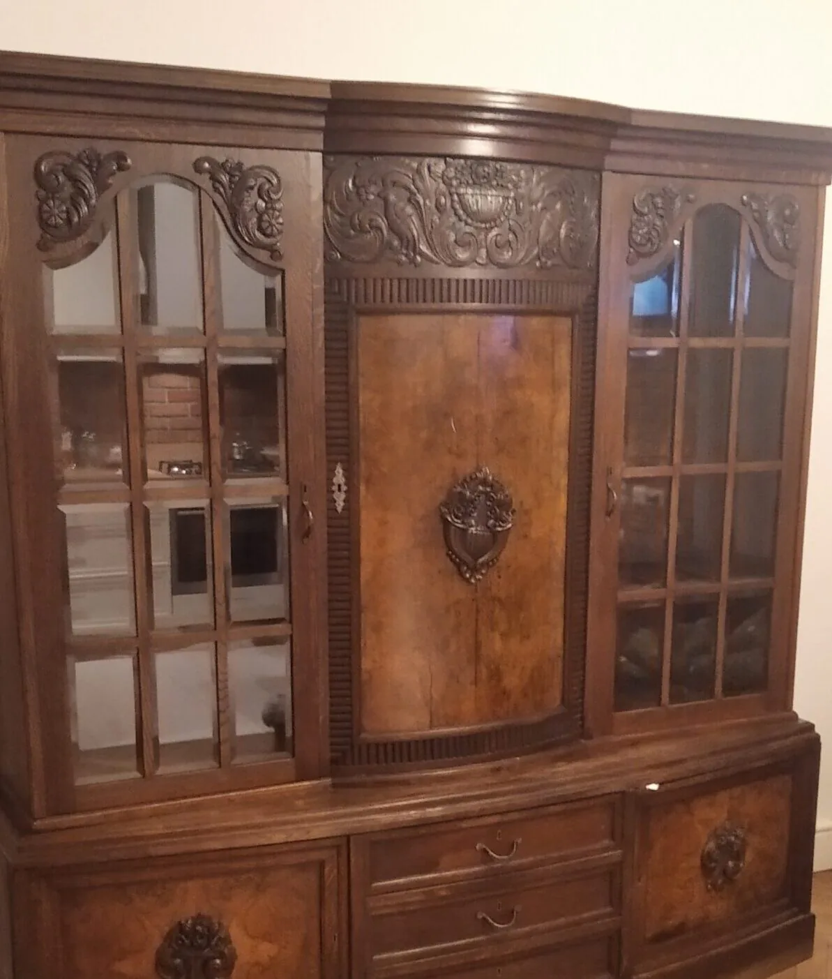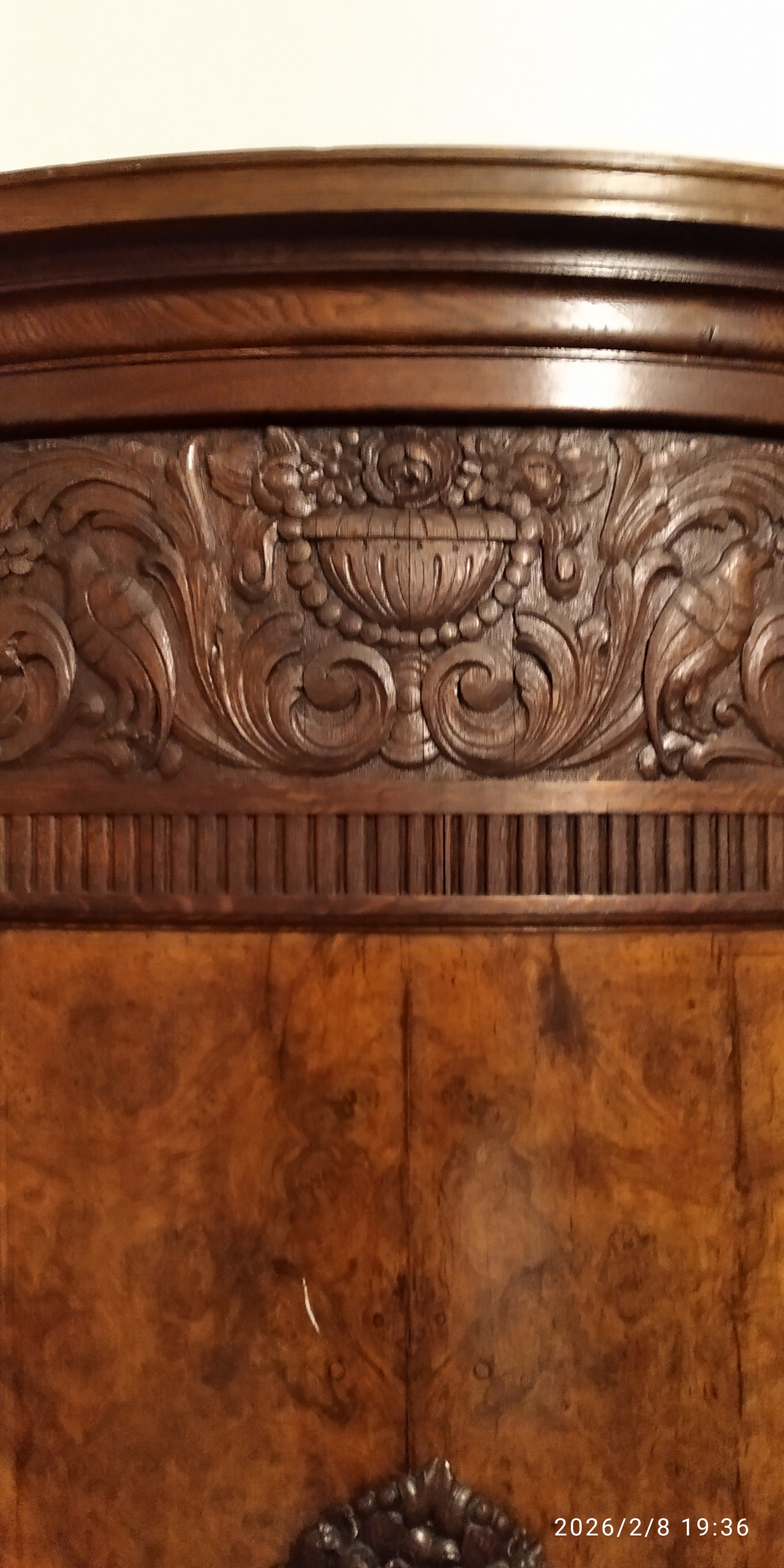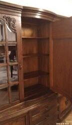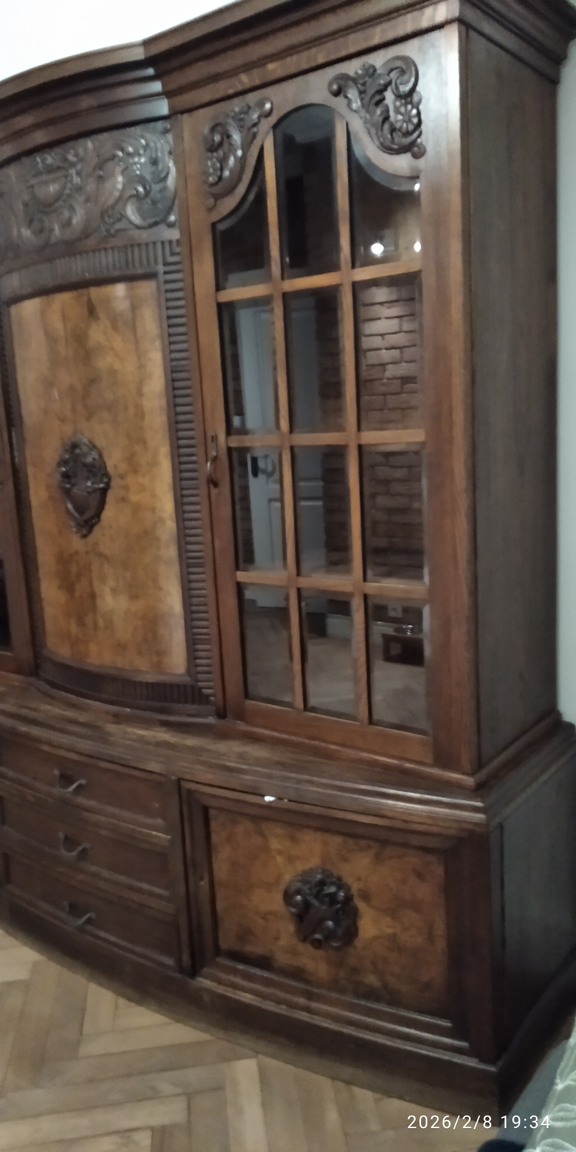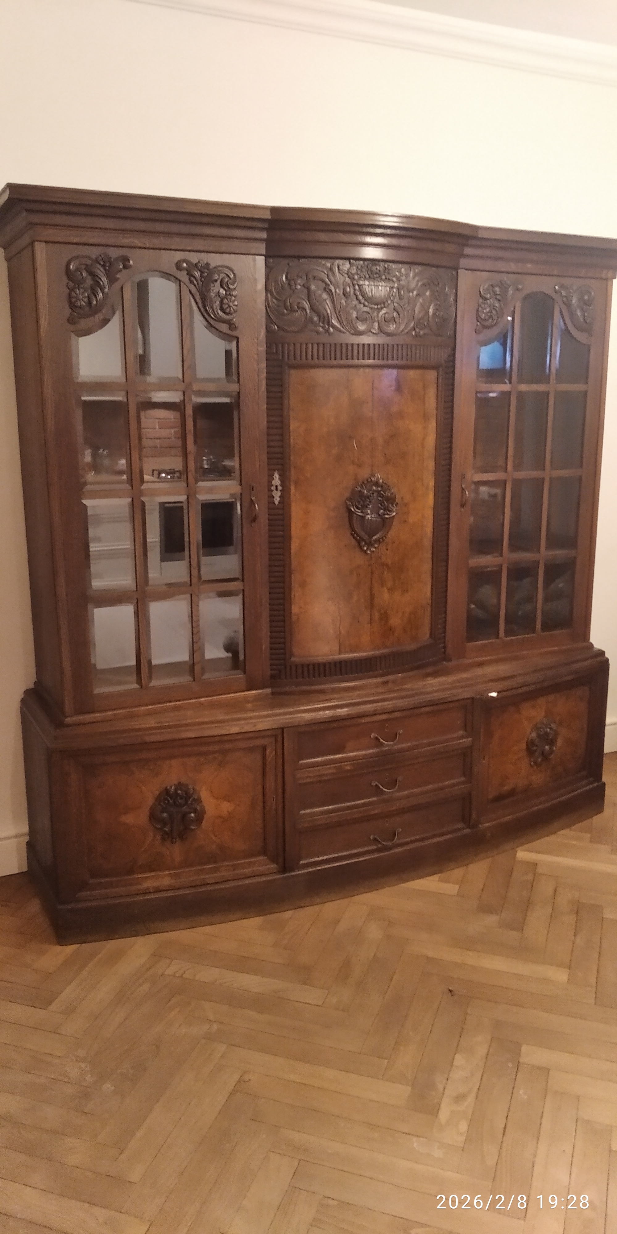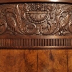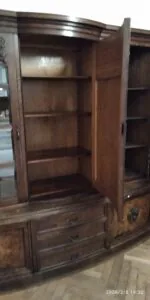 Witam Państwa, są to ponad stuletnie meble, z klasztoru w okolicach Rogalina koło Poznania przywiezione przez pradziadków do Poznania. Są w bardzo dobrym stanie, komoda i fotel są po renowacji, fotel obity skórą, cały czas przez nas przechowywane, wymiary komody, szerokość 192 cm. wysokość 203 cm. głębokość 47 cm. ANTYKI .Komplet mebli ANTYKI