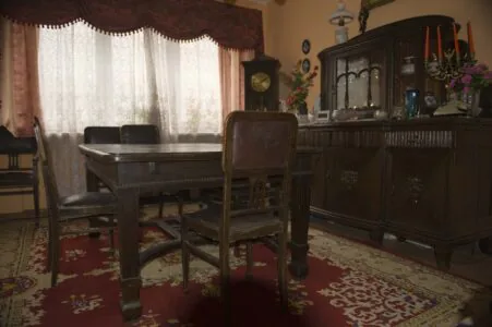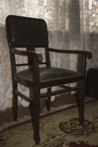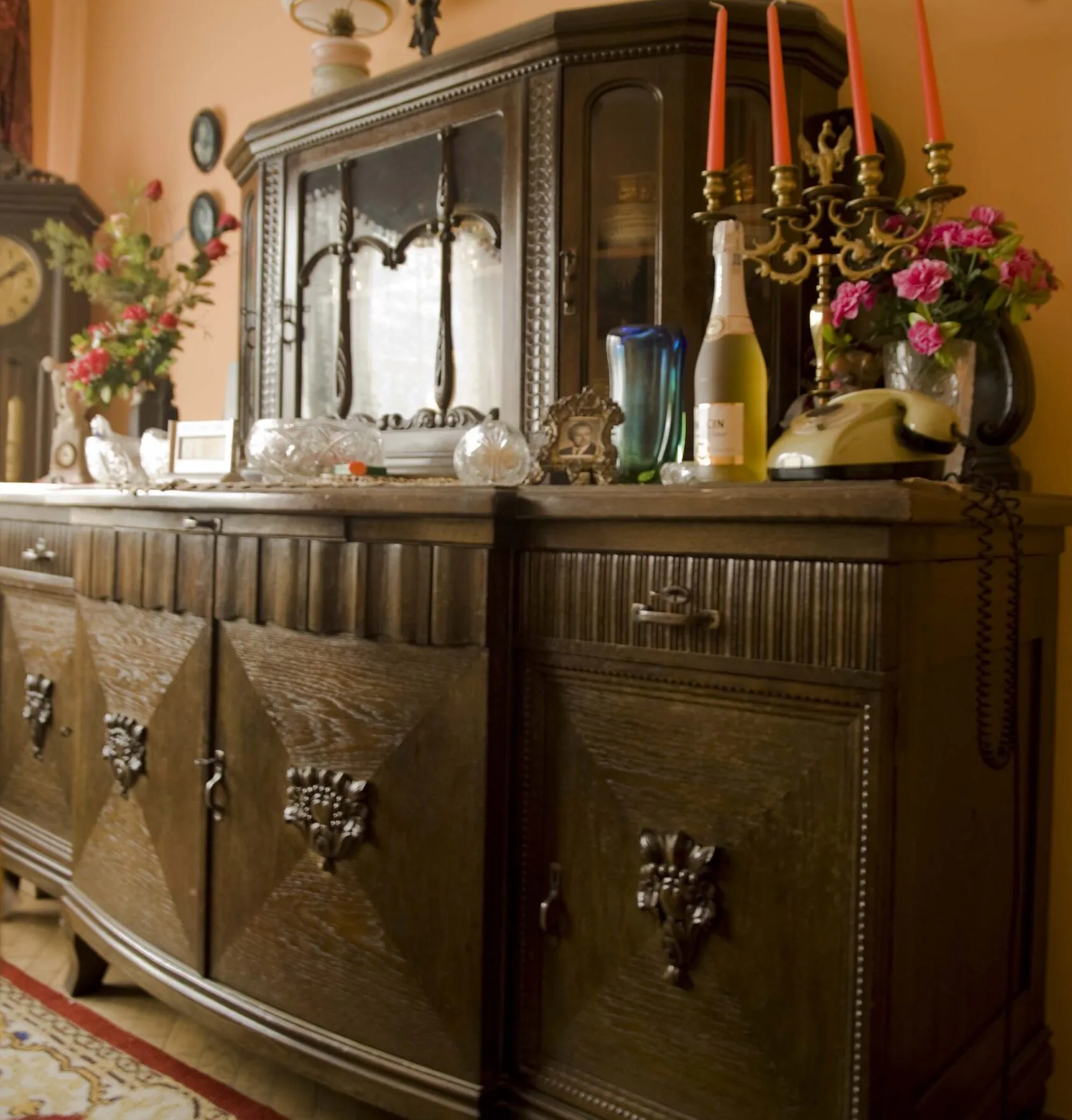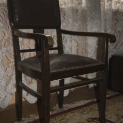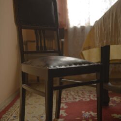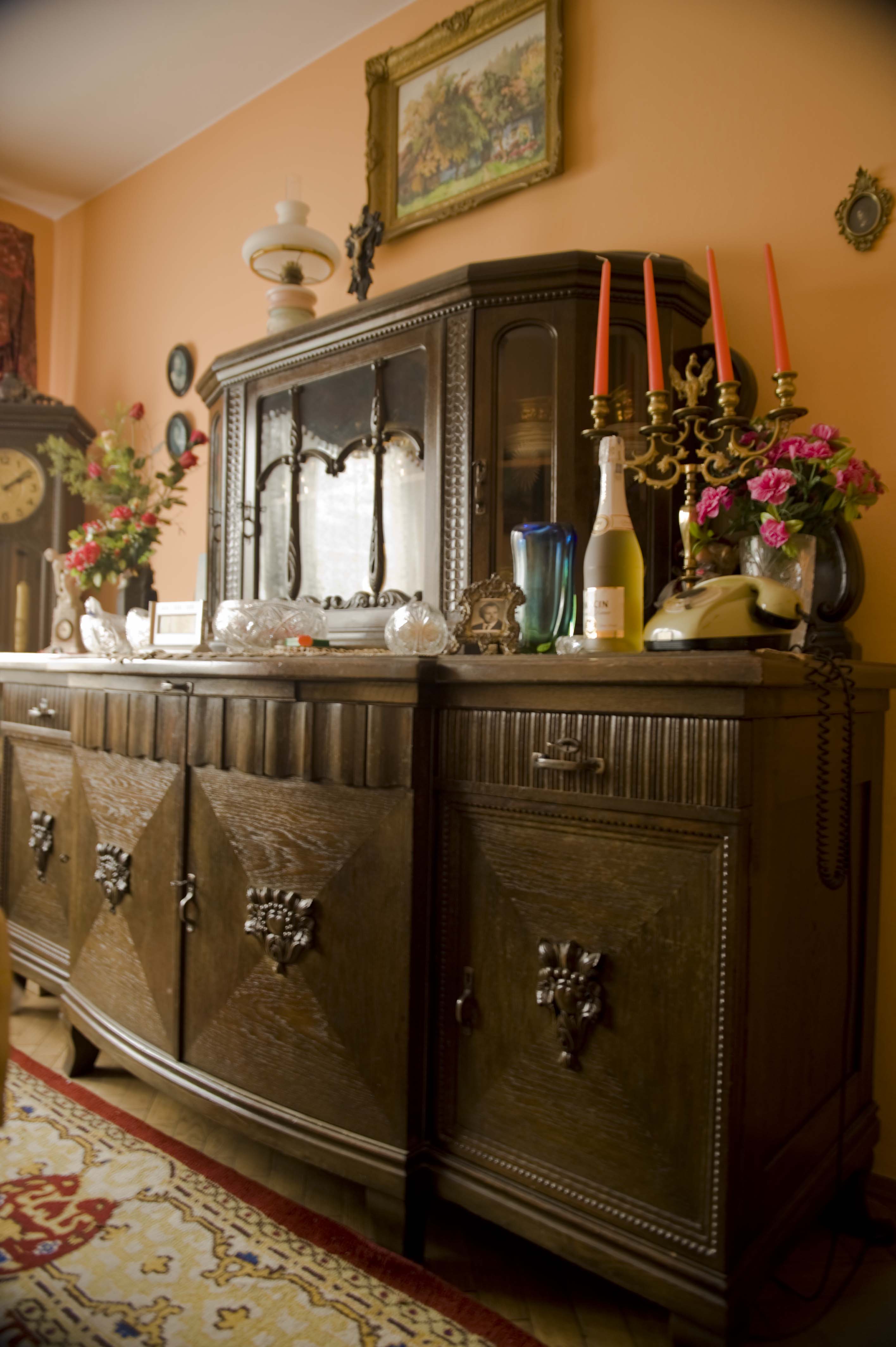 meble z Międzywojnia: kredens, stół i 6 krzeseł ze skórzanym siedziskiem. Stół do naprawy. 2 krzesła z podłokietnikami, 4 bez podłokietników. Meble z Międzywojnia . Meble z dwudziestolecia międzywojennego (1918–1939) to okres fascynującego przejścia od tradycyjnych, bogato zdobionych form do nowoczesnego modernizmu i luksusowego Art Déco. W polskim meblarstwie ten czas charakteryzował się poszukiwaniem stylu narodowego oraz wysoką jakością rzemiosła