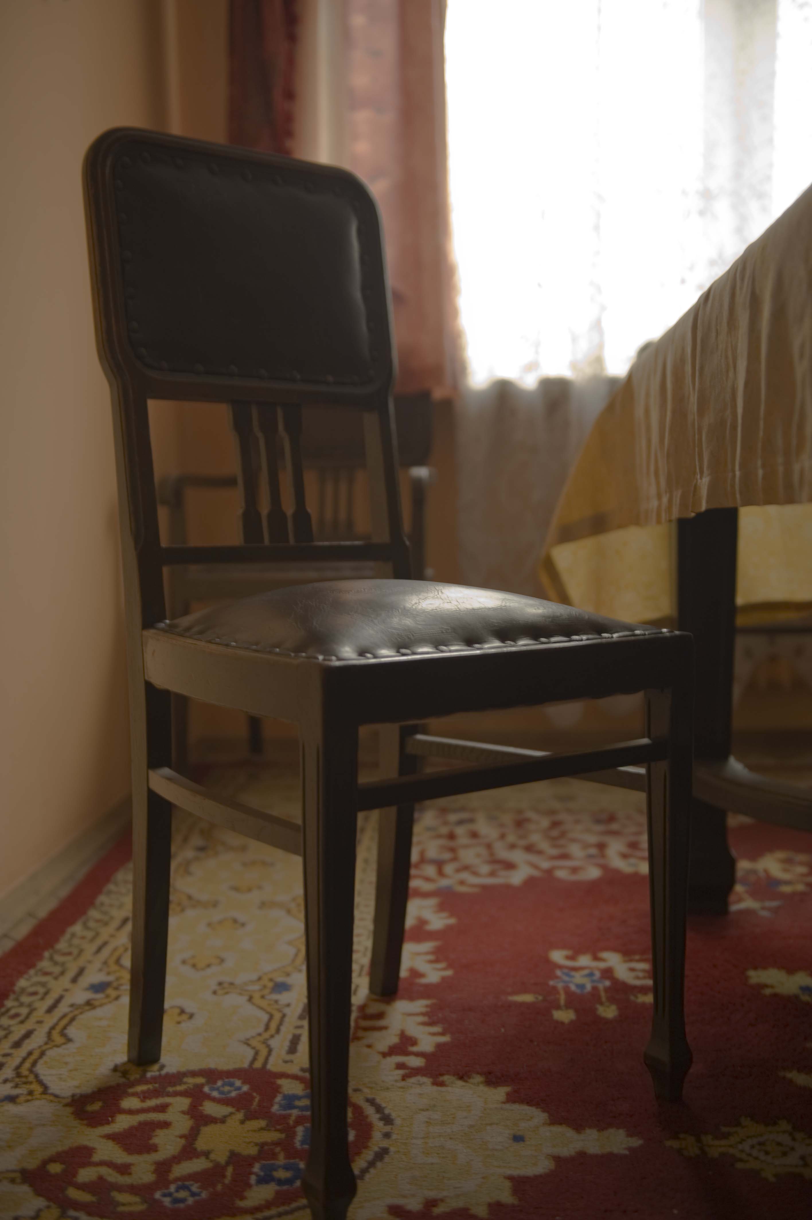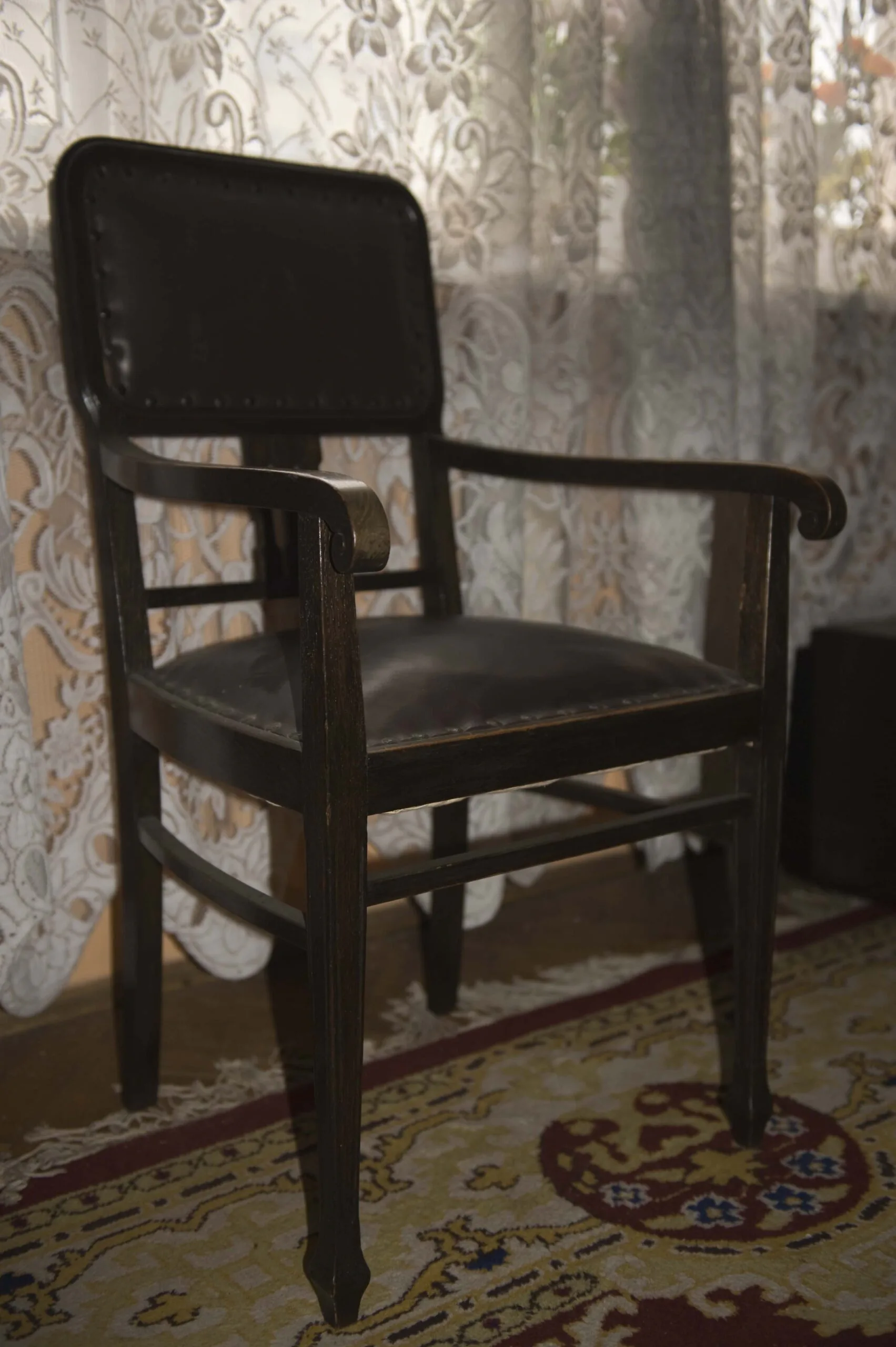 meble z Międzywojnia: kredens, stół i 6 krzeseł ze skórzanym siedziskiem. Stół do naprawy. 2 krzesła z podłokietnikami, 4 bez podłokietników. Meble z Międzywojnia . Meble z dwudziestolecia międzywojennego (1918–1939)...
