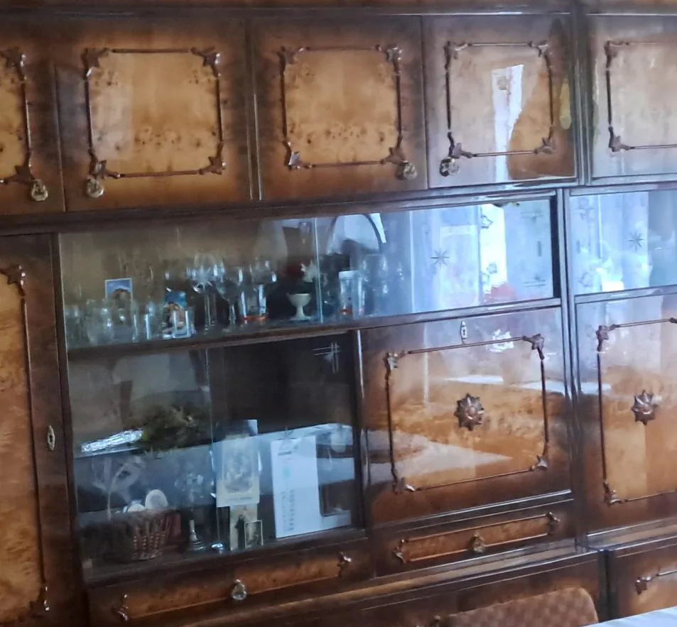 Widoczne na zdjęciu meble to kredensy i witryna w stylu Art Deco, datowane prawdopodobnie na lata 40 lub 50. XX wieku, wykonane z forniru orzechowego. Ten styl charakteryzuje się opływowymi kształtami i...