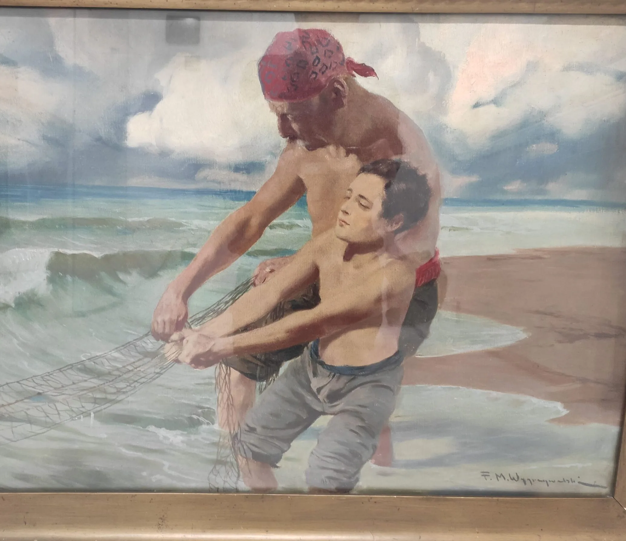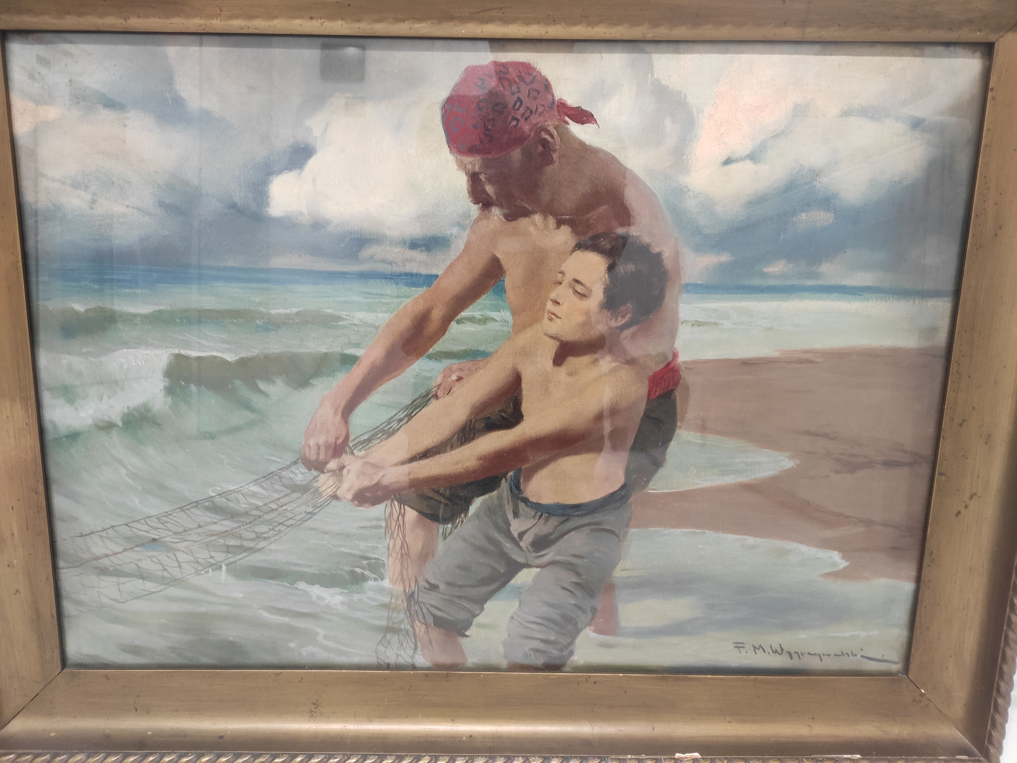 Obraz malowany na plotnie, olej , lata miedzywojenne,ok. 1925-1927r.. Autor F.M.Wygrzywalski ( ojciec) . Wielkosc plotna 70x50cm(bez ramy). Obraz za szyba( moga byc smugi z odbicia szkla. Feliks Michał Wygrzywalski (1875–1944) był polskim malarzem, grafikiem i scenografem, jednym z najpopularniejszych polskich artystów okresu międzywojennego. Zasłynął przede wszystkim jako mistrz nastrojowego malarstwa marynistycznego i orientalnego, a jego prace do dziś cieszą się dużym uznaniem na rynku aukcyjnym.