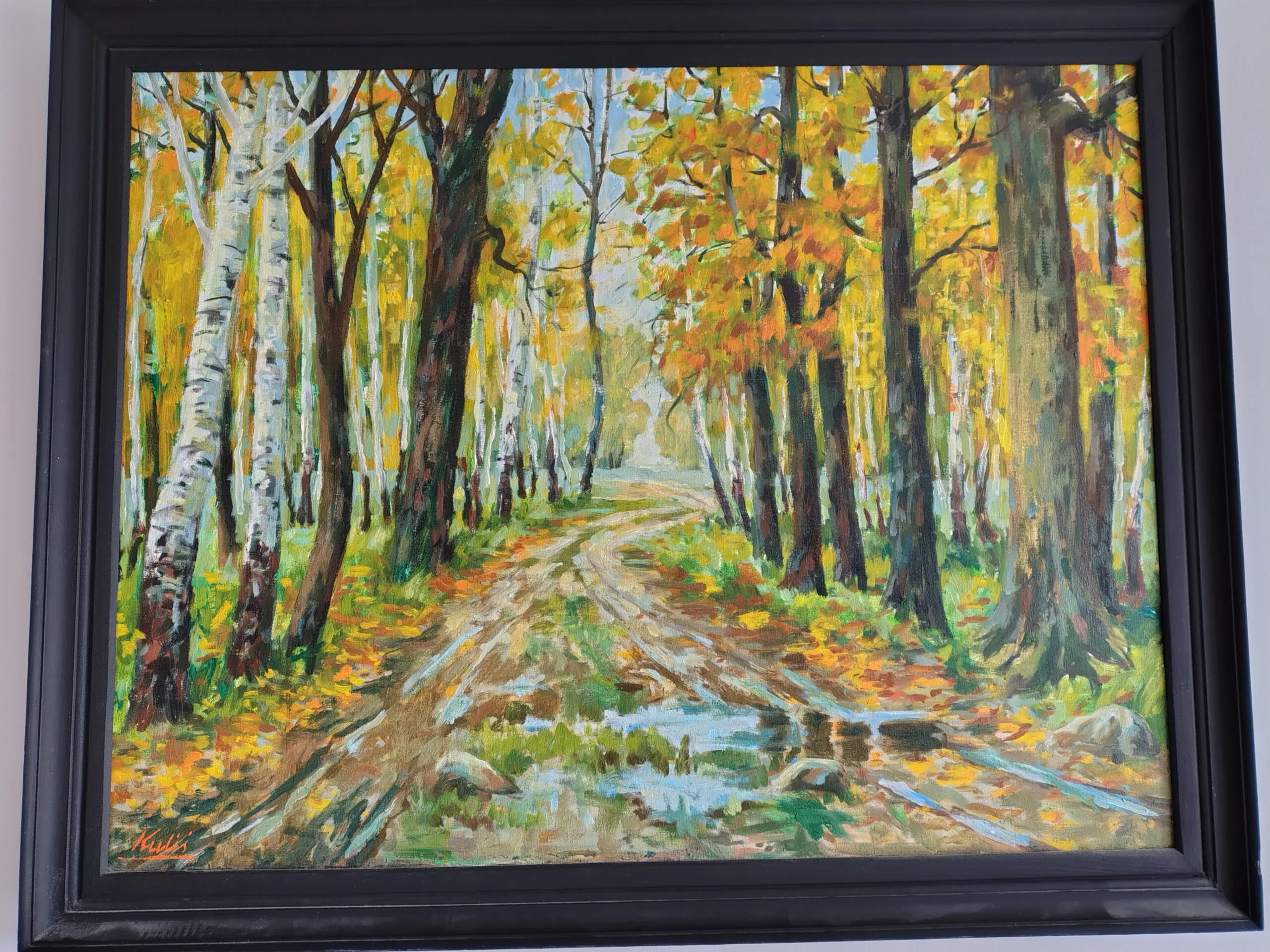 Obraz olejny "Jesienią przez las", piękne kolory polskiej złotej jesieni, ładnie prezentuje się na dużej ścianie . Obraz ma około 15 lat. Rama drewniana, wymiary bez ramy długość 104 cm...