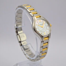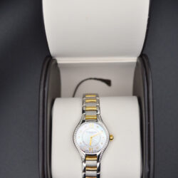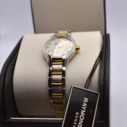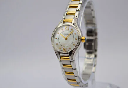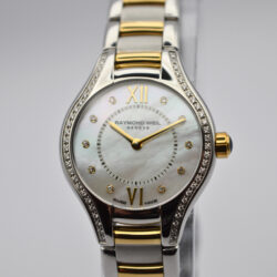Sprzedam zegarek Raymond Weil Noemia model: 5124-SPS-00985. Zegarek posiada złote indeksy na tarczy i złote elementy w bransolecie. Tarcza z masy perłowej oraz ramka w około są wysadzane diamentami. Zegarek jest nowy,powystawowy – z oryginalnym pudełkiem ale bez dokumentów. Istnieje możliwość weryfikacji stanu i autentyczności przed zakupem.