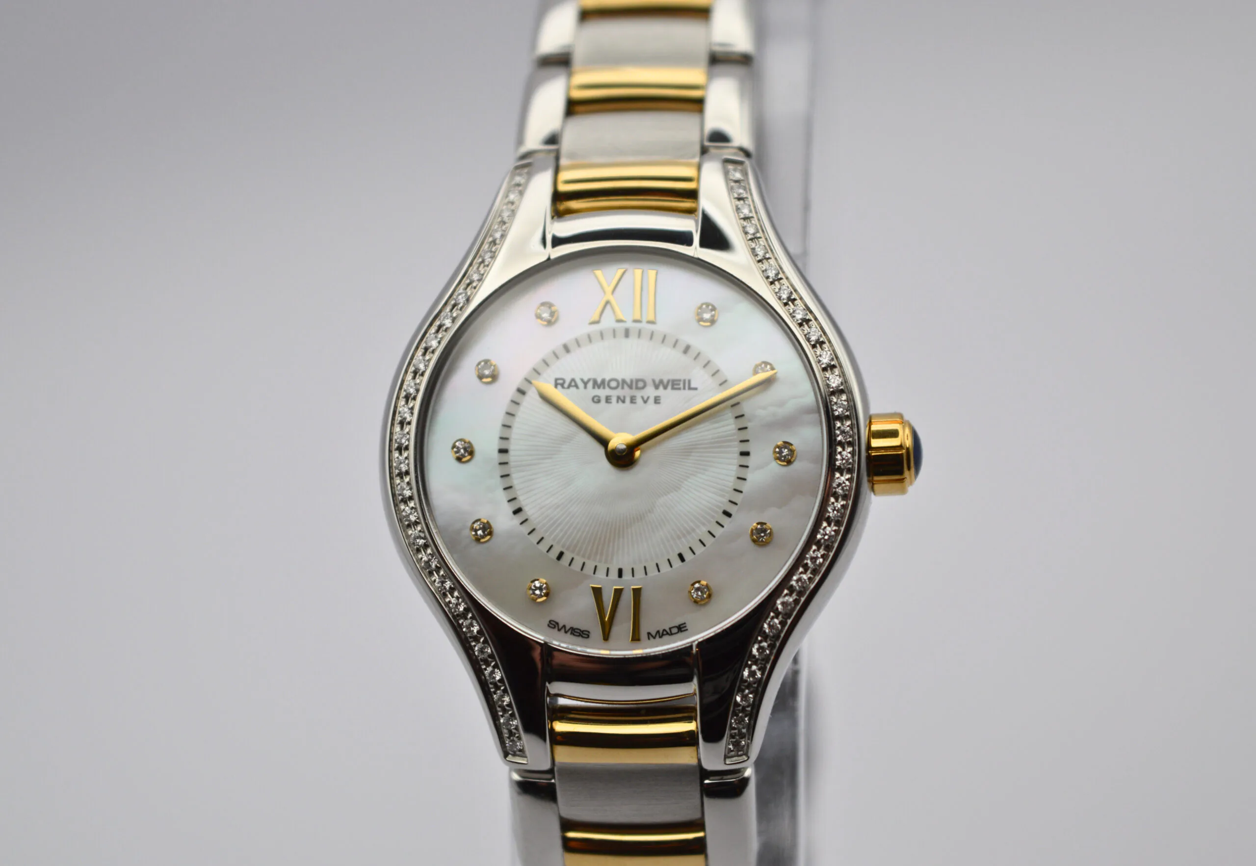 Sprzedam zegarek Raymond Weil Noemia model: 5124-SPS-00985. Zegarek posiada złote indeksy na tarczy i złote elementy w bransolecie. Tarcza z masy perłowej oraz ramka w około są wysadzane diamentami. Zegarek...