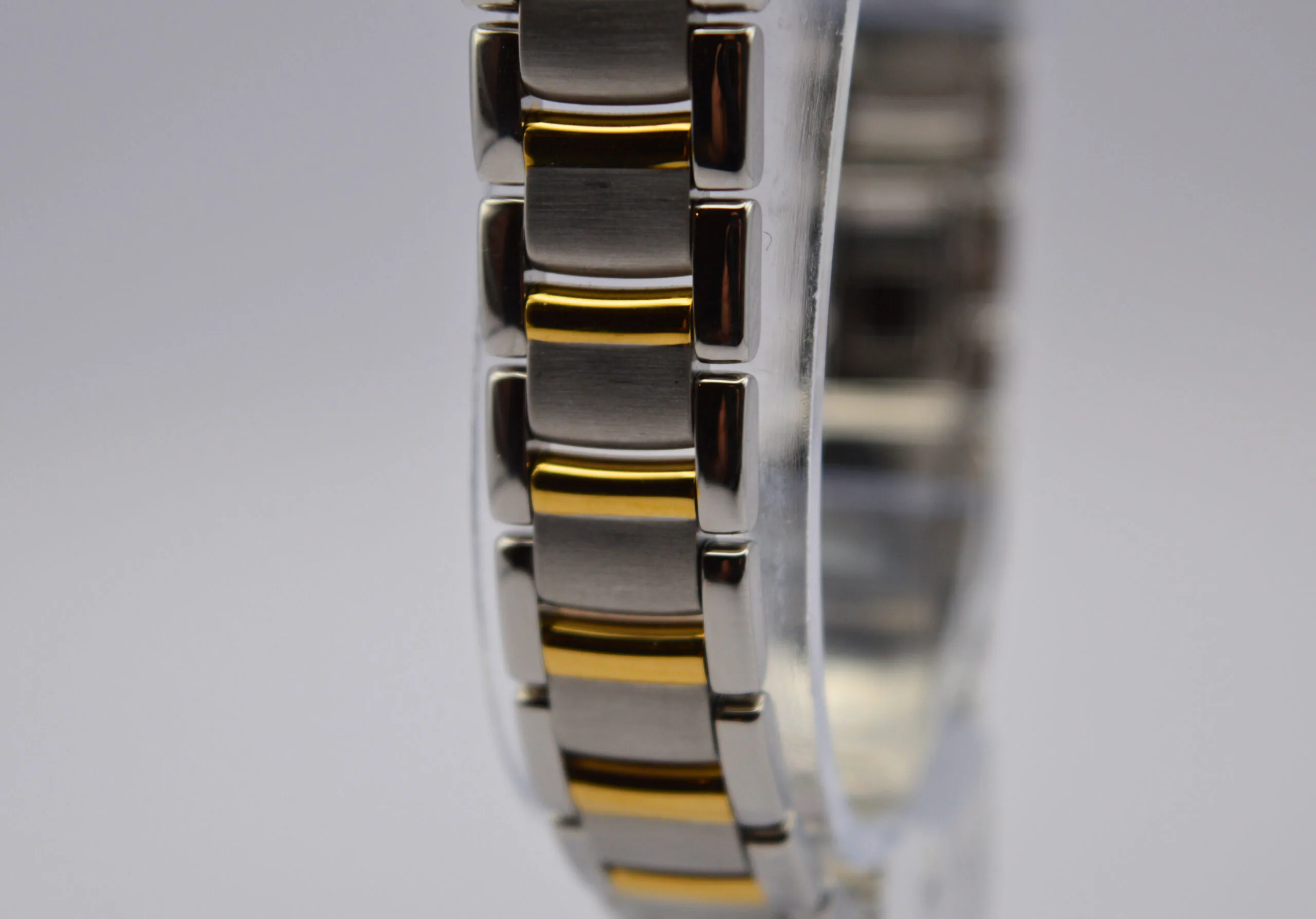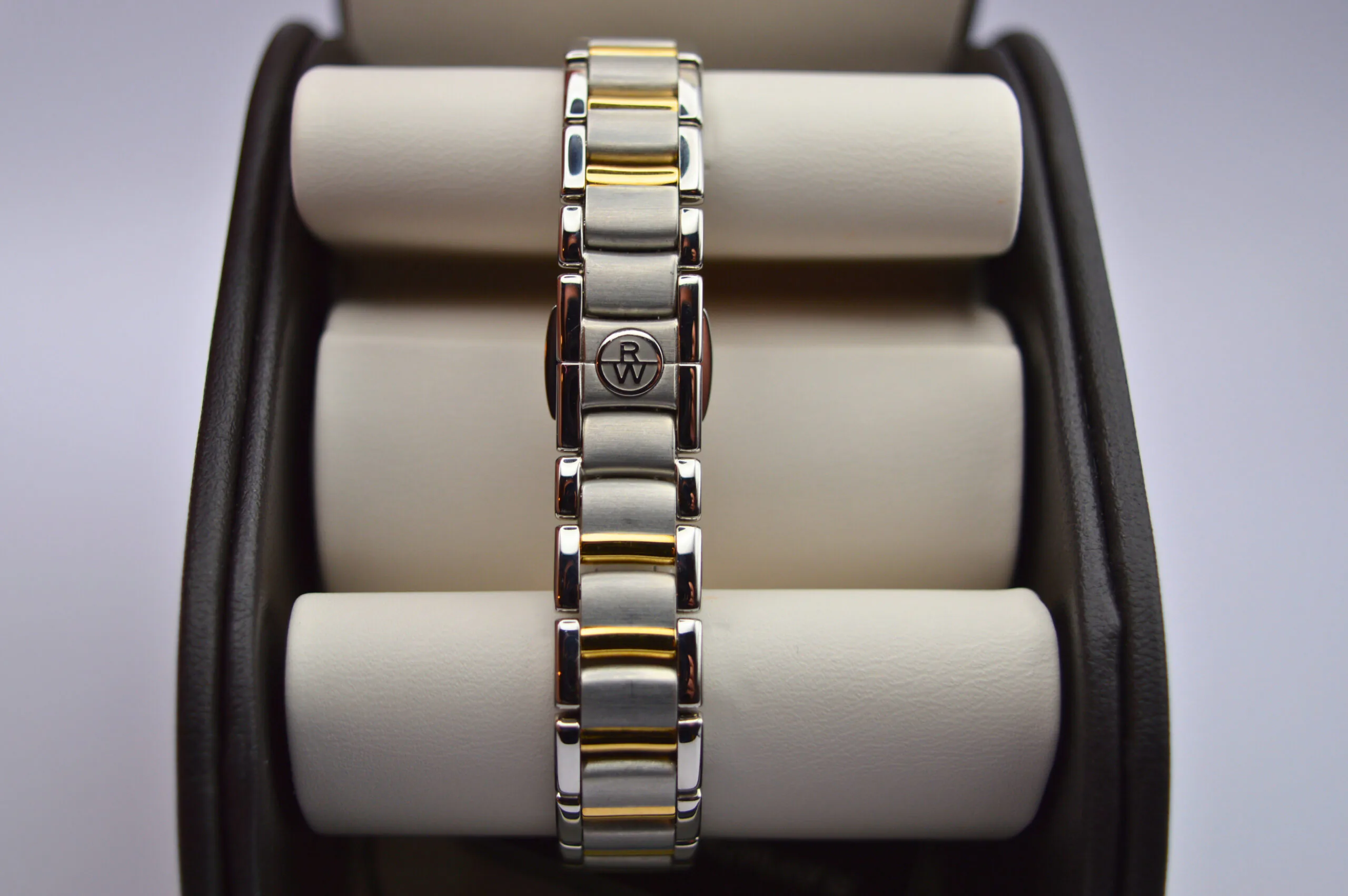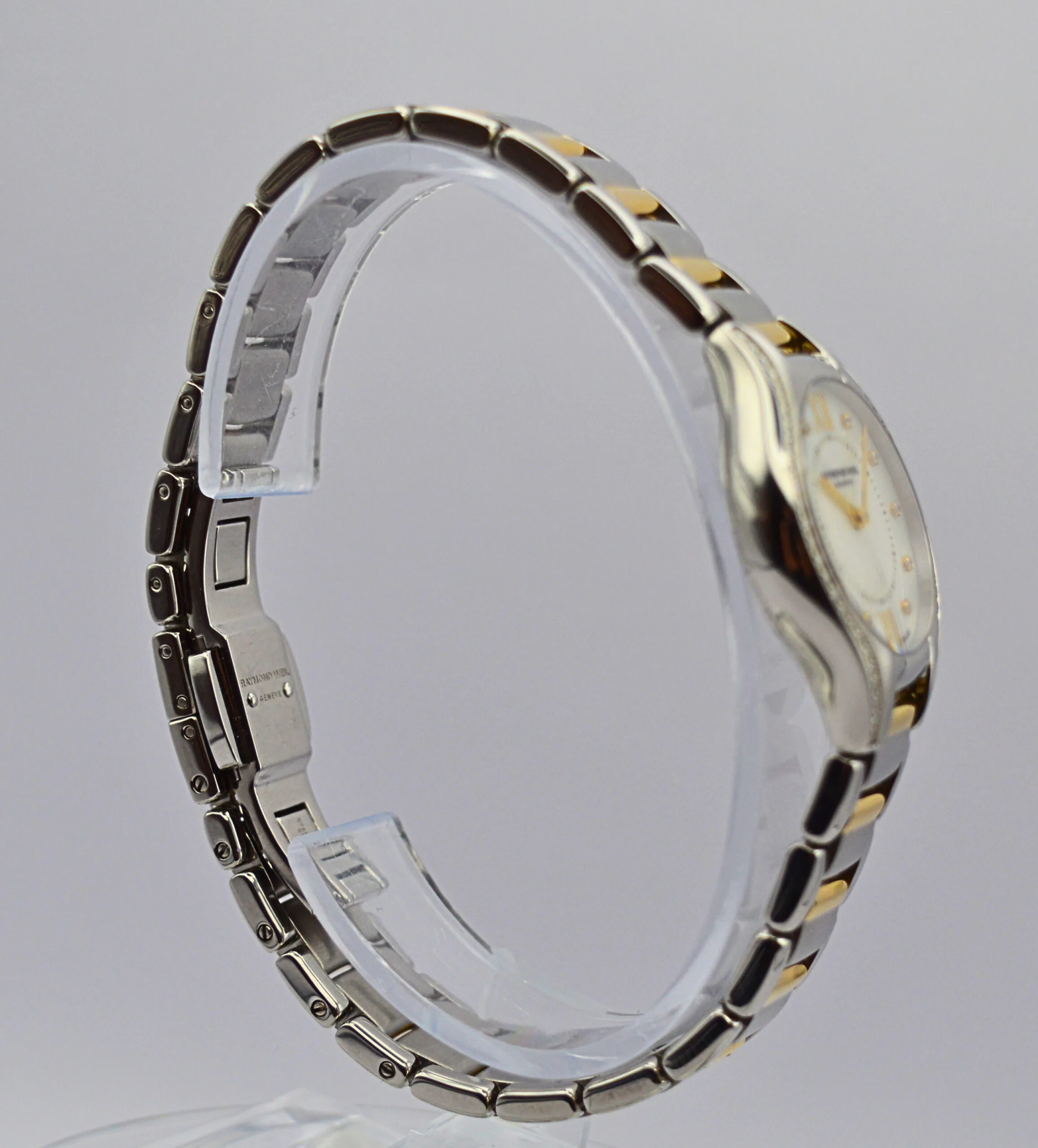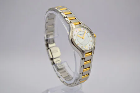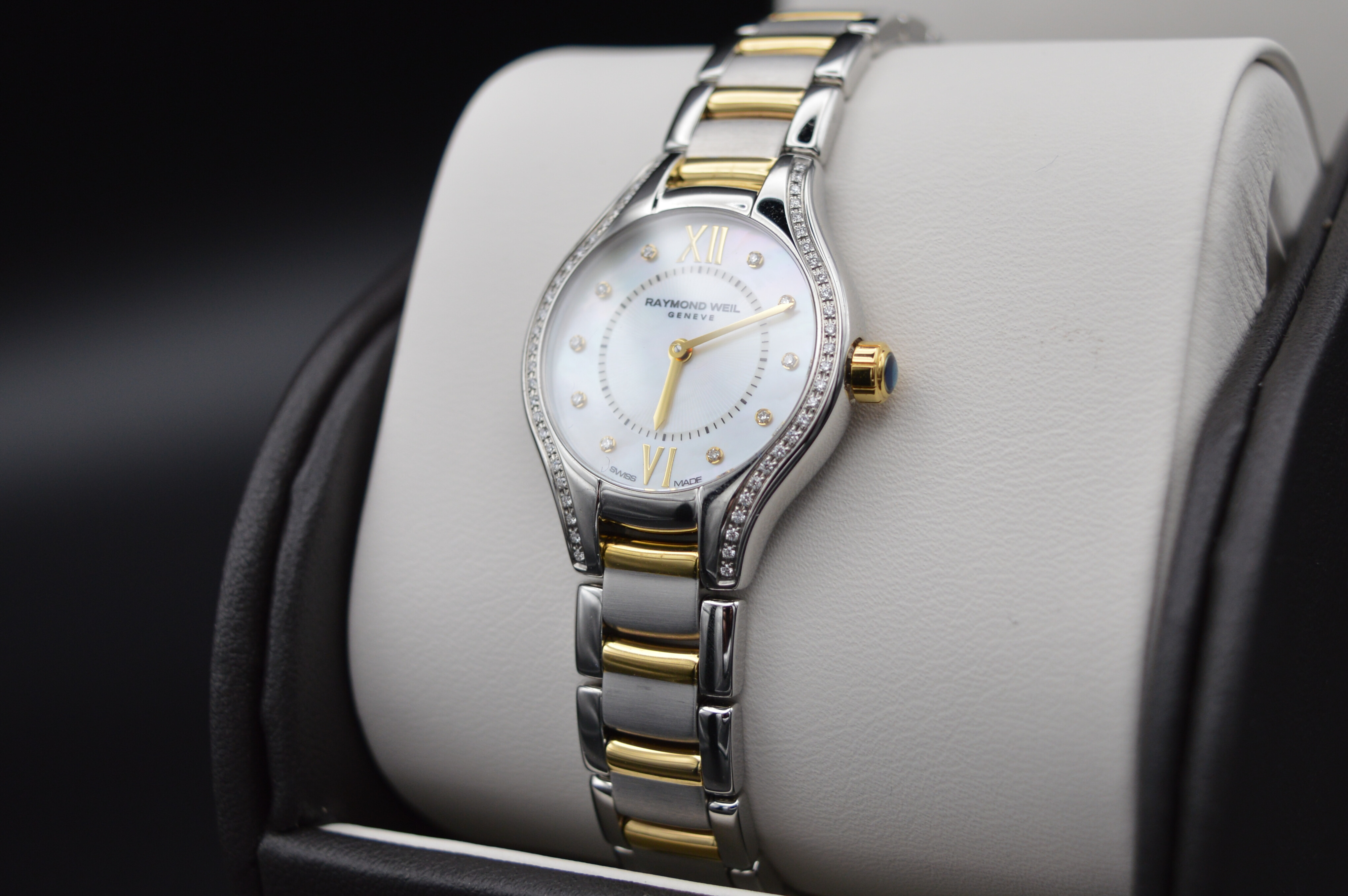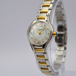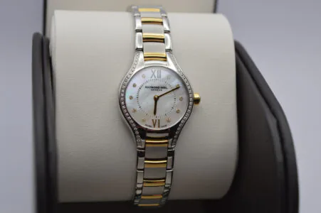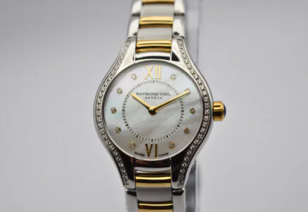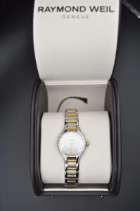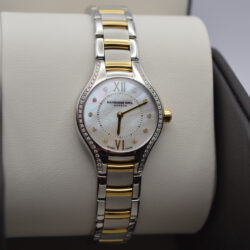 Sprzedam zegarek Raymond Weil Noemia model: 5124-SPS-00985. Zegarek posiada złote indeksy na tarczy i złote elementy w bransolecie. Tarcza z masy perłowej oraz ramka w około są wysadzane diamentami. Zegarek jest nowy,powystawowy – z oryginalnym pudełkiem ale bez dokumentów. Istnieje możliwość weryfikacji stanu i autentyczności przed zakupem.