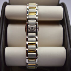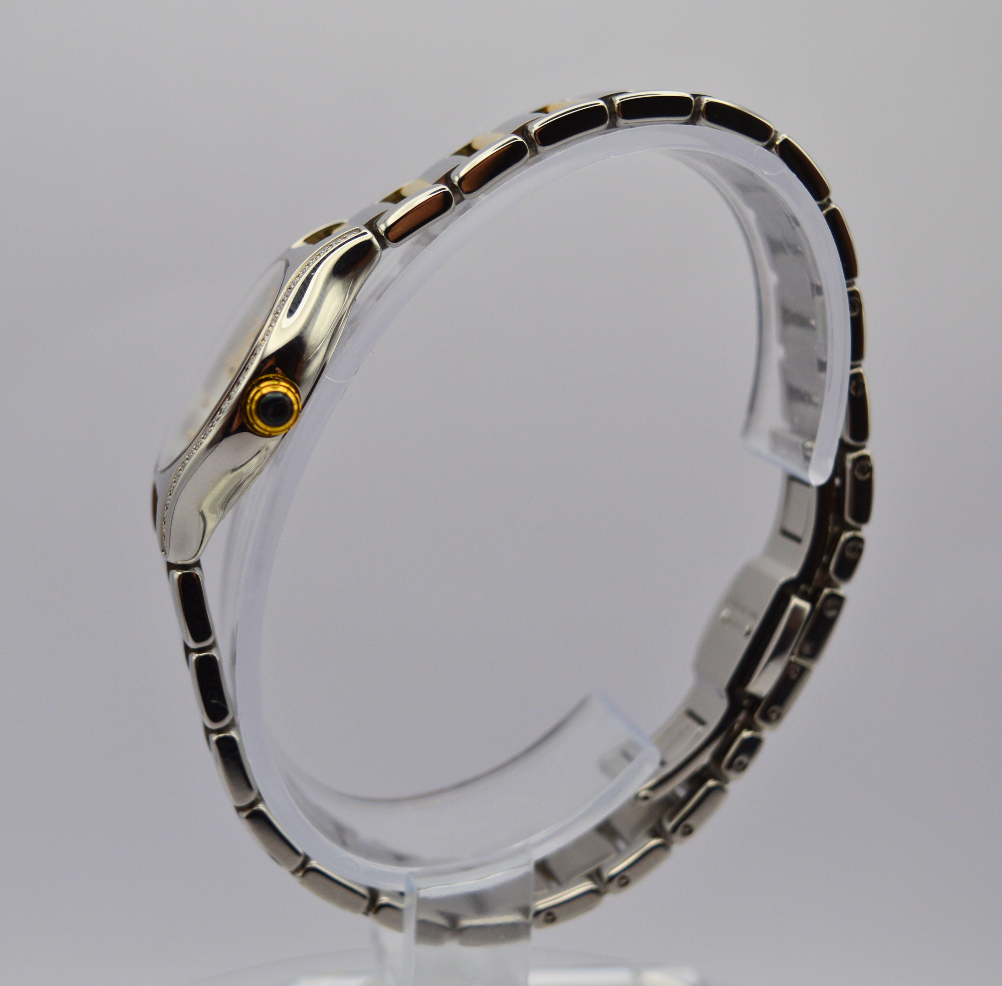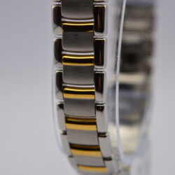 Zegarek w stanie bardzo dobrym, posiada bransoletkę skórzaną z aligatora, jak i wymienną biżuteryjną w kolorze srebrnym. Tarcza z białej masy perłowej wykładana 12 brylantami Top Wesselton VS-SI, o łącznej...