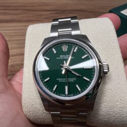 Rolex Oyster Perpetual 31 mm Ref. 277200 z zieloną tarczą, pełnym zestawem i w idealnym stanie (kupiony w polskim salonie w 2024 W.Kruk). Rolex Oyster Perpetual 31 mm to klasyczny, elegancki zegarek naręczny wykonany w całości ze stali Oystersteel, charakteryzujący się czystą formą bez dodatkowych komplikacji (jak np. datownik). Model ten (ref. 277200) łączy w sobie historyczną wodoszczelność koperty Oyster z automatycznym naciągiem Perpetual, stanowiąc fundament współczesnego zegarmistrzostwa marki. Stan jak nowy!!!