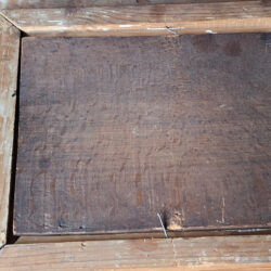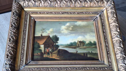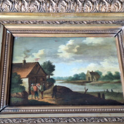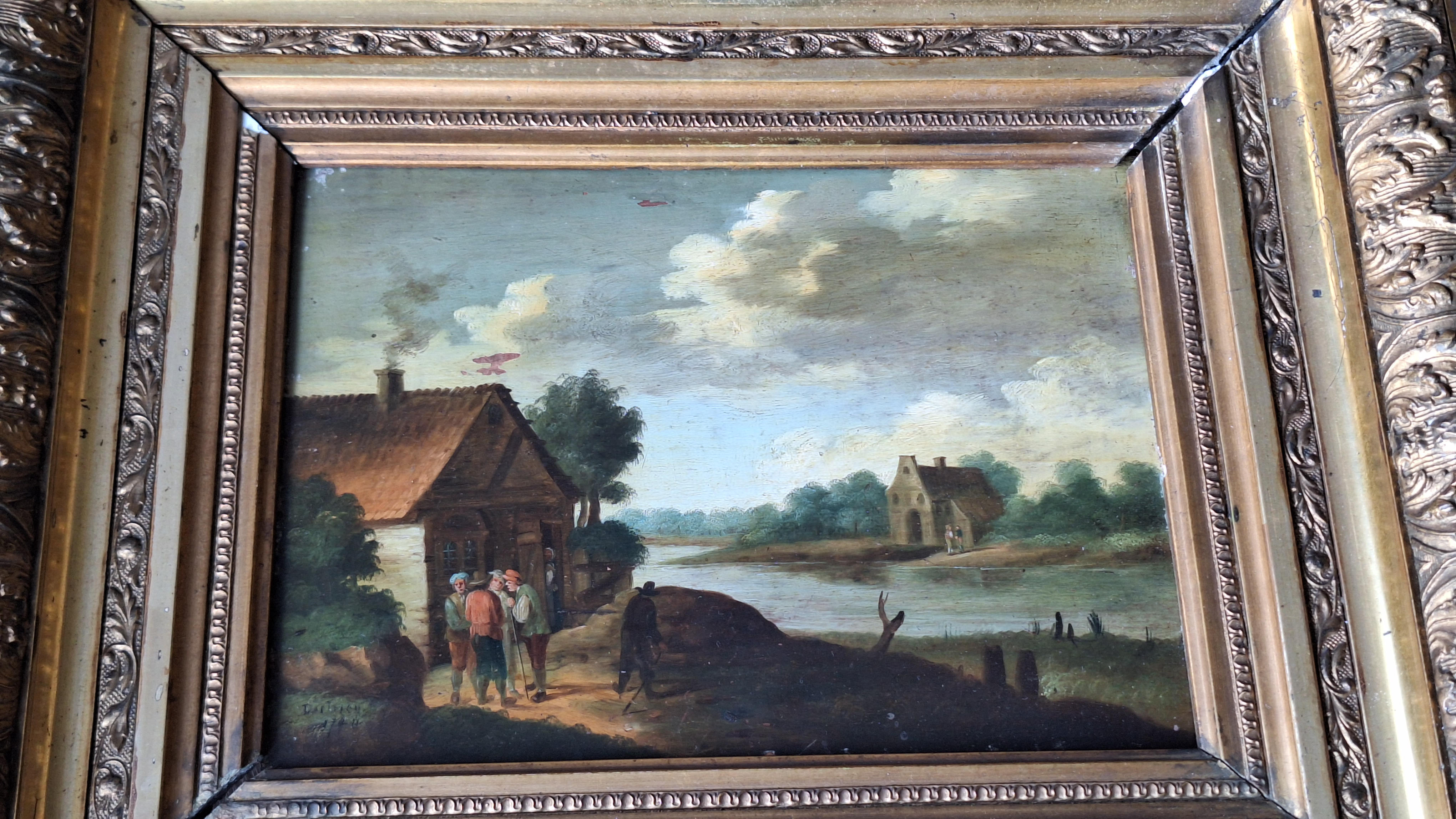 Malowniczy pejzaż przectawiający spokojną scenę wiejską, grupę postaci stojących przy chacie z czerwonym dachem tuż przy rzece. Kompozycja jest harmonijna pełna detali charakterystycznych dla malarstwa z XVII-XVIIIwieku. Rama drewniana bogato zdobiona do renowacji.