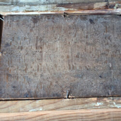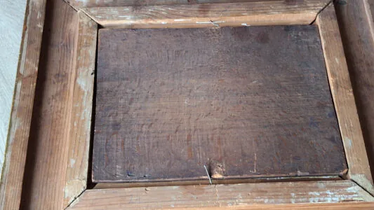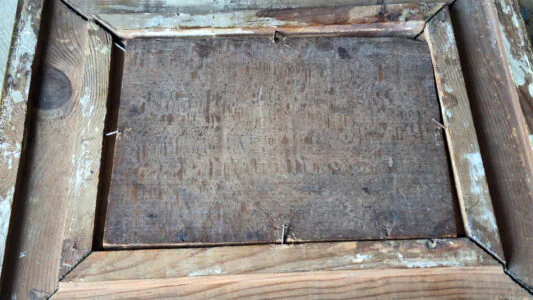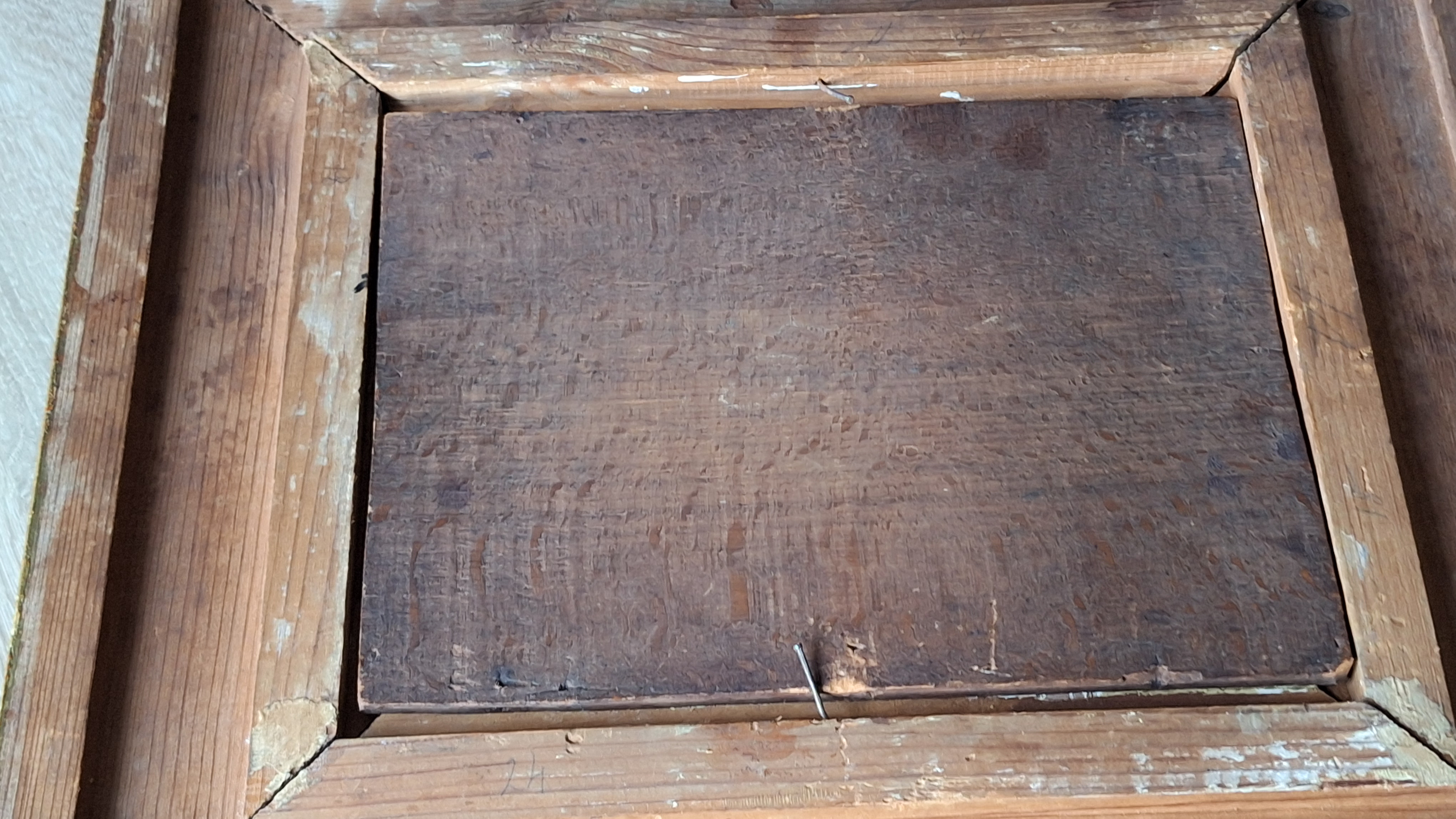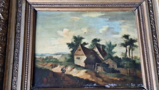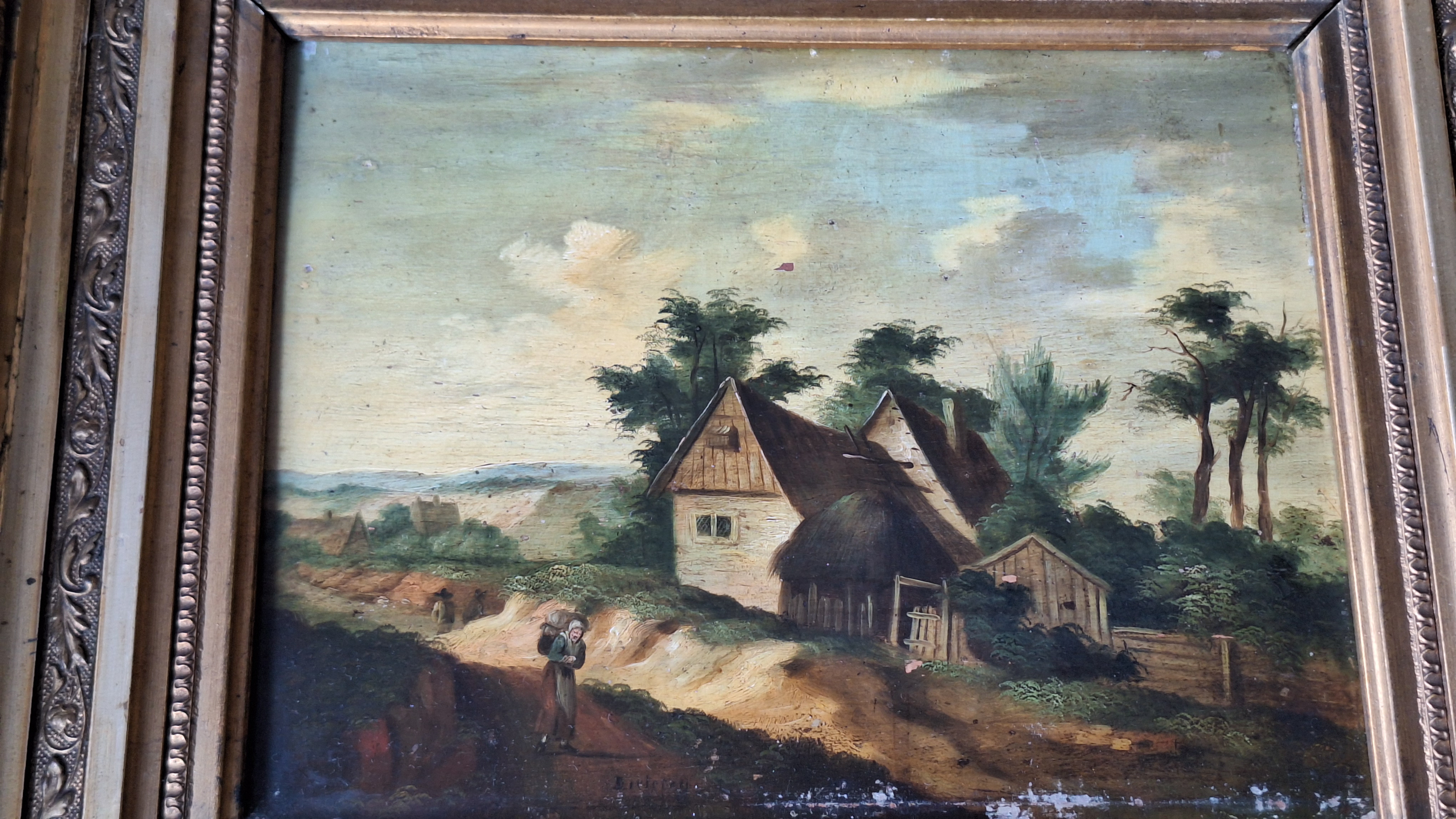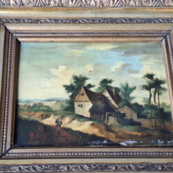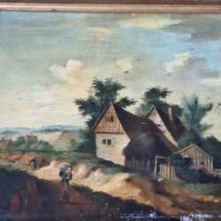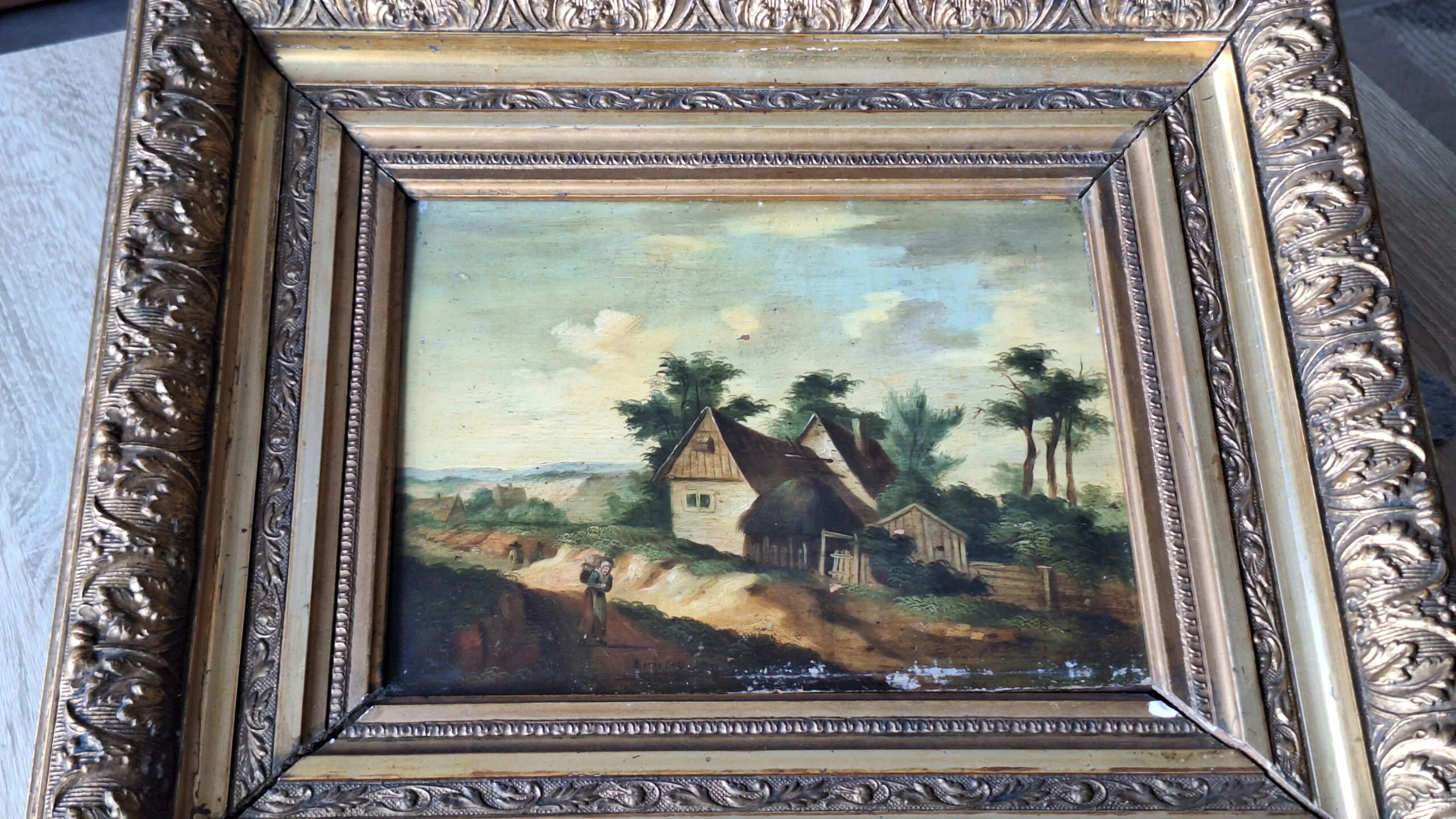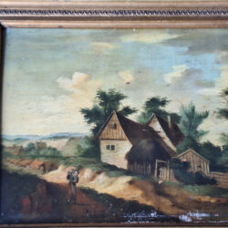 Malowniczy pejzaż przectawiajcy kobietę idącą wiejską drogą, prowadzącą obok tradycyjnych chat krytych strzechą. Obraz wyróżnia się naturalnym światłem, charakterystyczny dla malarstwa z XVII wieku. Rama drewniana bogato zdobiona do renowacji.
