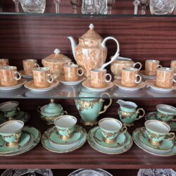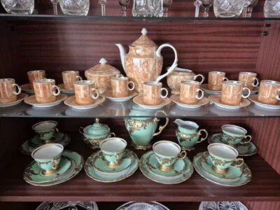 Sprzedam 2 zestawy kawowe z porcelany.. Zestaw łososiowy Karolina. Zestaw zielony malowany ręcznie Wawel. Porcelana stała w witrynie i nie była używana. Zestawy w kolorze łososiowym (często określanym też jako brzoskwiniowy lub różowy) były często dekorowane złotymi paskami lub delikatnymi motywami kwiatowymi. Ponieważ fabryka ogłosiła upadłość w 2024 roku, nowe zestawy są trudne do zdobycia. Można je znaleźć głównie na portalach aukcyjnych