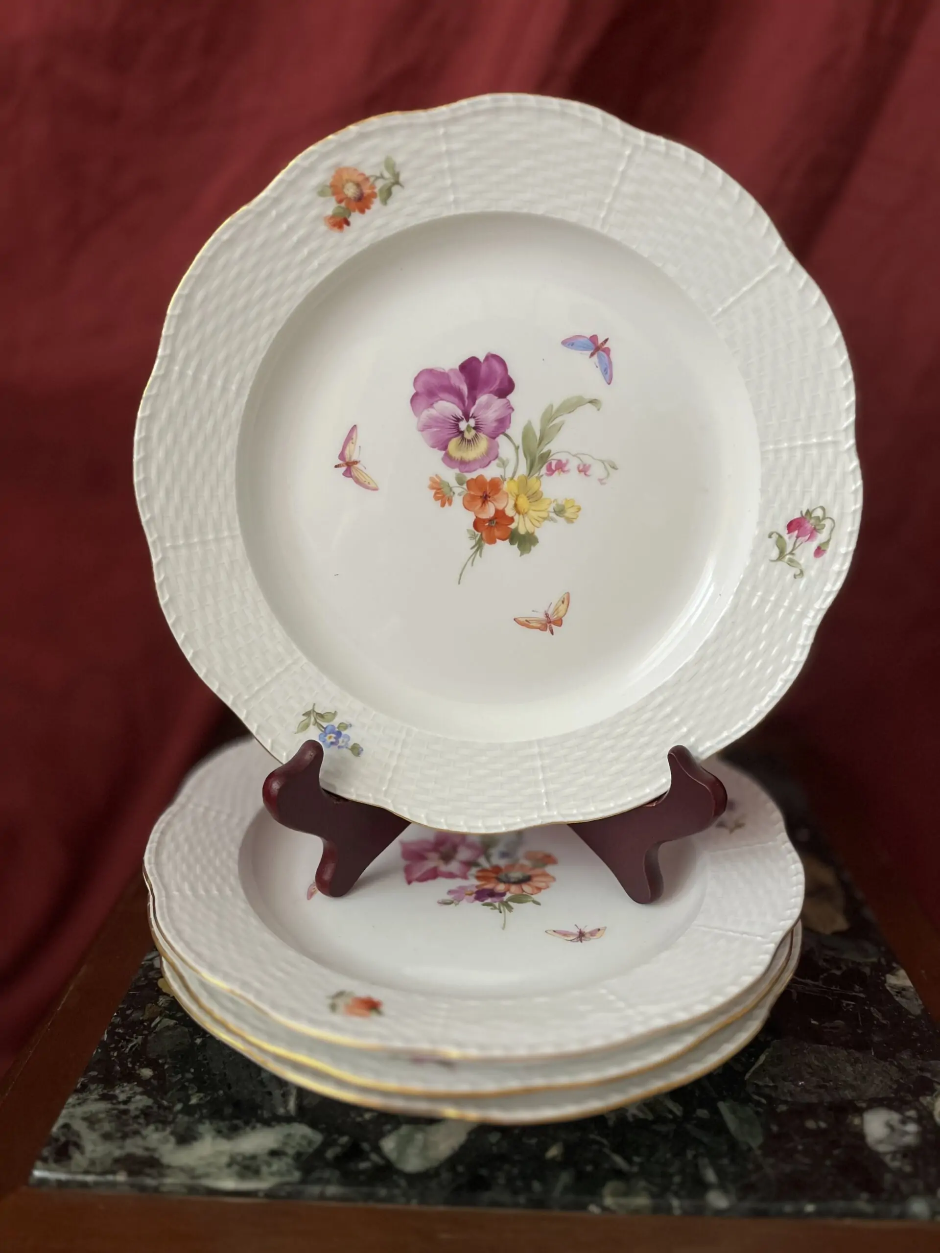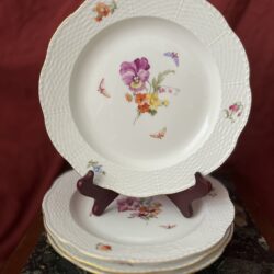 5 talerzy KPM. 4 duże talerze obiadowe 26×26. 1 spodek do filiżanki o wymiarach 16×16 cm Sygnowany m.in. znakiem berła i literą „F” oznaczającą rok 1906 (patrz zdjęcie). Sygnowany m.in. znakiem berła i literą „M” oznaczającą rok 1912 (patrz zdjęcie). Sygnowany m.in. znakiem berła i literą „T” oznaczającą rok urodzenia 1919 (patrz zdjęcie).