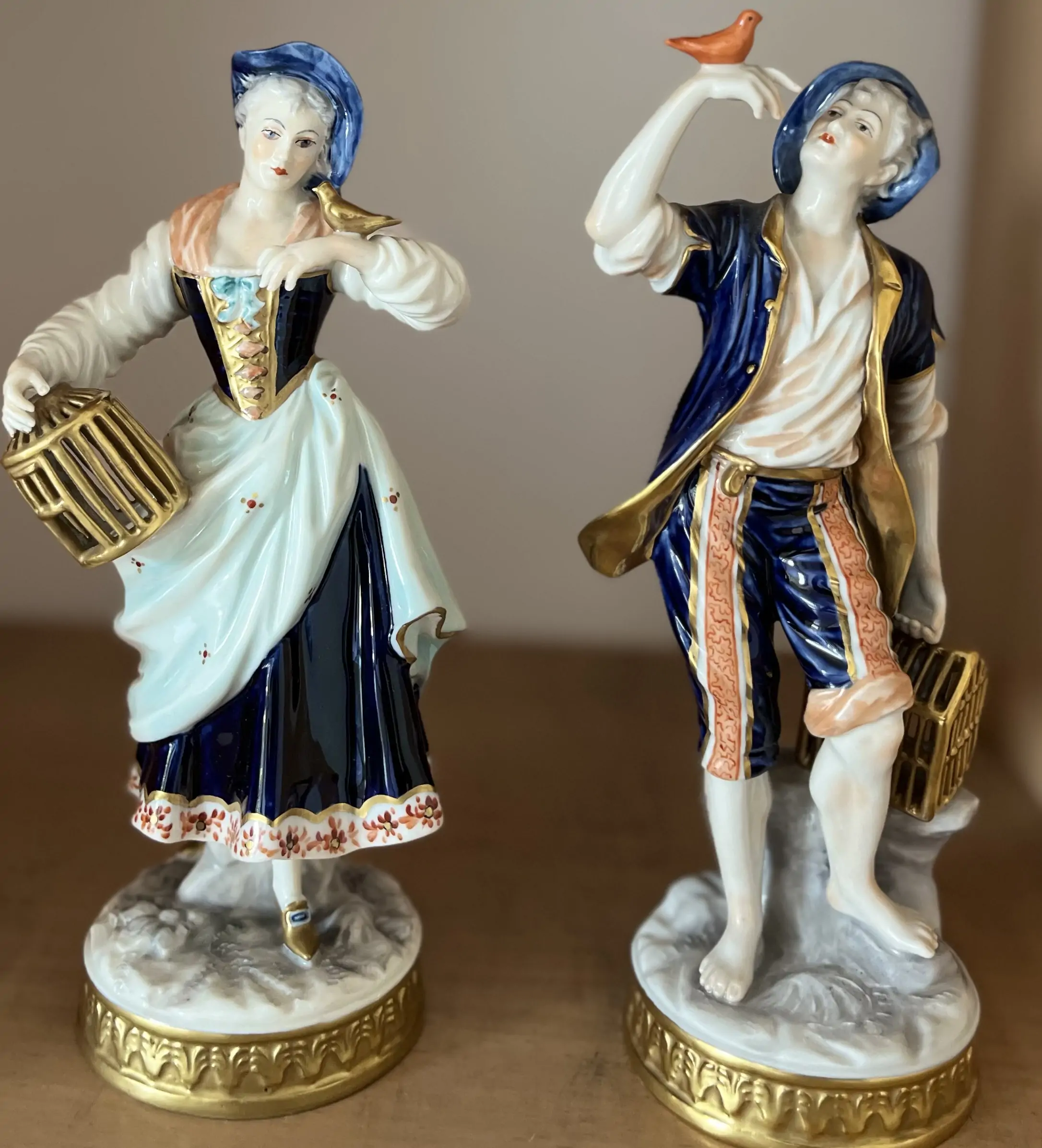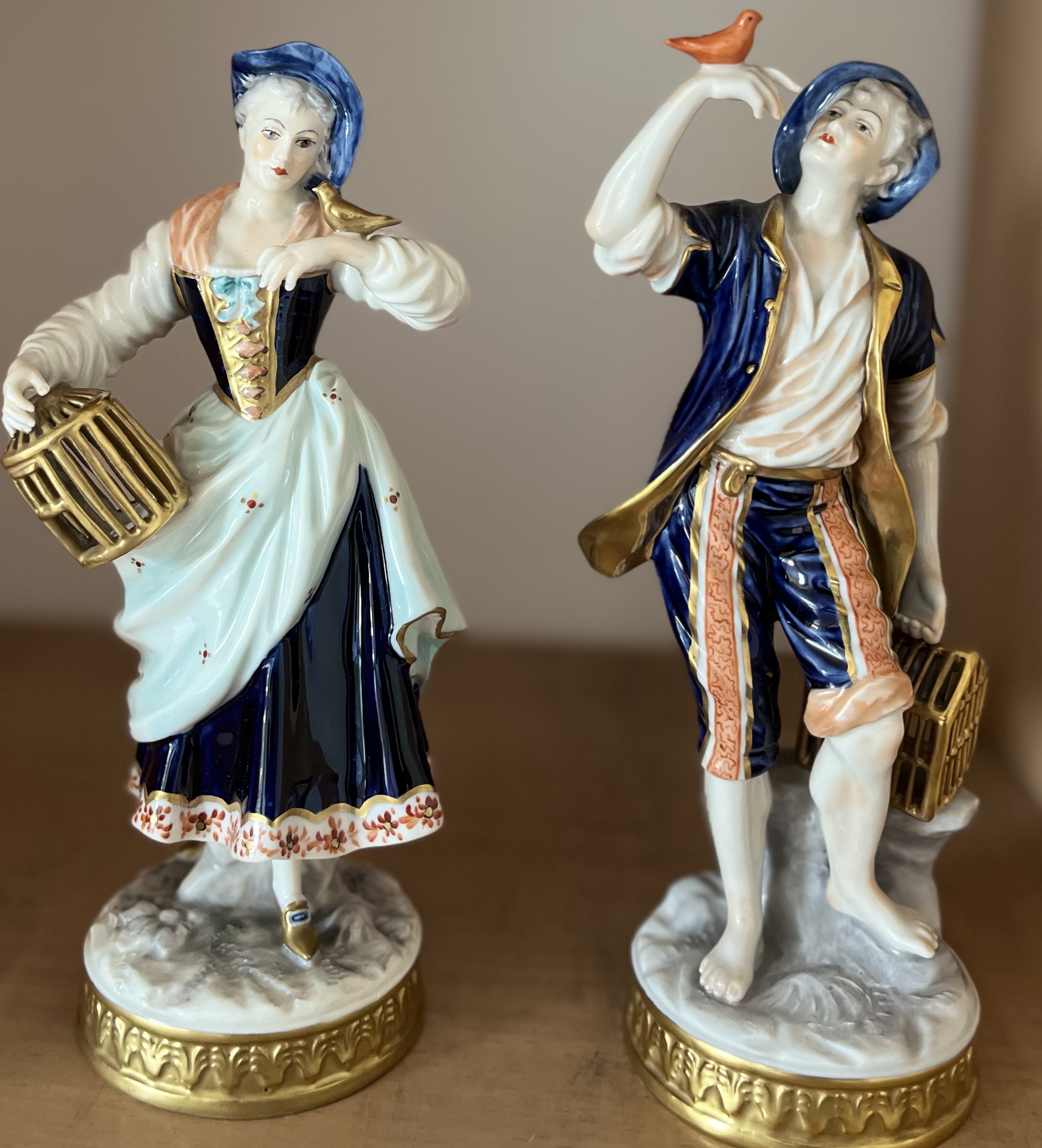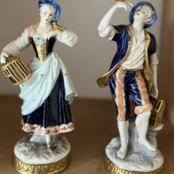 Dwie figurki „Sprzedawcy ptaków” Aelteste Volkstedter Porzellanfabrik, Niemcy. Wykonane w latach 1945-1990.