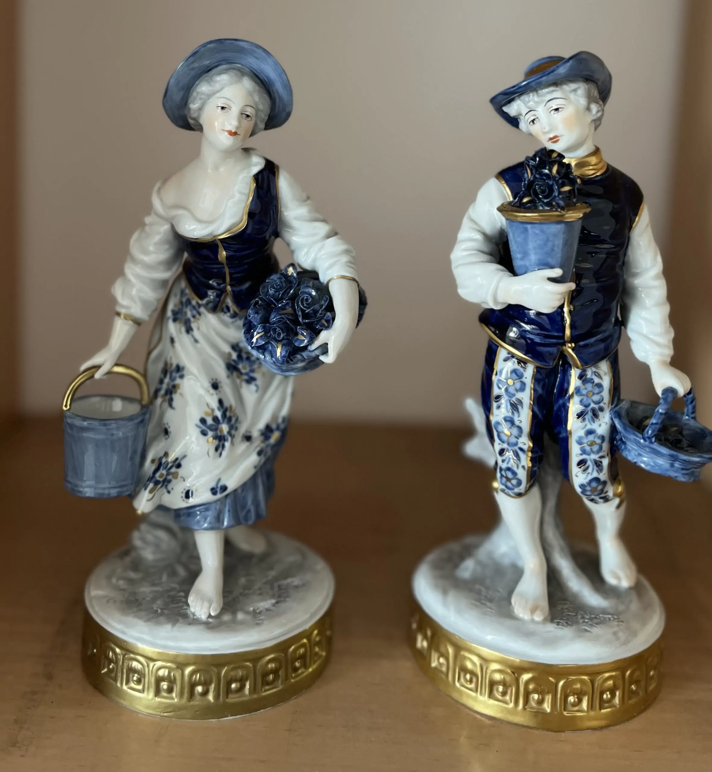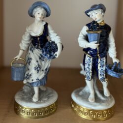 Dwie figurki „Sprzedawców kwiatów” firmy Aelteste Volkstedter Porzellanfabrik, Niemcy. Wykonane w latach 1945-1990.