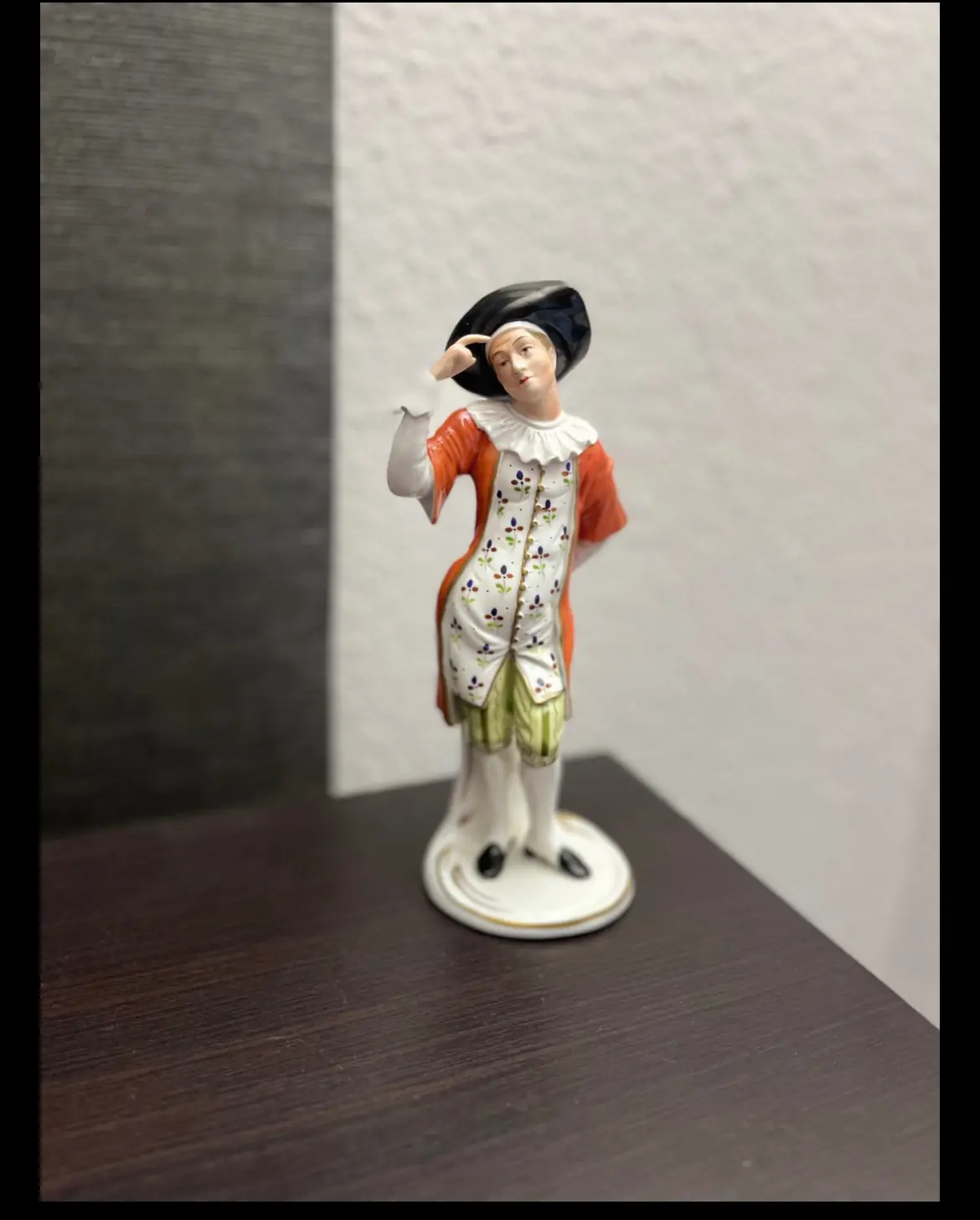 Figurka Dottore oparta na fabule Commedia Dell`Arte została wykonana przez wykwalifikowanych rzemieślników z prawdziwej porcelany w stylu barokowym w fabryce Ernst Bohne & Sohne Niemcy. U dołu figurki znak N z koroną, numer formularza U9841, napis Dottore, numer 20 (prawdopodobnie numer artysty). Figurka została wykonana na początku XX wieku. 20 cm wys.