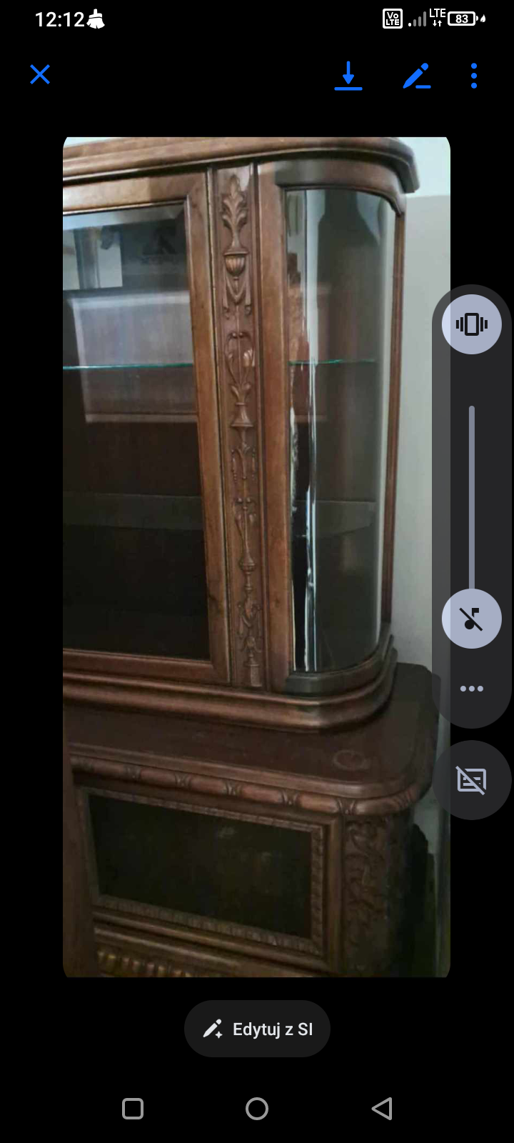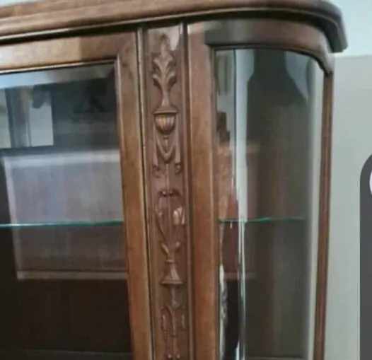 Widoczne na zdjęciu meble to kredensy i witryna w stylu Art Deco, datowane prawdopodobnie na lata 40 lub 50. XX wieku, wykonane z forniru orzechowego. Ten styl charakteryzuje się opływowymi kształtami i...