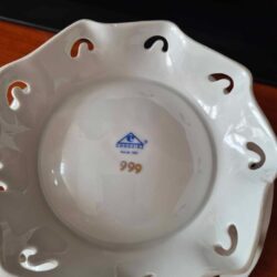 Przedmiotem jest spodek lub tacka z porcelany misnienskiej (Meissen), charakteryzujacy sie sygnatura w postaci dwoch skrzyzowanych mieczy, jednego z najstarszych znakow firmowych na swiecie. Manufaktura porcelany w Misni, zalozona w...