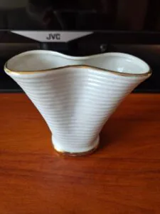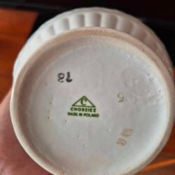 Wazoniki ,lata 50-te ubiegłego wieku. Stan jak na zdjęciach. Turkusowy ma na spodzie rysę,ale jest rzadszy niż brązowy.Poza tym piękny stan zachowania. Brązowy bez zarzutu- brak jakichkolwiek wyszczerbień,pęknięć,ubytków. Wazony ręcznie...