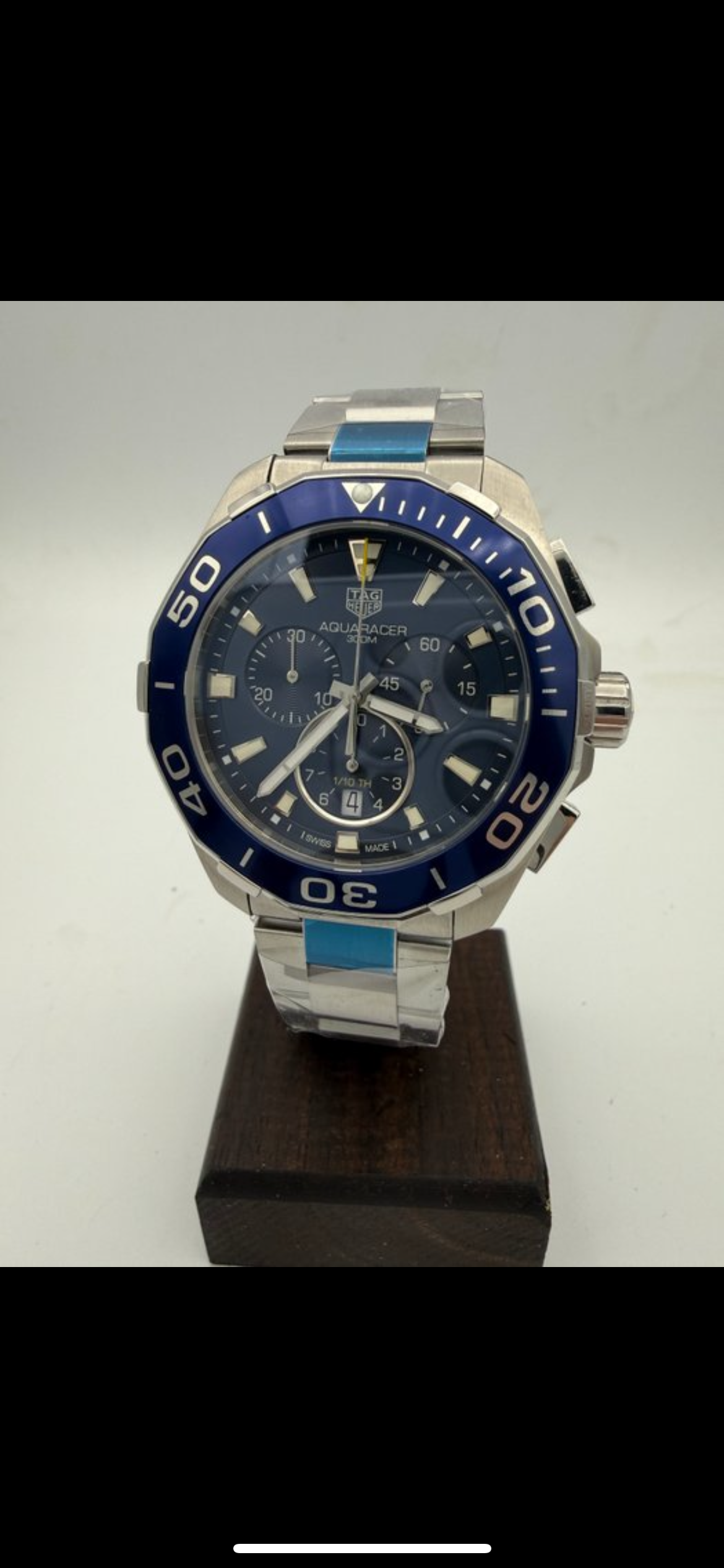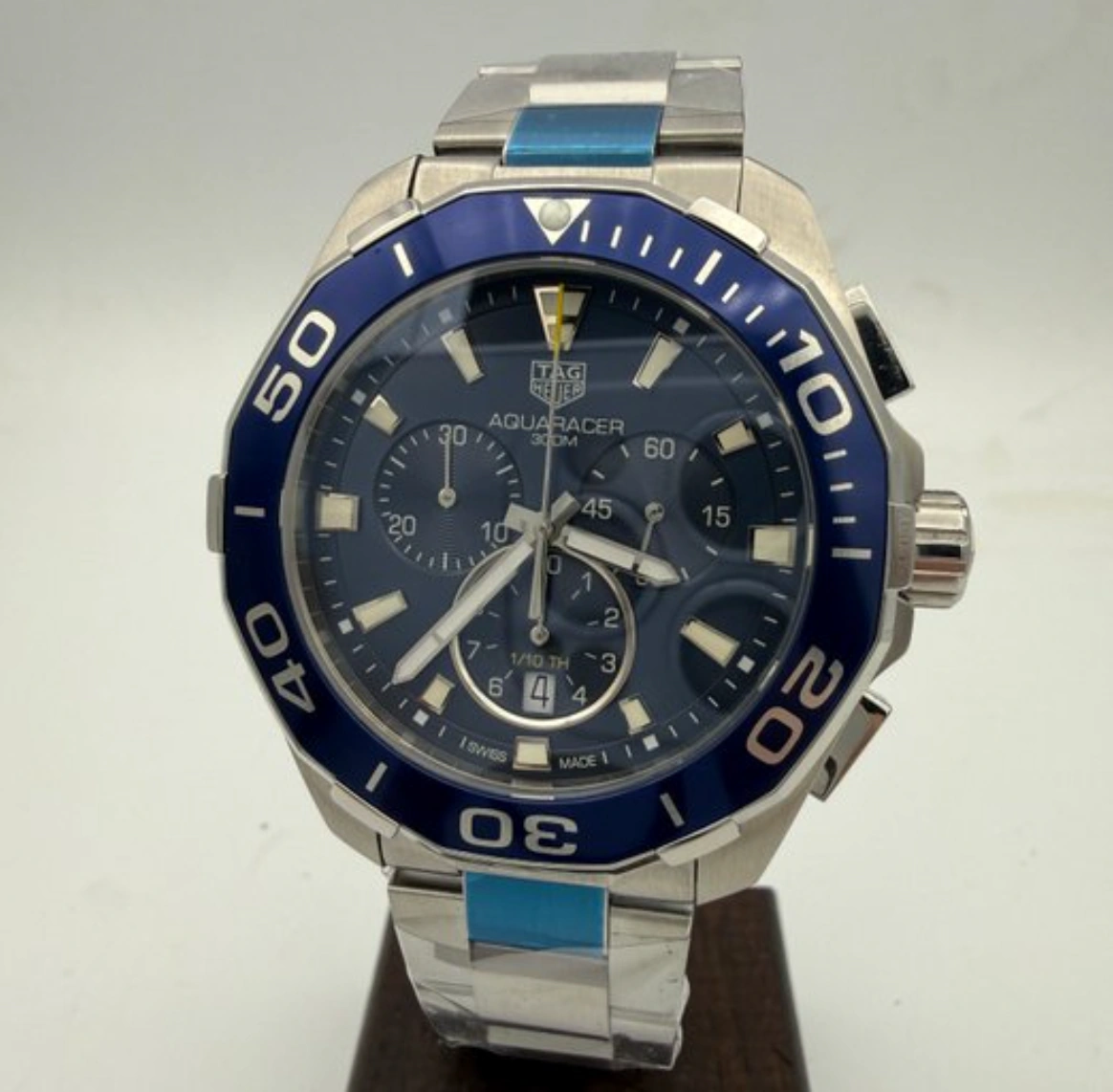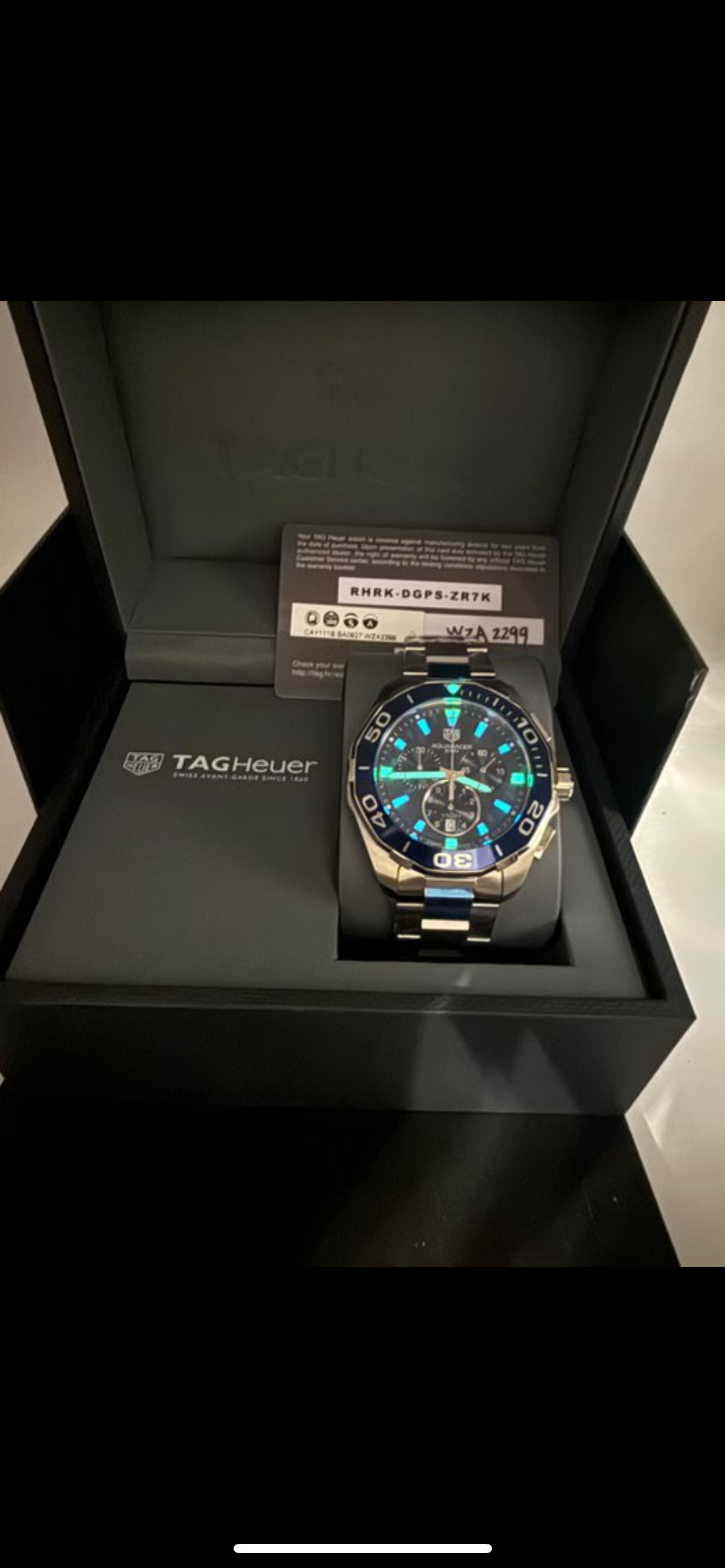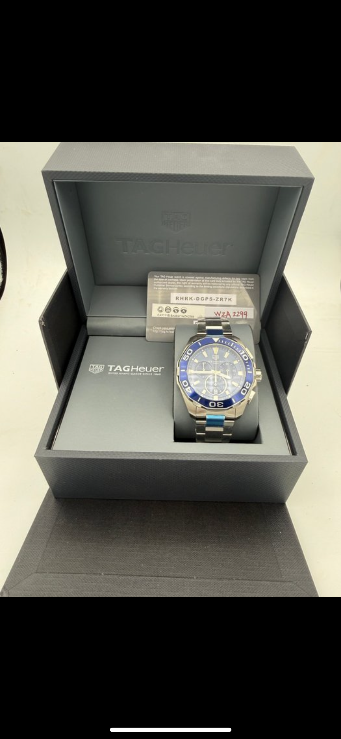 TAG Heuer Aquaracer Chronograph . Na sprzedaż posiadam zegarek szwajcarskiej marki TAG Heuer z kultowej serii Aquaracer Chronograph. Zegarek jest fabrycznie nowy, nigdy nie noszony — posiada jeszcze folie ochronne na bransolecie