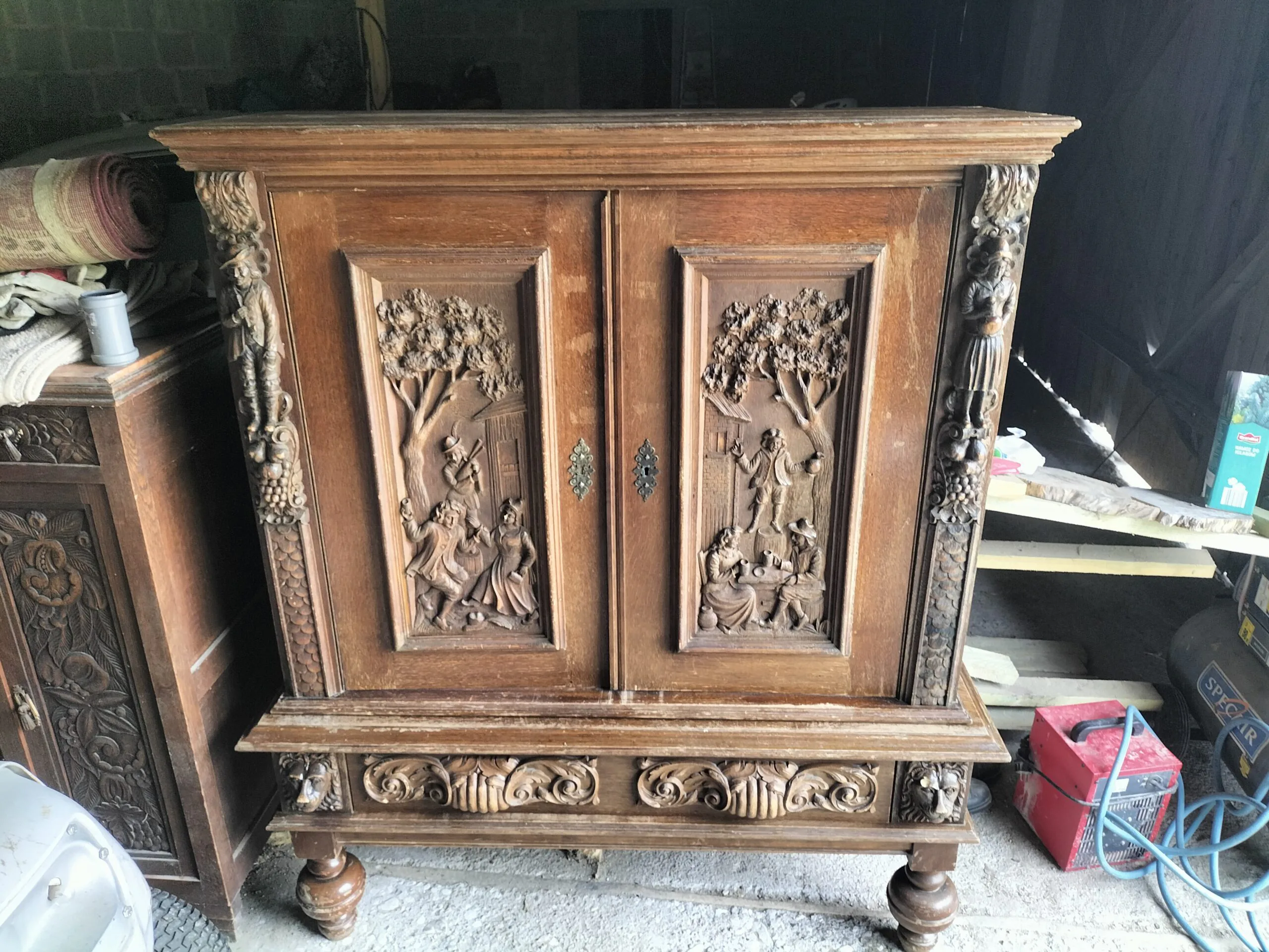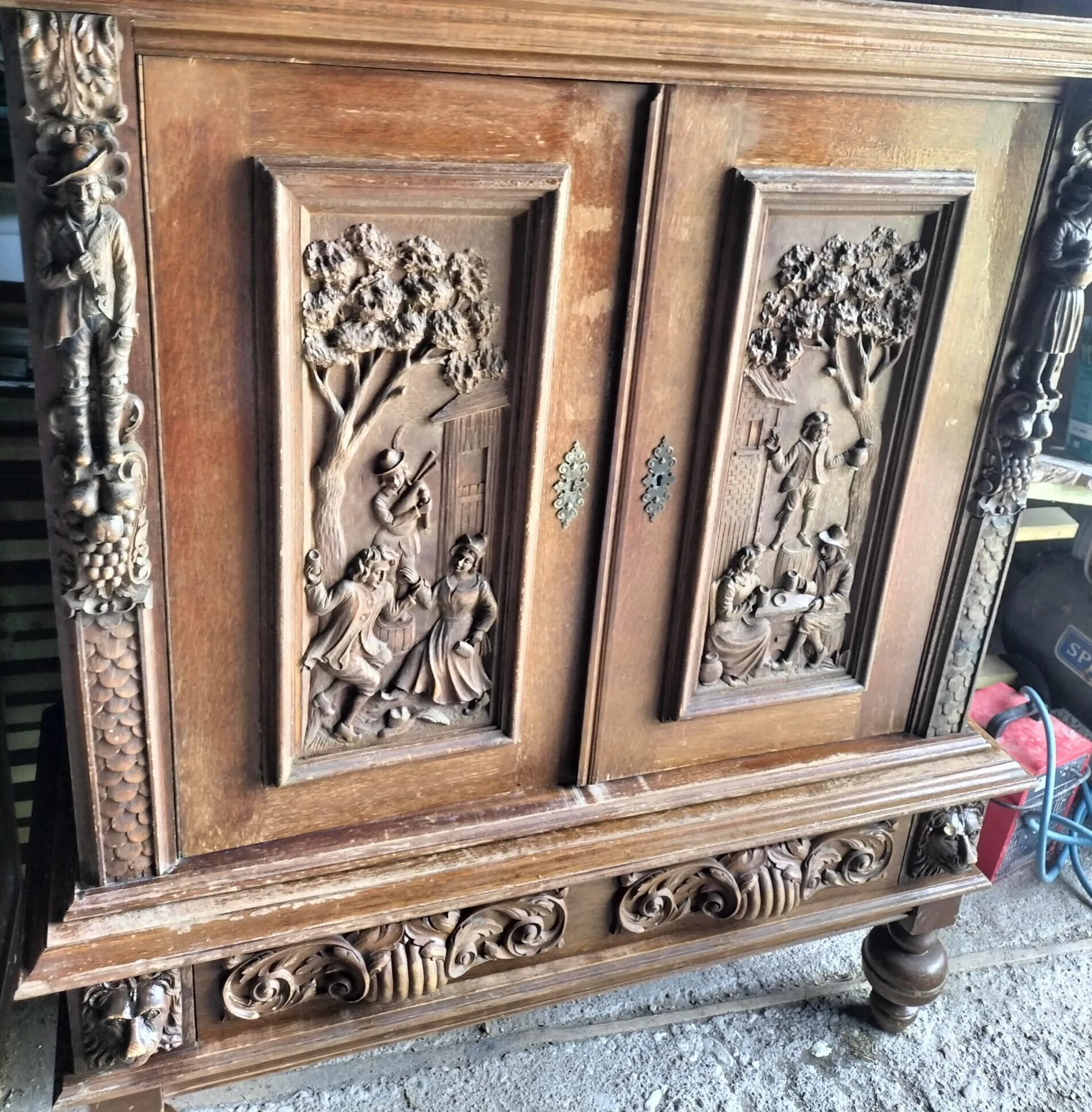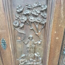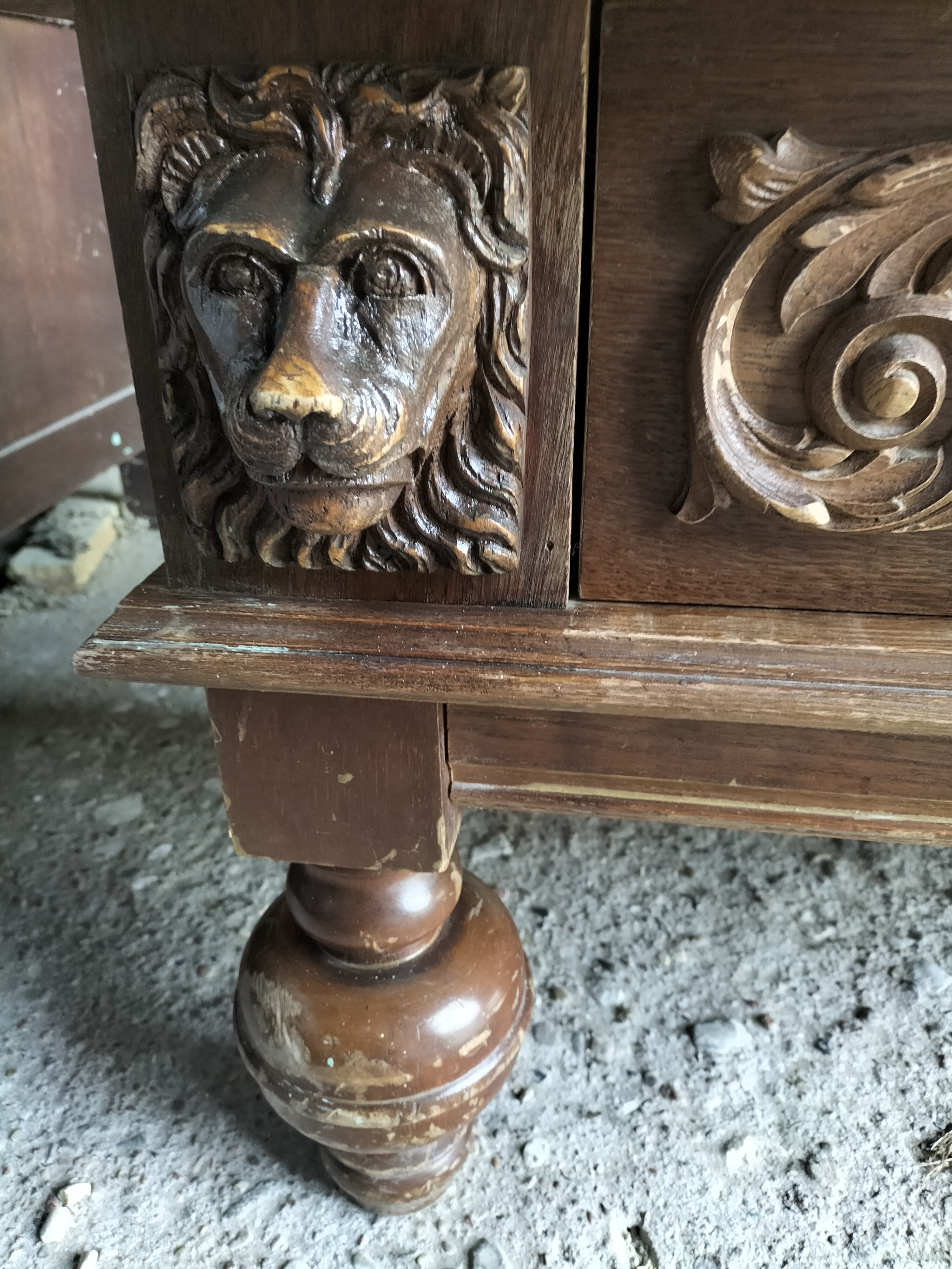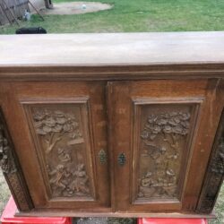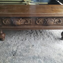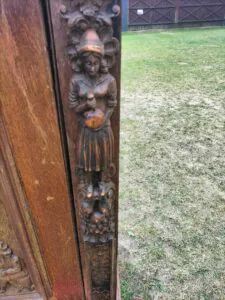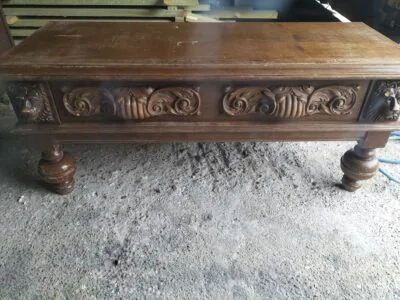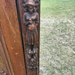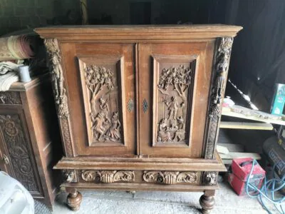 Wspaniała XIX -wieczna szafka w stylu francuskiego renesansu,bogato rzeźbiona z litego orzecha włoskiego. Ten imponujący mebel charakteryzuje się głęboko rzeźbionymi panelami,motywami dekoracyjnymi i eleganckimi detalami. Oparta na solidnych rzeźbionych nogach i wykończona misternymi sztukateriami,ta szafka to wyrazisty element, który wnosi historyczne francuskie rzemiosło do każdego wnętrza. Idealna do salonu,przedpokoju, biblioteki lub jako efektowny punkt centralny butiku lub przestrzeni komercyjnych. Rzadki i pełen charakteru mebel,który łączy funkcjonalność z dekoracyjnością. Niestety z biegiem lat został naznaczony „użytkowaniem ludzkim” i nadaje się do renowacji blatów jak widać na zdjęciach oraz lewych drzwiczek (zawiasy). ZDOBIONA SZAFA. Wysokość 149, szerokość 131 głębokość 50