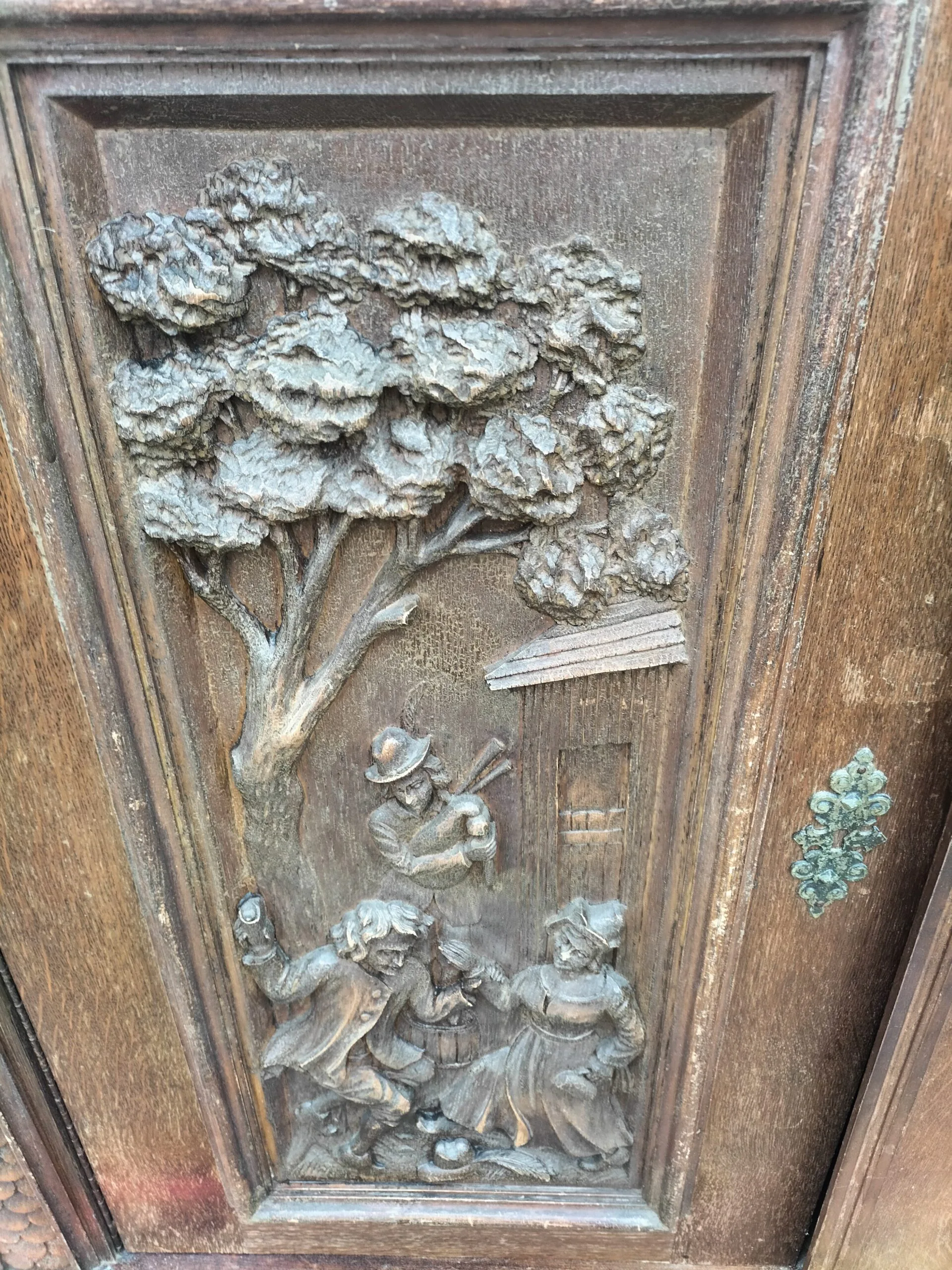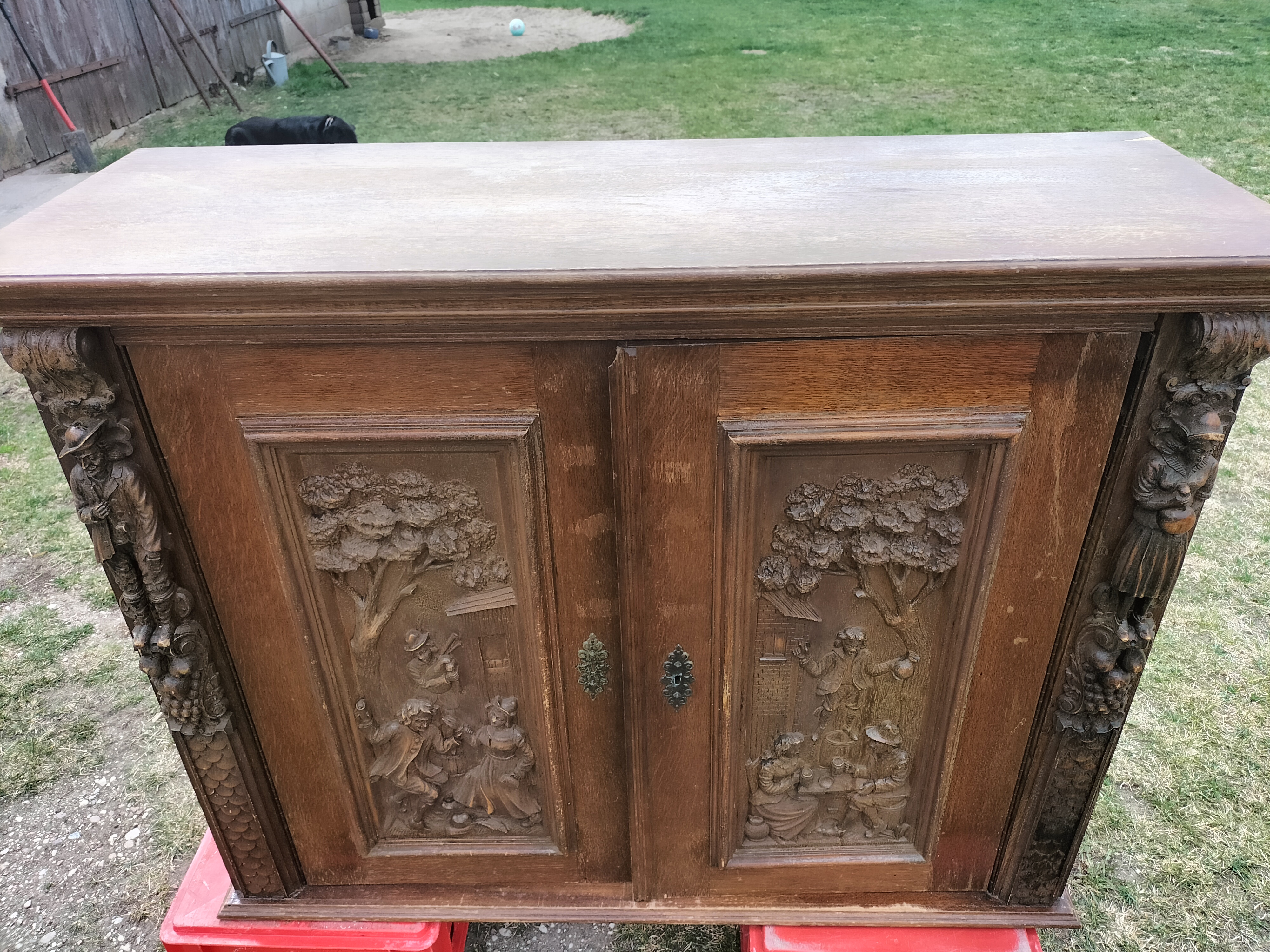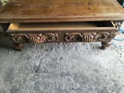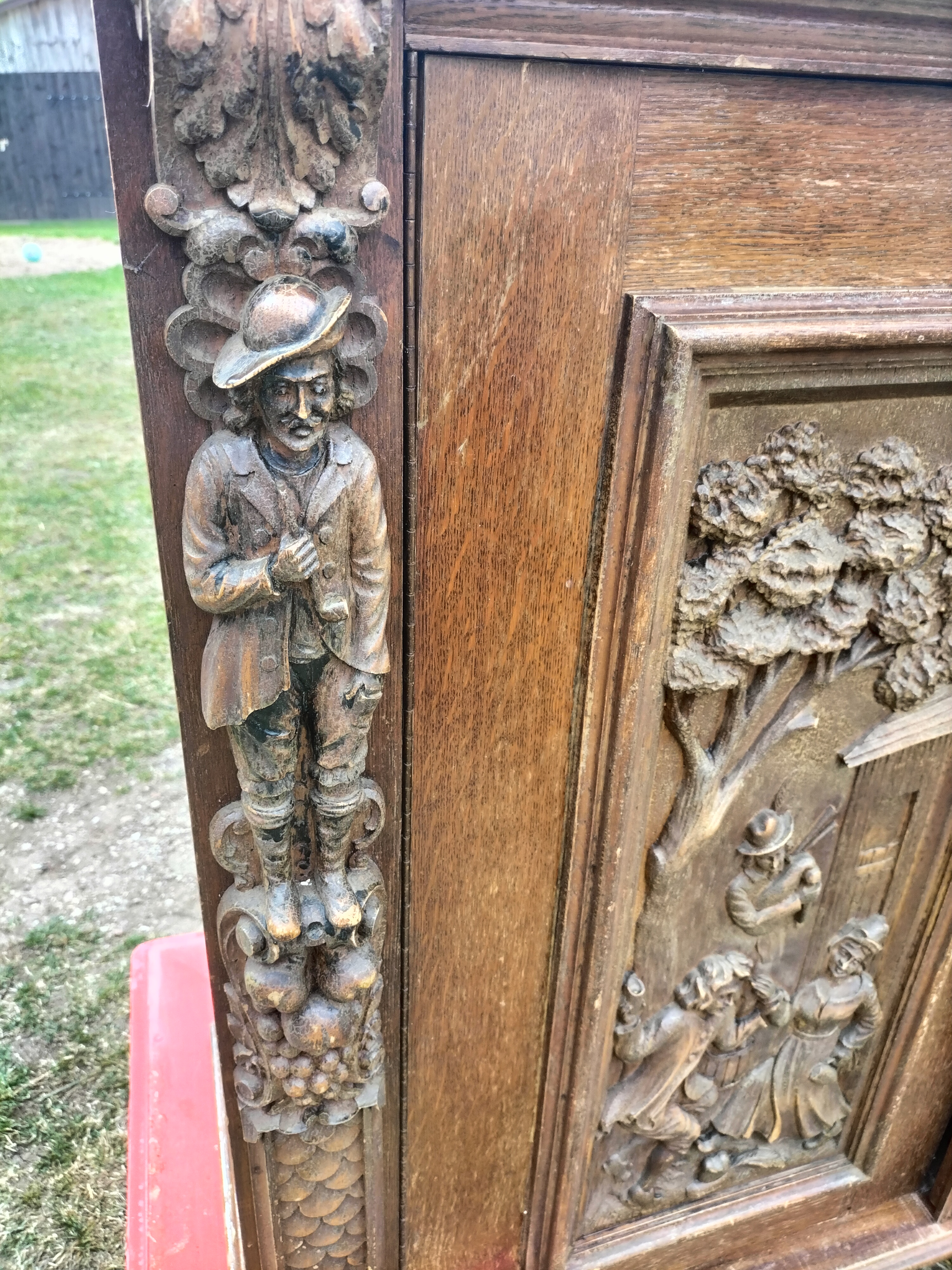 Wspaniała XIX -wieczna szafka w stylu francuskiego renesansu,bogato rzeźbiona z litego orzecha włoskiego. Ten imponujący mebel charakteryzuje się głęboko rzeźbionymi panelami,motywami dekoracyjnymi i eleganckimi detalami. Oparta na solidnych rzeźbionych nogach i wykończona misternymi sztukateriami,ta szafka to wyrazisty element, który wnosi historyczne francuskie rzemiosło do każdego wnętrza. Idealna do salonu,przedpokoju, biblioteki lub jako efektowny punkt centralny butiku lub przestrzeni komercyjnych. Rzadki i pełen charakteru mebel,który łączy funkcjonalność z dekoracyjnością. Niestety z biegiem lat został naznaczony „użytkowaniem ludzkim” i nadaje się do renowacji blatów jak widać na zdjęciach oraz lewych drzwiczek (zawiasy). ZDOBIONA SZAFA. Wysokość 149, szerokość 131 głębokość 50