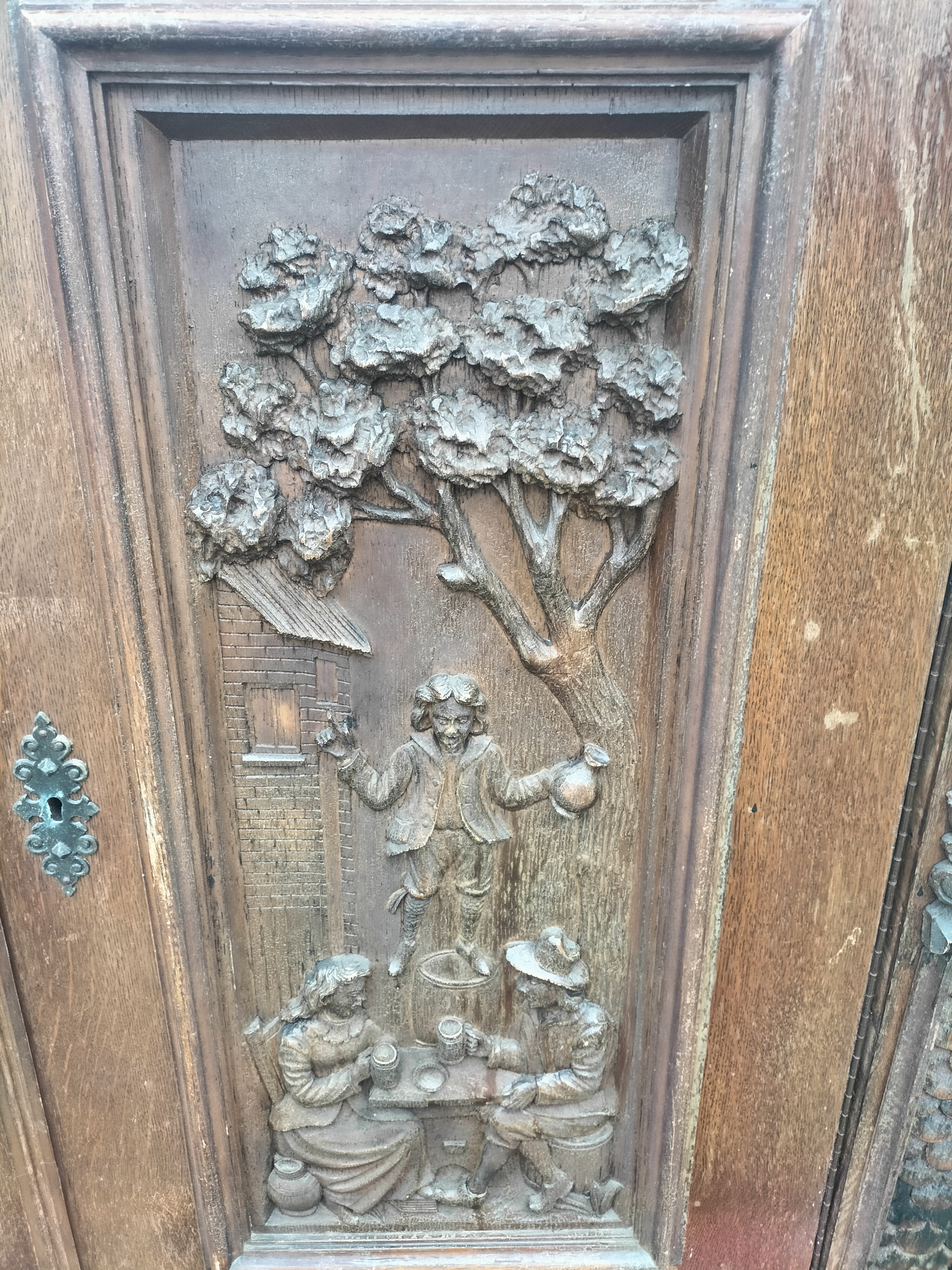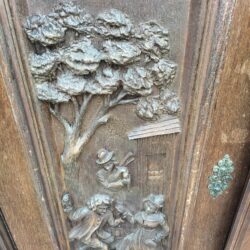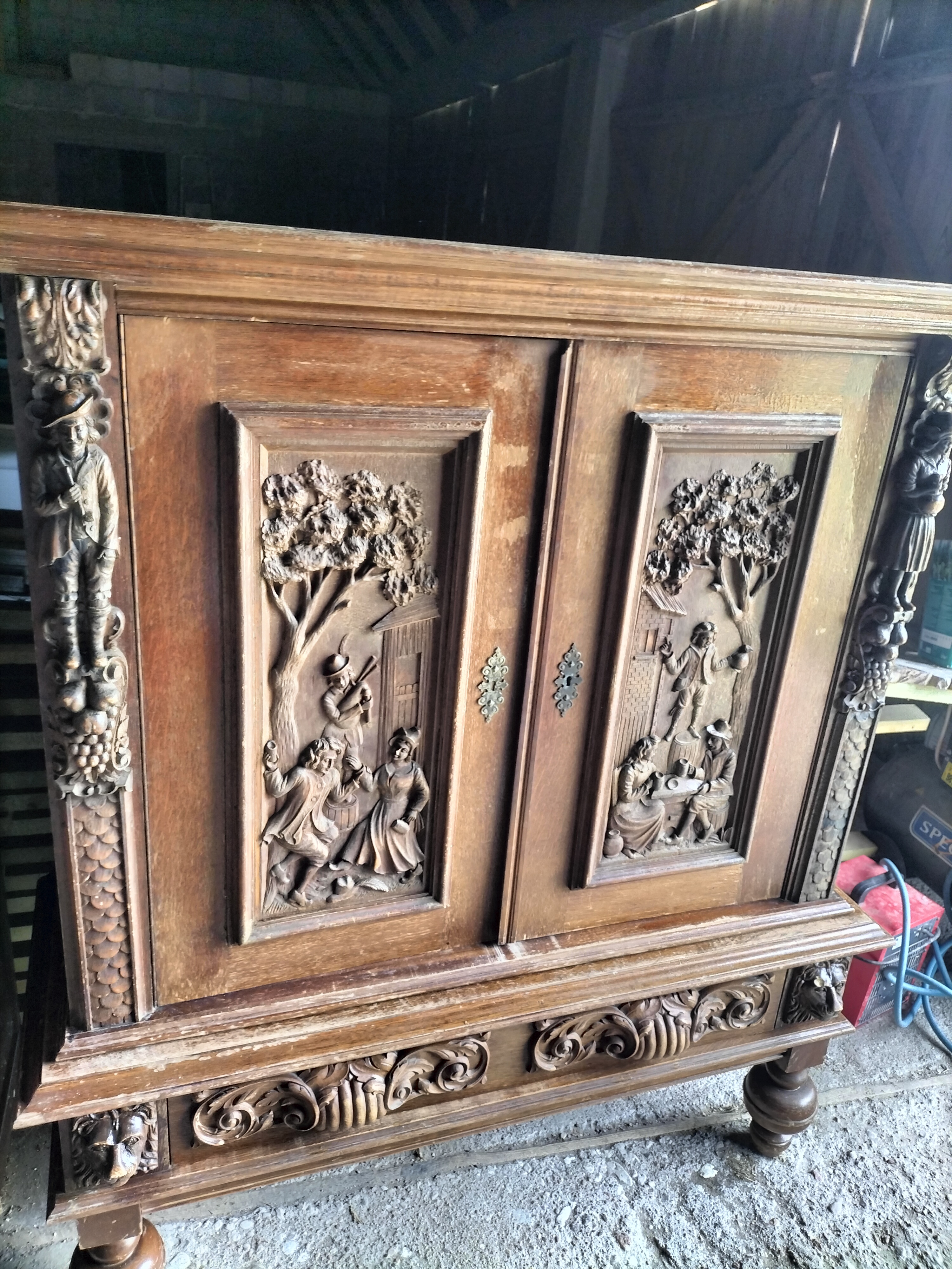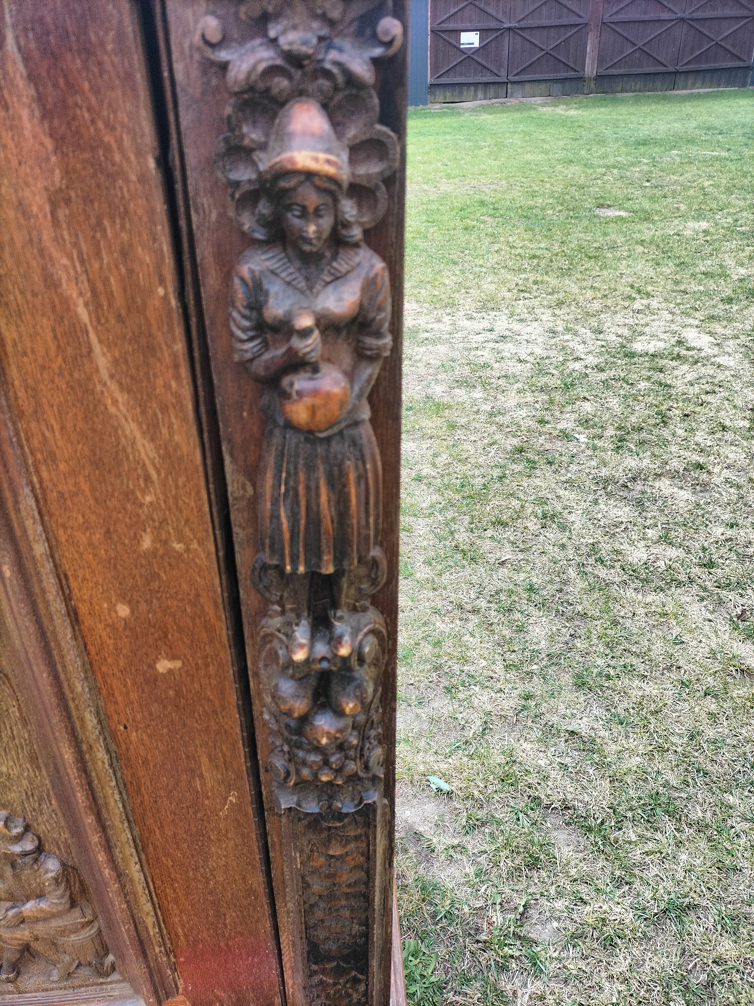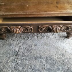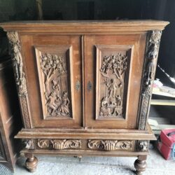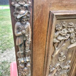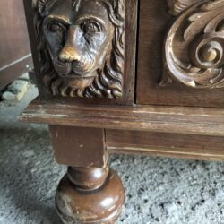 Wspaniała XIX -wieczna szafka w stylu francuskiego renesansu,bogato rzeźbiona z litego orzecha włoskiego. Ten imponujący mebel charakteryzuje się głęboko rzeźbionymi panelami,motywami dekoracyjnymi i eleganckimi detalami. Oparta na solidnych rzeźbionych nogach i wykończona misternymi sztukateriami,ta szafka to wyrazisty element, który wnosi historyczne francuskie rzemiosło do każdego wnętrza. Idealna do salonu,przedpokoju, biblioteki lub jako efektowny punkt centralny butiku lub przestrzeni komercyjnych. Rzadki i pełen charakteru mebel,który łączy funkcjonalność z dekoracyjnością. Niestety z biegiem lat został naznaczony „użytkowaniem ludzkim” i nadaje się do renowacji blatów jak widać na zdjęciach oraz lewych drzwiczek (zawiasy). ZDOBIONA SZAFA. Wysokość 149, szerokość 131 głębokość 50
