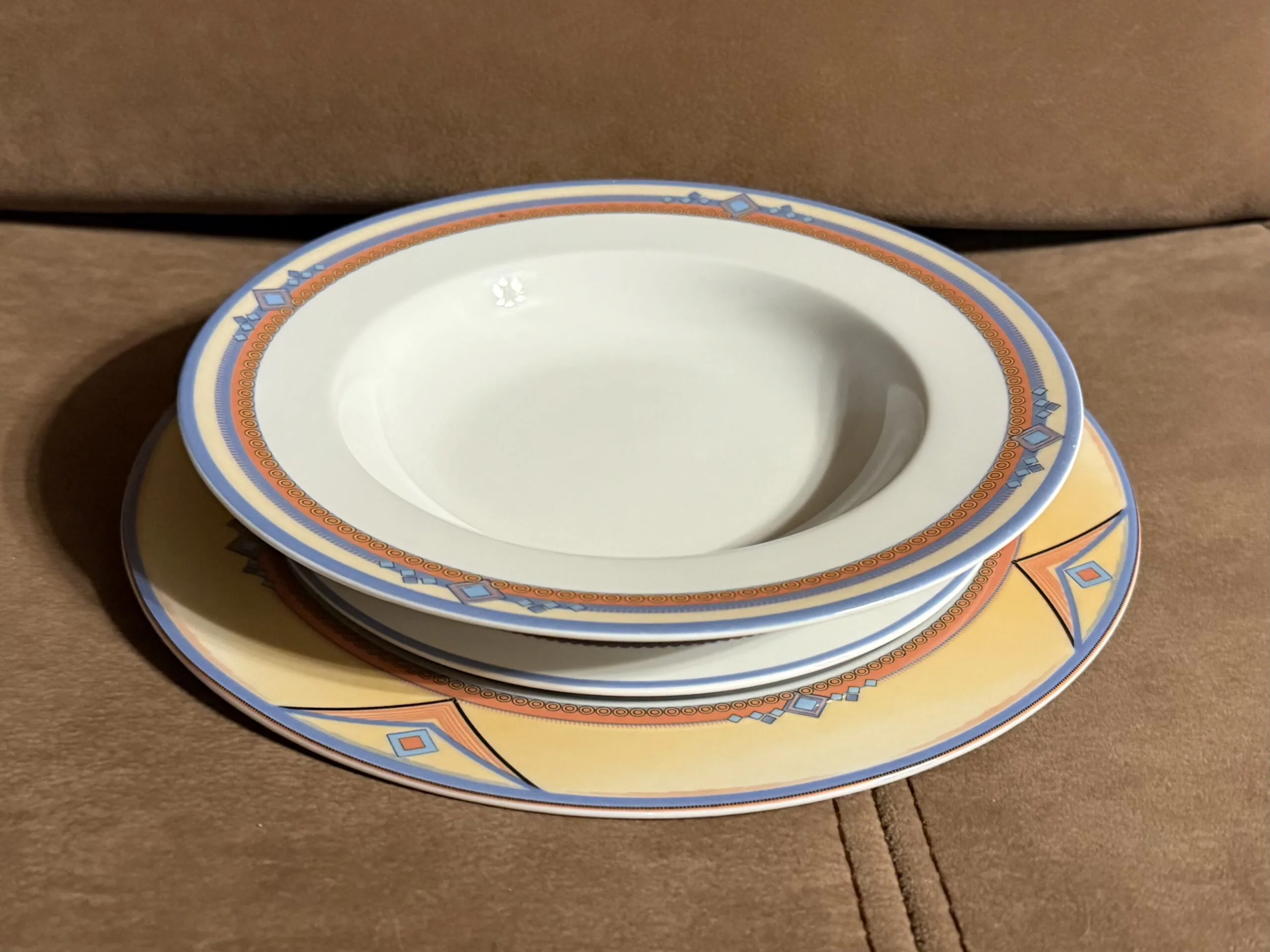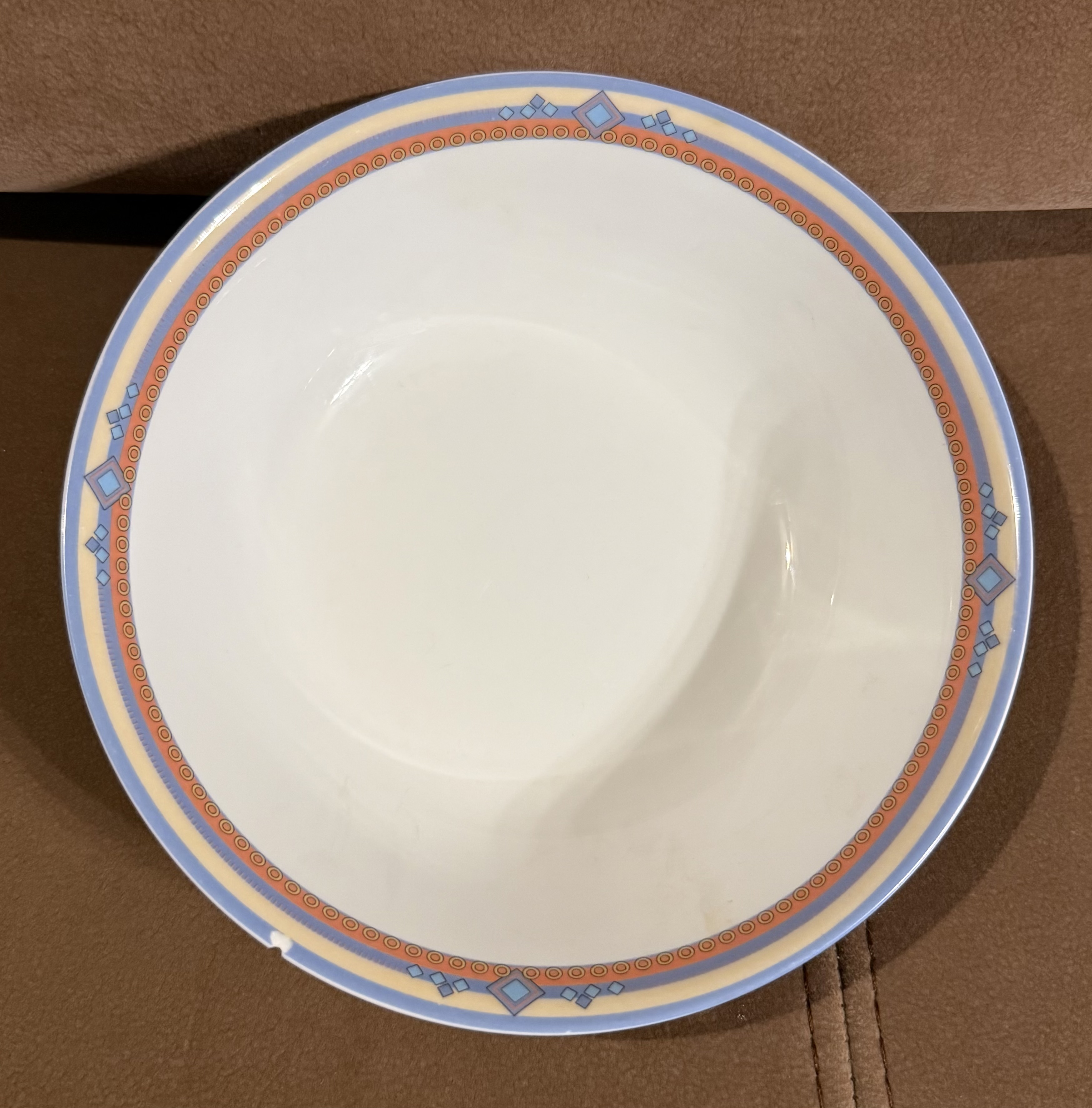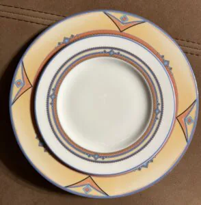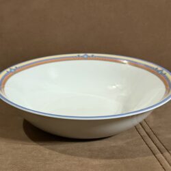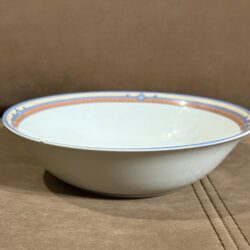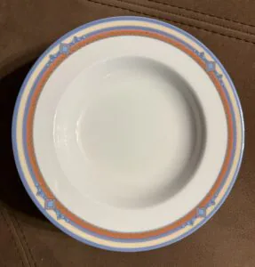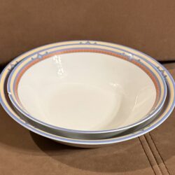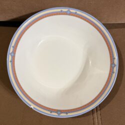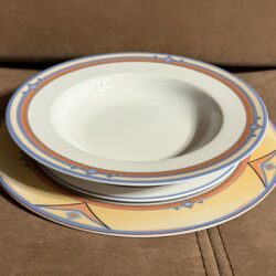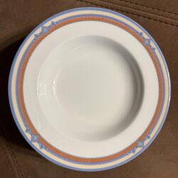 Zastawa stołowa firmy LUBIANA POLAND. Talerz obiadowy : 11 sztuk Talerzyk : 10 sztuk Talerz na zupę : 11 sztuk Waza na zupę bez pokrywki Waza na sos Duża miska Średnia miska Podłużne talerze w trzech rozmiarach. Niektóre elementy są uszczerbione ( jedna z misek, talerz) . Zastawa stołowa Lubiana to polska porcelana produkowana od lat 60. XX wieku w Łubianie koło Kościerzyny. Jest ceniona za połączenie trwałości z nowoczesnym wzornictwem, co sprawia, że sprawdza się zarówno w domach, jak i w profesjonalnej gastronomii (HoReCa).