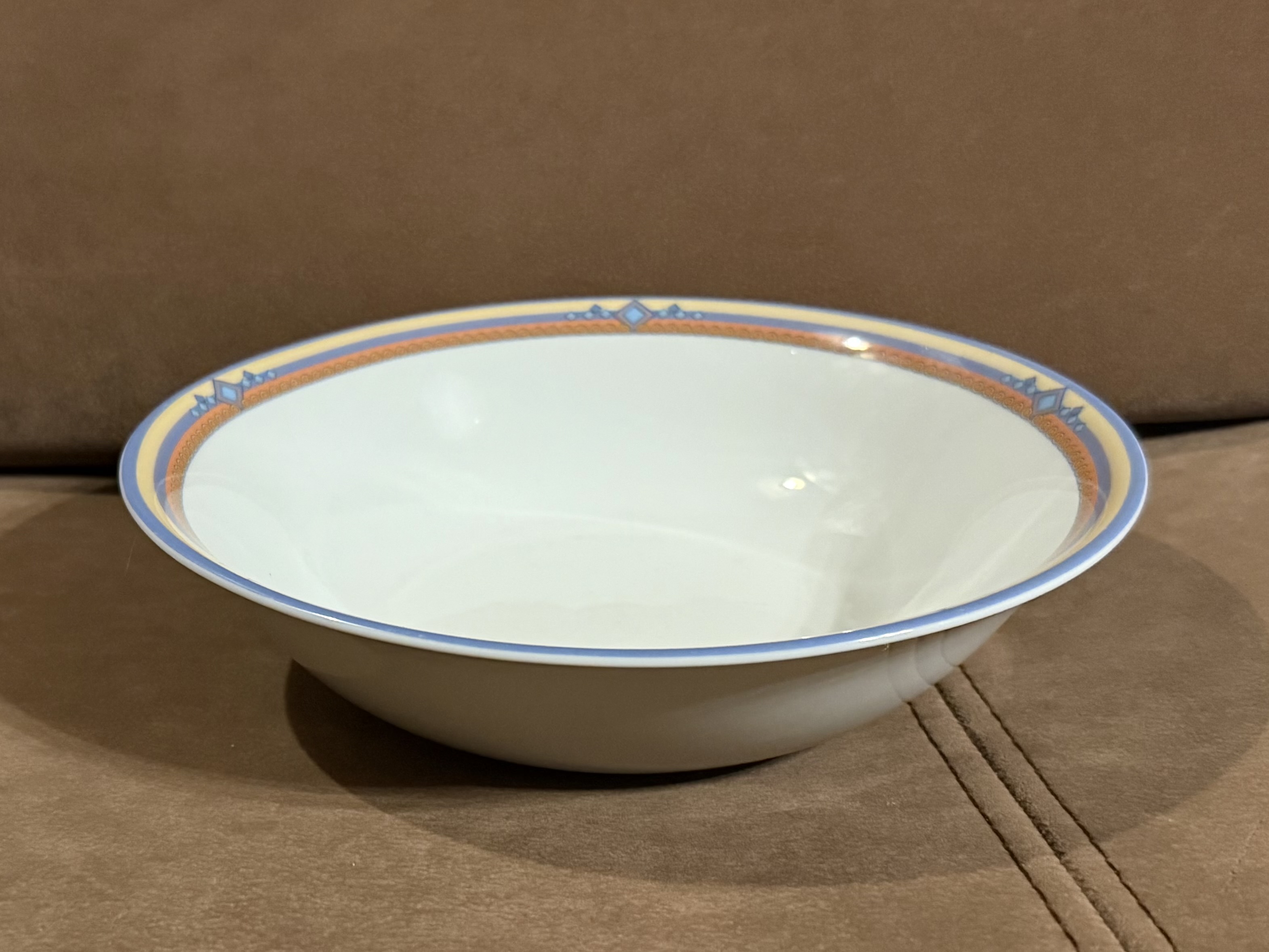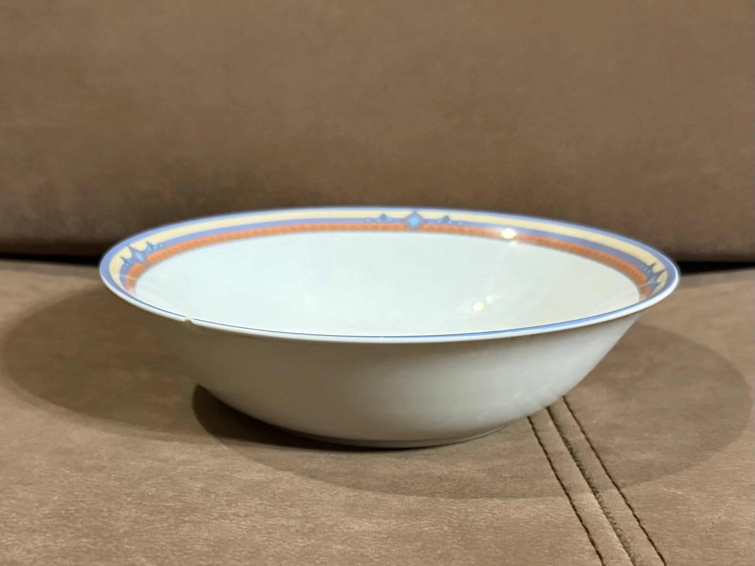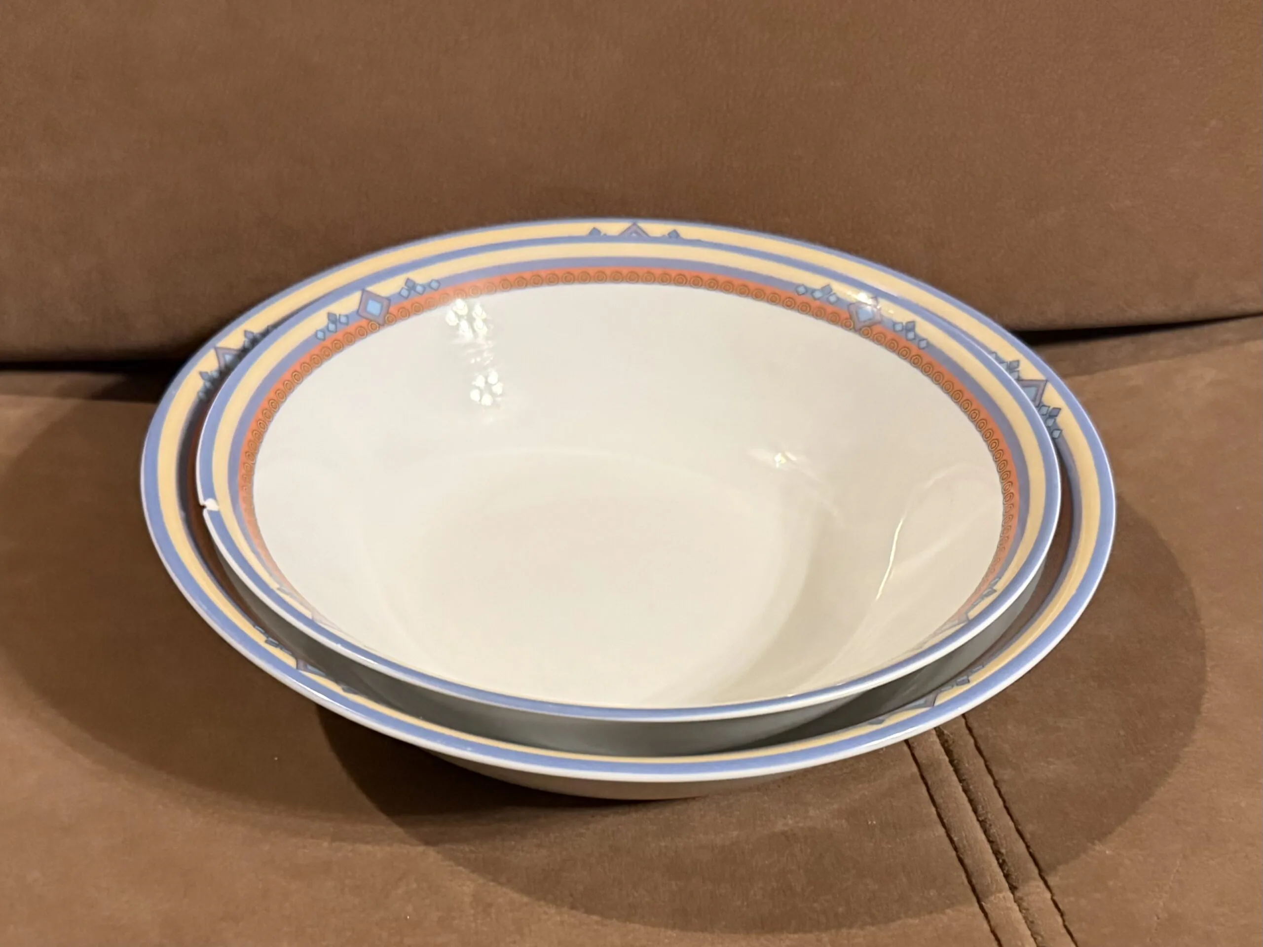 Zastawa stołowa firmy LUBIANA POLAND. Talerz obiadowy : 11 sztuk Talerzyk : 10 sztuk Talerz na zupę : 11 sztuk Waza na zupę bez pokrywki Waza na sos Duża miska Średnia miska Podłużne talerze w trzech rozmiarach. Niektóre elementy są uszczerbione ( jedna z misek, talerz) . Zastawa stołowa Lubiana to polska porcelana produkowana od lat 60. XX wieku w Łubianie koło Kościerzyny. Jest ceniona za połączenie trwałości z nowoczesnym wzornictwem, co sprawia, że sprawdza się zarówno w domach, jak i w profesjonalnej gastronomii (HoReCa).