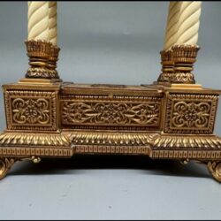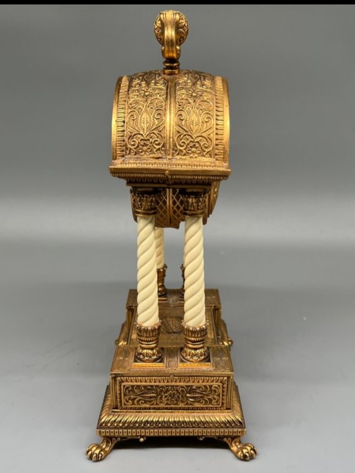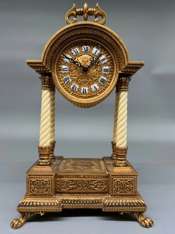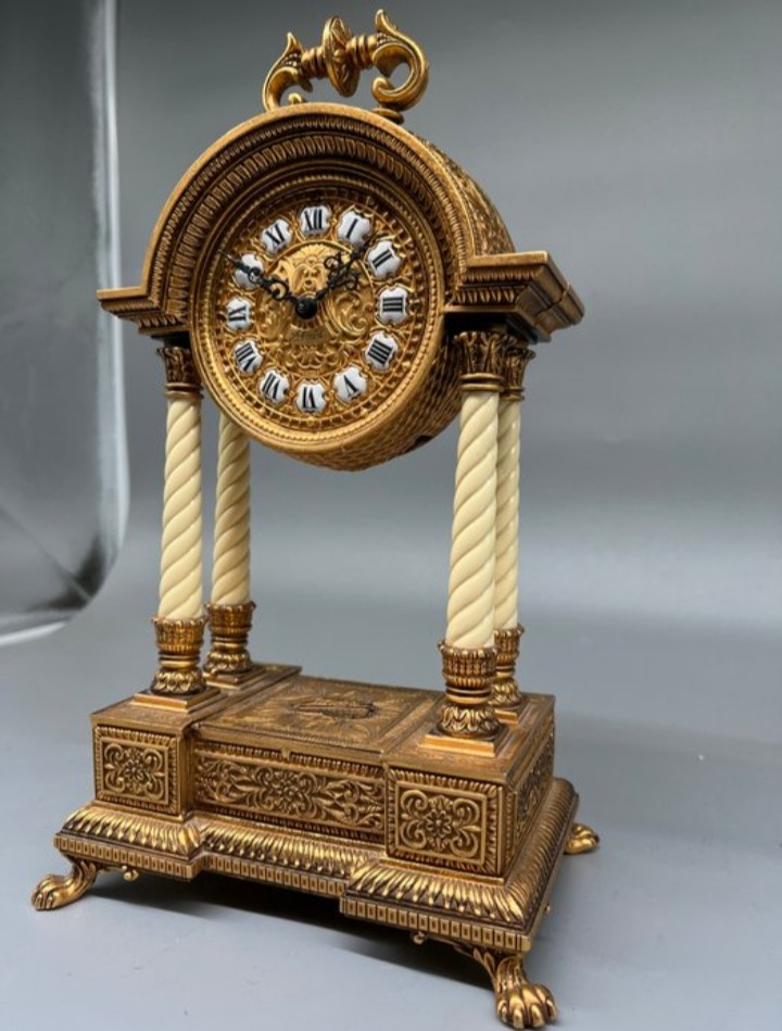 Mechaniczny – mechanizm 8-dniowy. Zegar kominkowy marki Johmi z drugiej połowy XX wieku, wykonany w eleganckim stylu francuskiego romantyzmu. Pozłacana metalowa obudowa zawiera szczegółowe kwiatowe ozdobe, a kolumny w kolorze kości słoniowej imitującej kość słoniową podkreślają klasyczny urok. Precyzyjnie wykonana tarcza z cyframi rzymskimi i delikatnymi wskazówkami harmonijnie komponuje się z całością. Dzięki kompaktowym wymiarom 33 cm wysokości, 18 cm szerokości i 12 cm głębokości zegar ten idealnie nadaje się jako dekoracyjna atrakcja do mniejszych pomieszczeń lub witryn.Mechaniczny mechanizm zegarowy został przetestowany, jest w pełni funkcjonalny i reprezentuje wysoką jakość wykonania.Fascynujący przedmiot dla kolekcjonerów i miłośników romantycznego designu. Jak to rozpoznać.