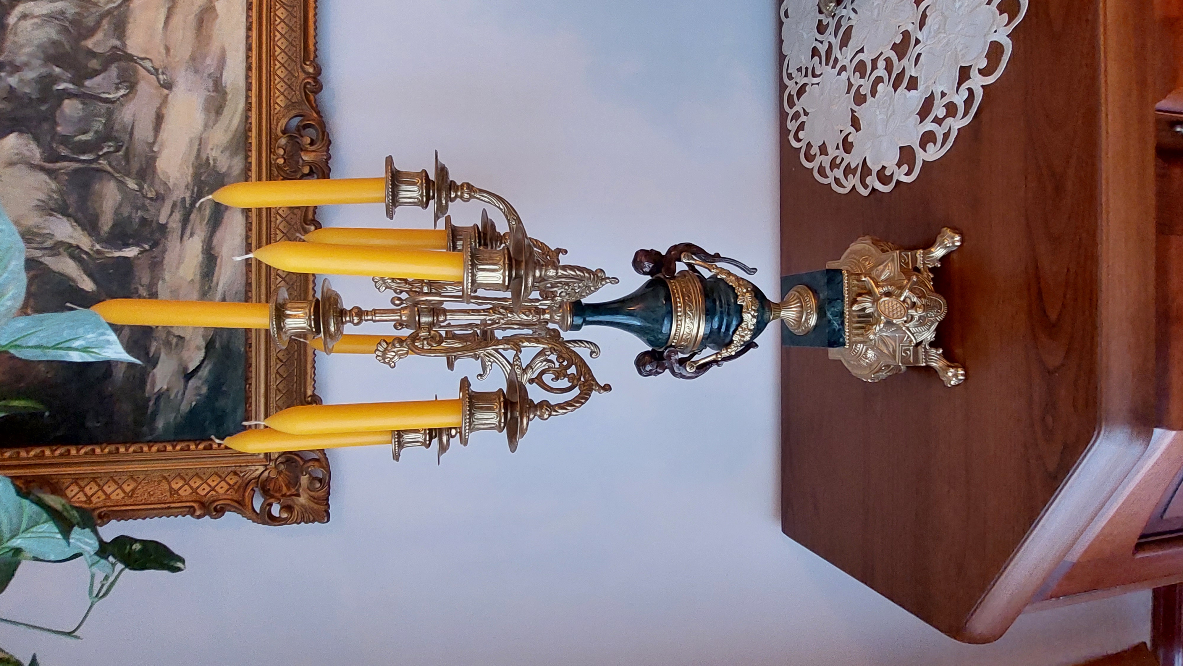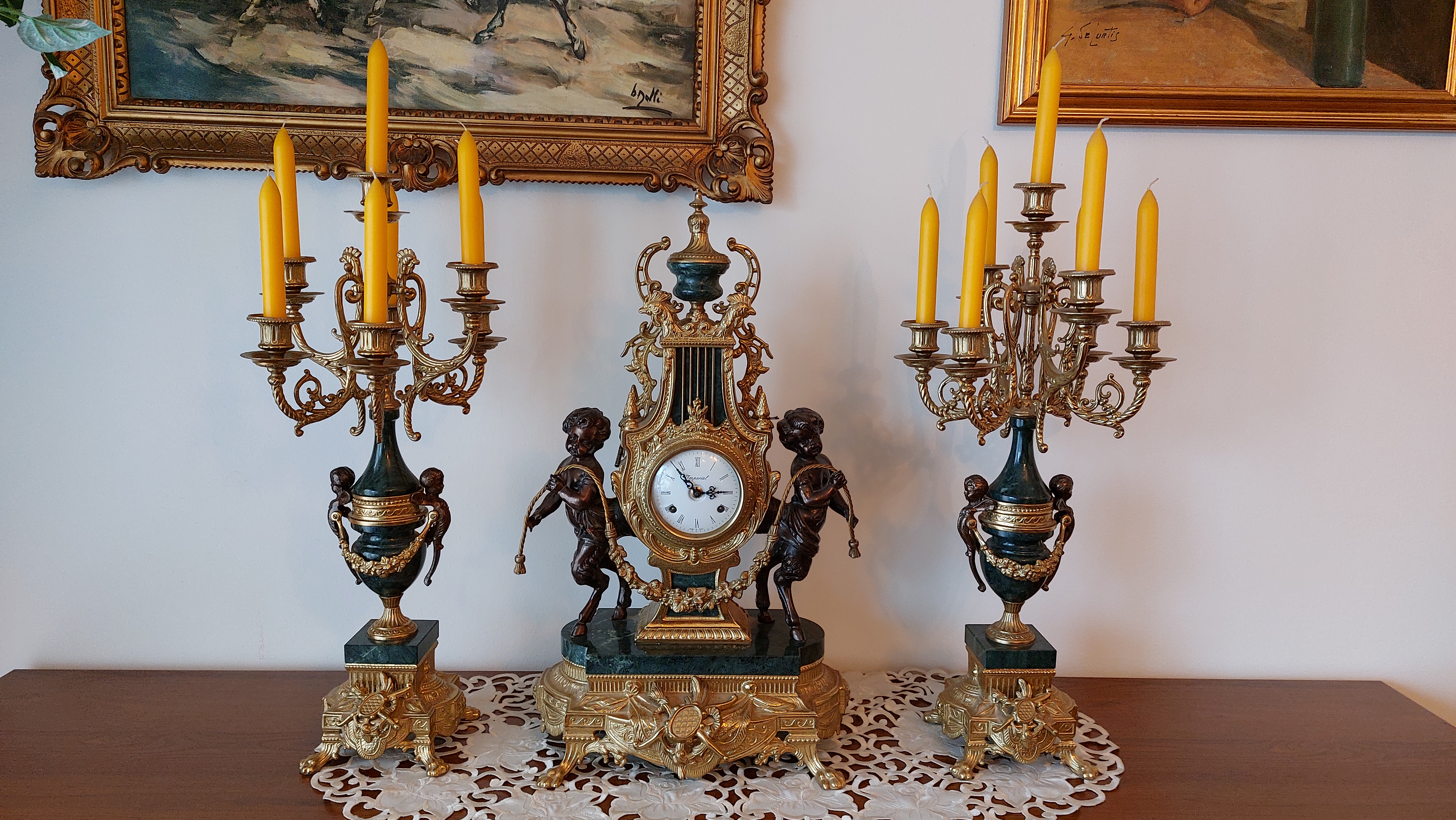 Przedmiotem sprzedaży jest pałacowy duży komplet Zegar z kandelabrami. Kraj pochodzenia Włochy, wykonany w stylu barokowym. Mechanizm sprawny po konserwacji. Wykonany z mosiądzu, z ornamentami z marmuru wraz z ozdobnymi amorkami. Stan bardzo dobry, do postawienia na kominku lub komodzie.