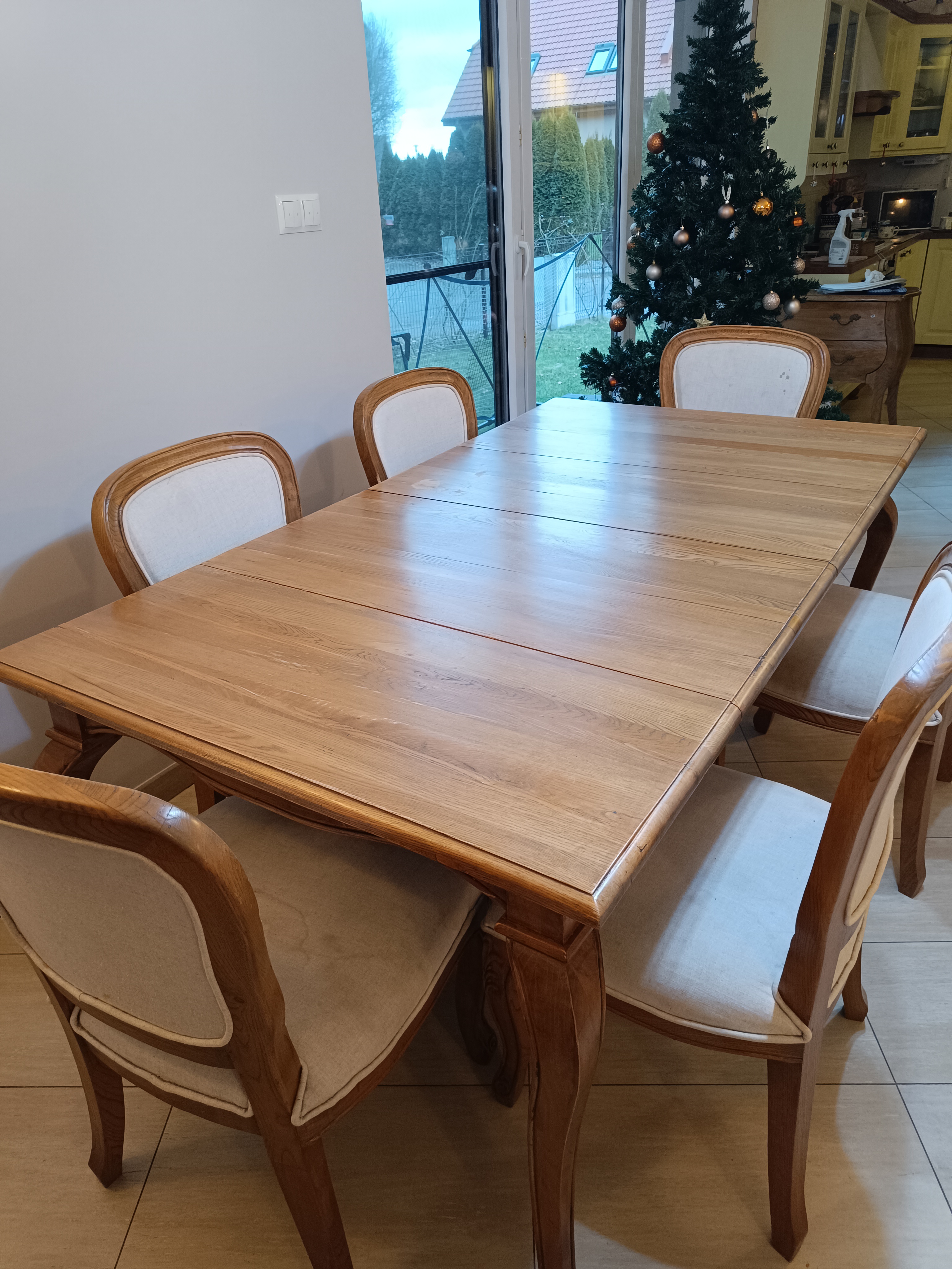 Zestaw mebli stylowych z litego drewna egzotycznego, w tym rozkładany stół 180-220 cm / 100...